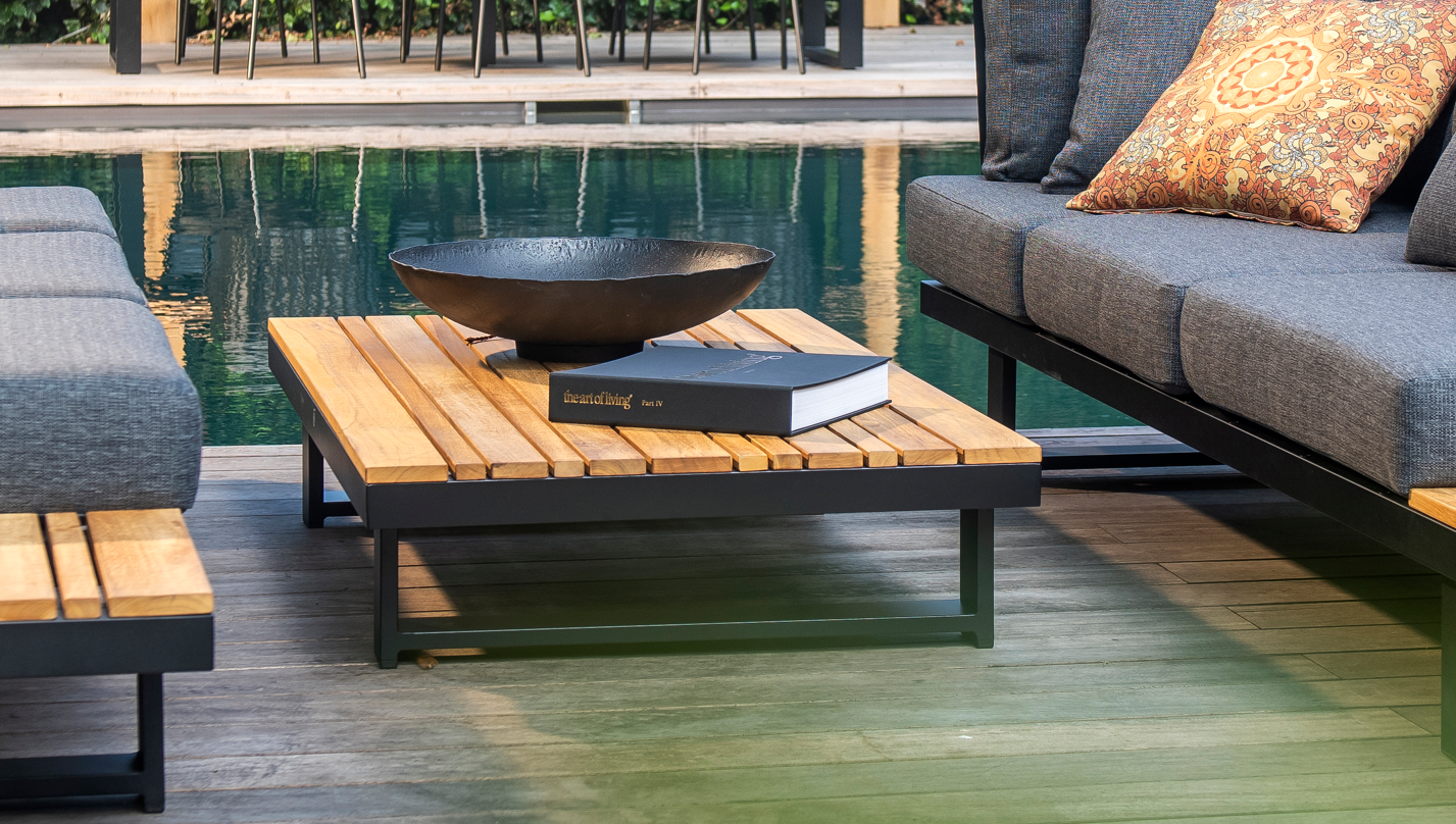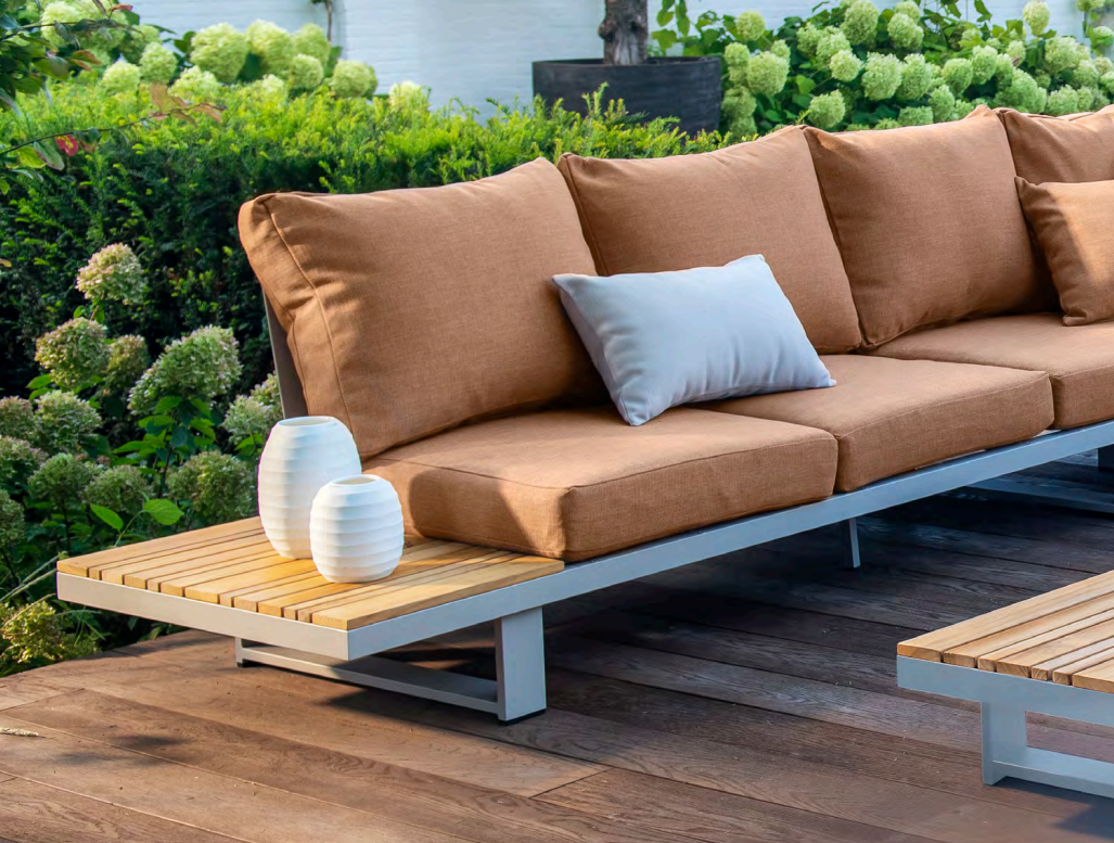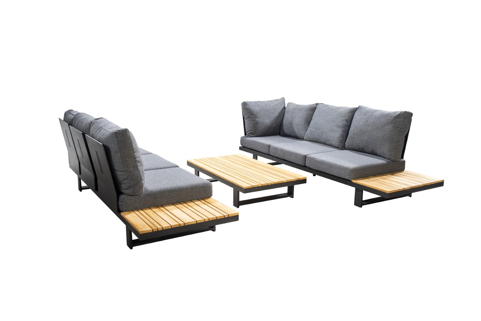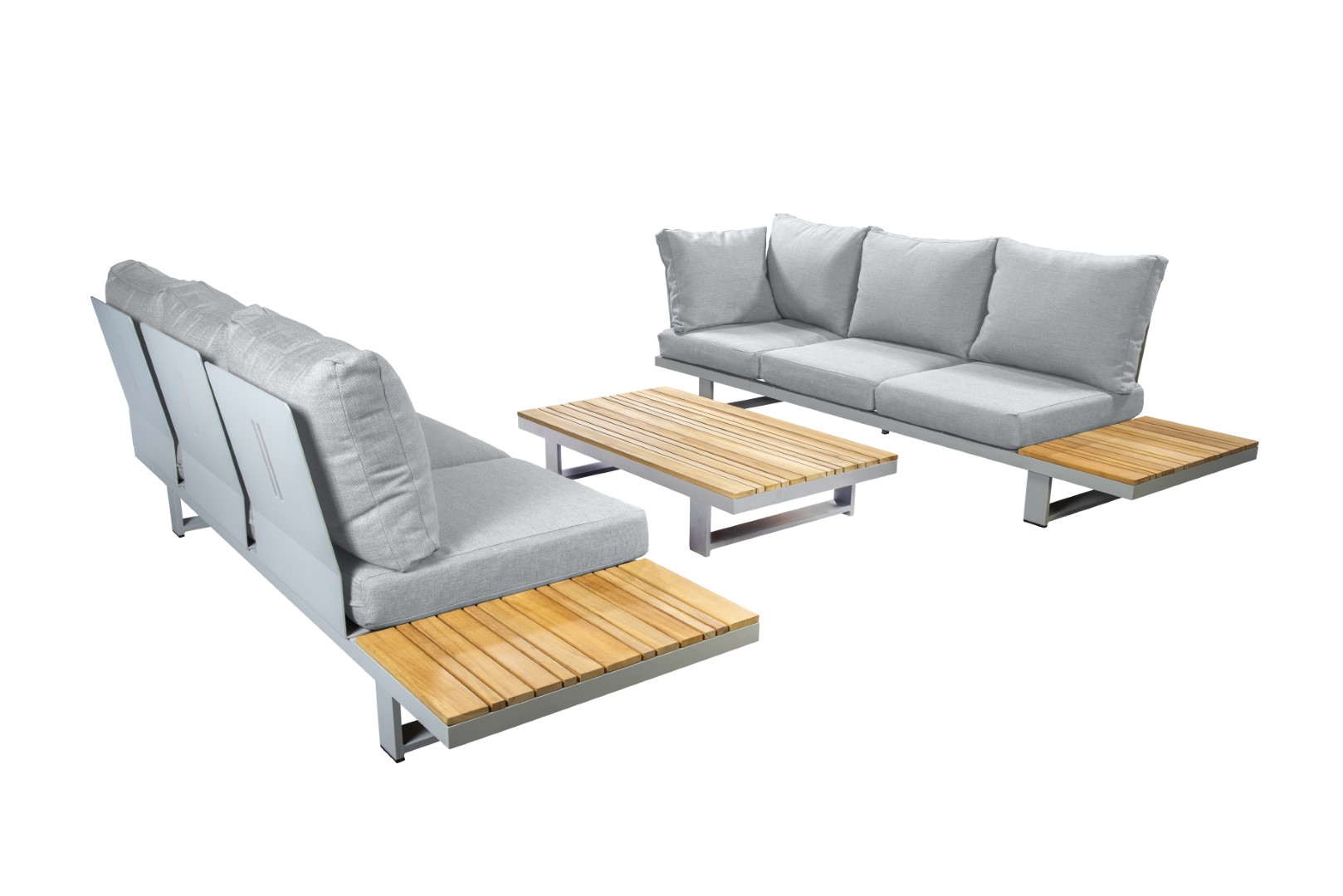 Das Gestell aus pulverbeschichtetem Aluminium sorgt für Stabilität und Langlebigkeit, während die warmen Teakholzdetails dem Ensemble eine natürliche und einladende Note verleihen.