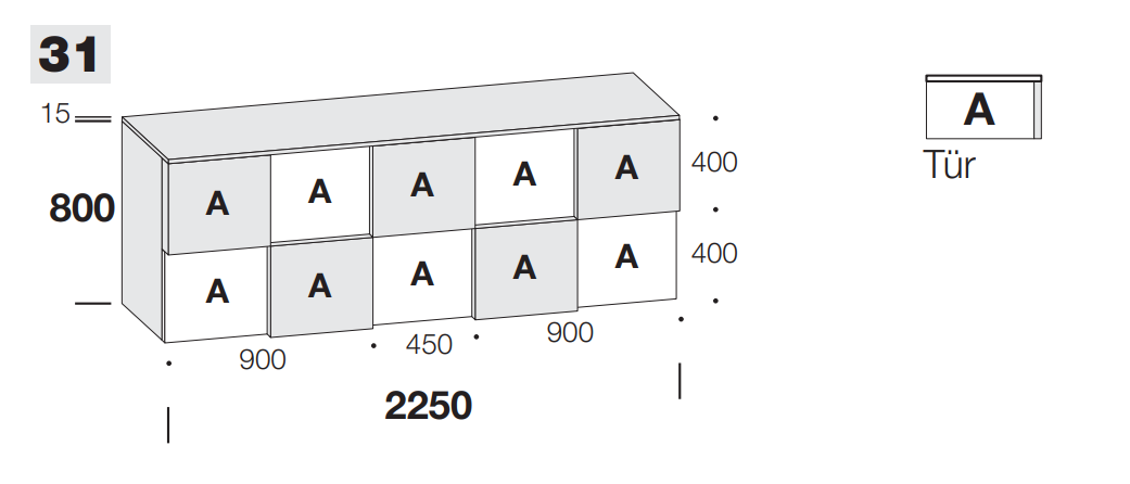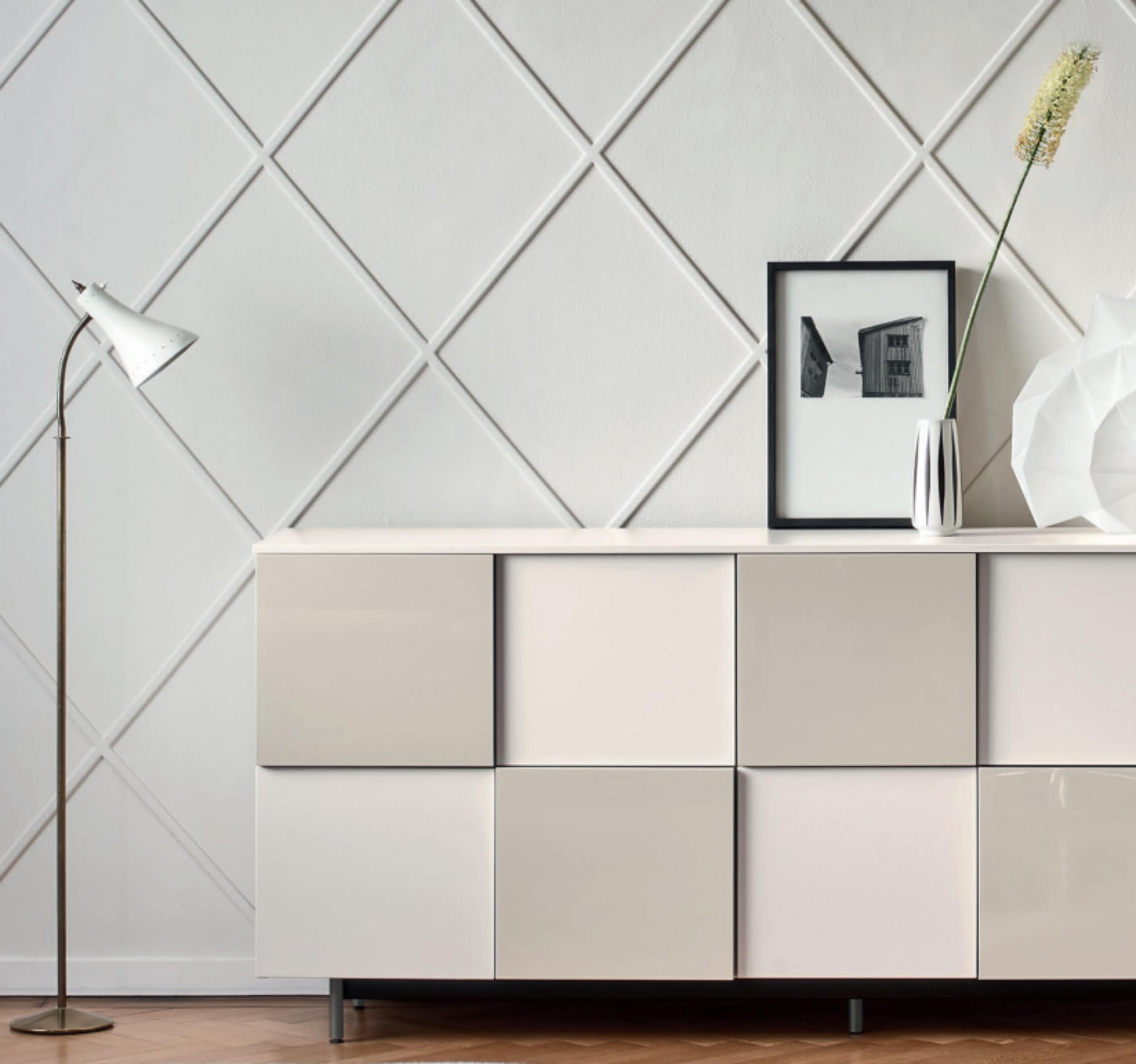 Es bietet viel Stauraum hinter den grafisch angeordneten Türen und Schubladen.