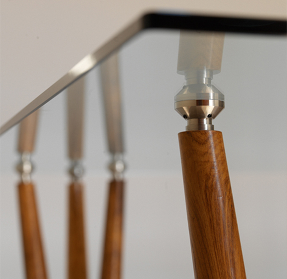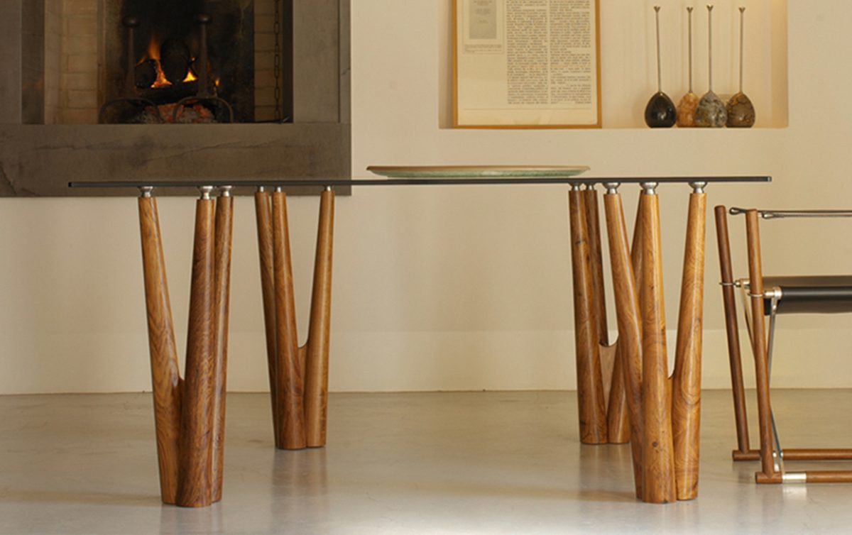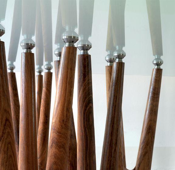 In jedem Fuß gehören die Teile zum selben Baum, so dass Maserungen und Farben miteinander spielen und eine künstliche Laubstruktur erzeugen.