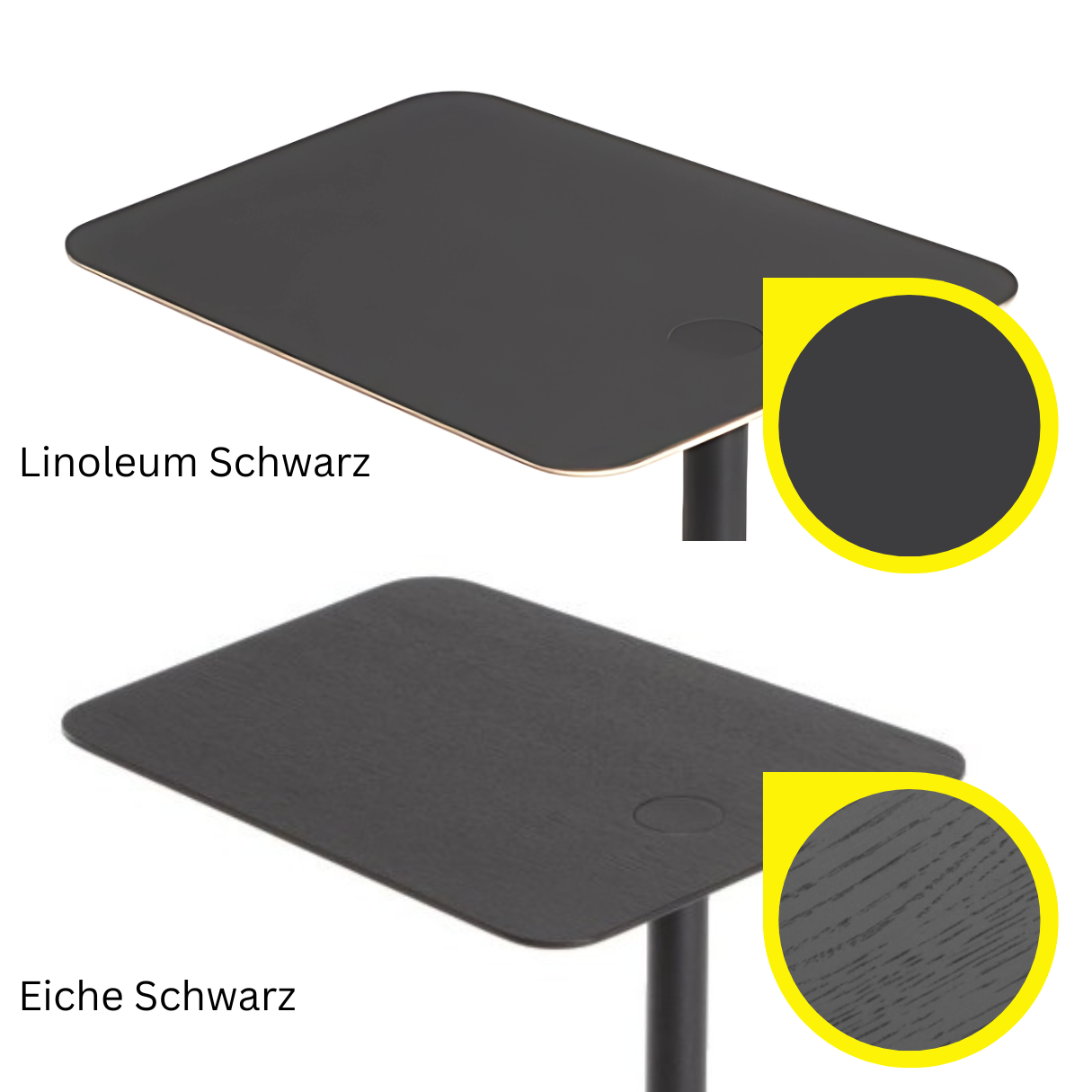 Die Tischplatte ist aus Eichenfurnier gefertigt und erhältlich wahlweise natur oder schwarz lackiert oder Linoleum (natürliches, fußwarmes, glattes, antibakterielles Oberflächenmaterial) in den Farben Nero und Mushroom