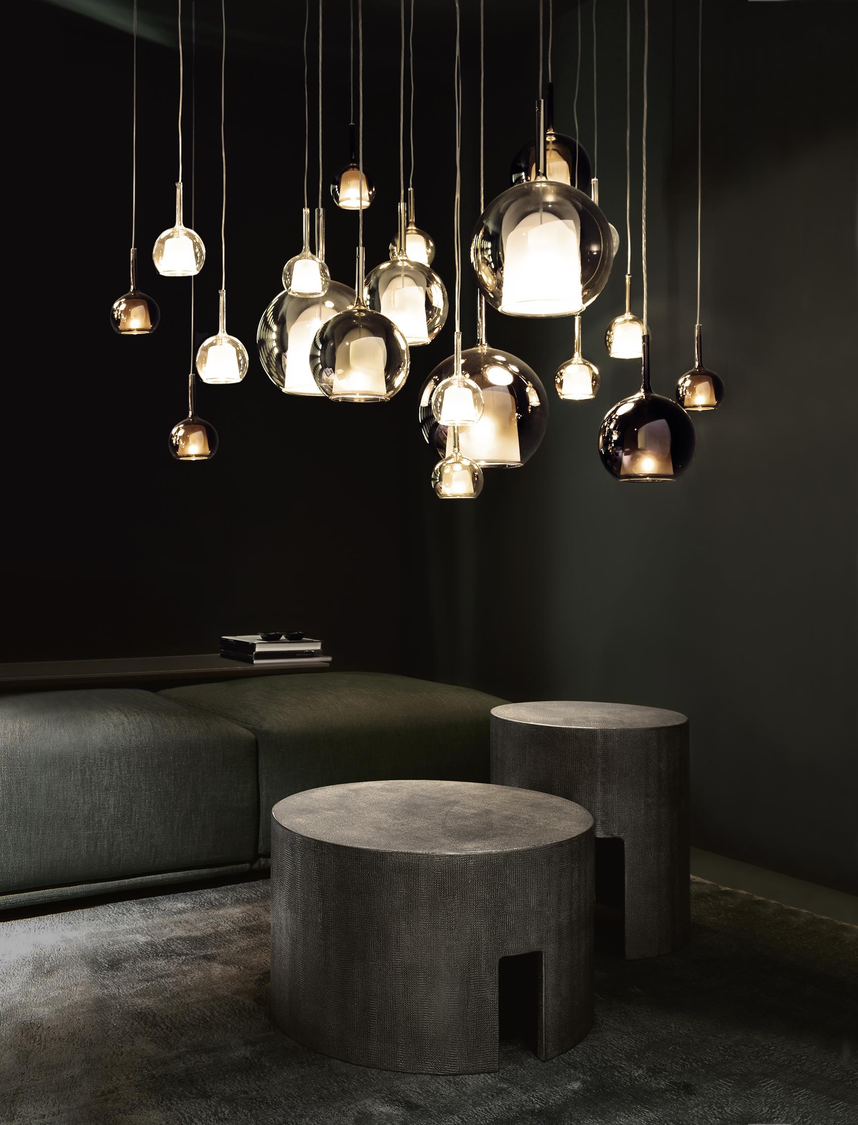 Durch die Kombination von mehreren Glasschirmen zu einer Clusterleuchte wird dieser Effekt noch verstärkt und eindrucksvolle Lichtillusionen entfaltet.