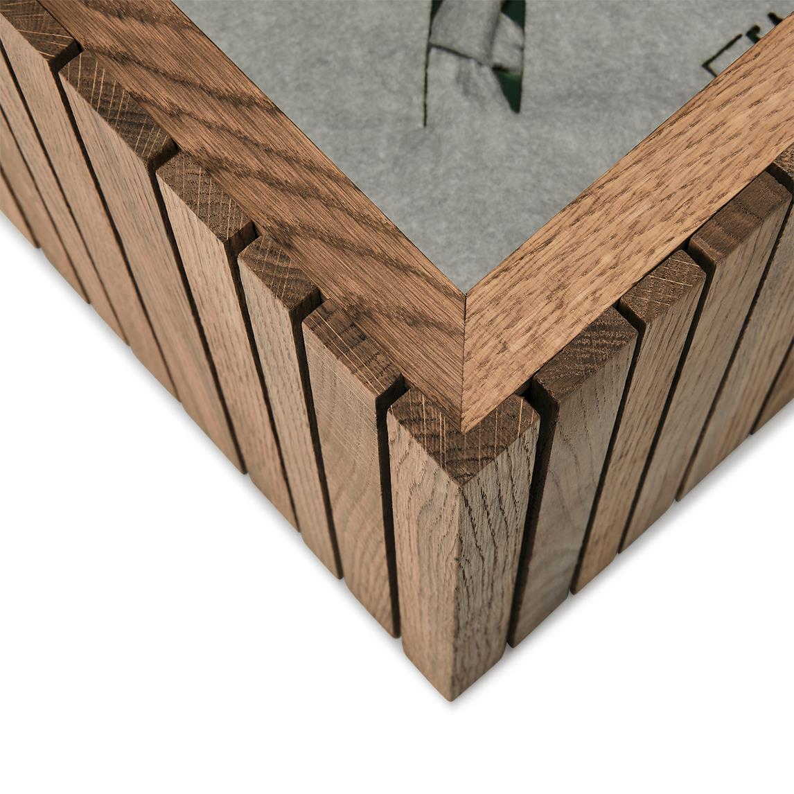 Bitte beachte, dass Eichenholz den natürlichen Gerbstoff Tannin enthält, der das Holz sehr haltbar und antibakteriell macht, bei Nässe aber Flecken verursachen kann. Wir empfehlen, empfindliche Böden/Oberflächen mit Filzgleitern zu schützen.