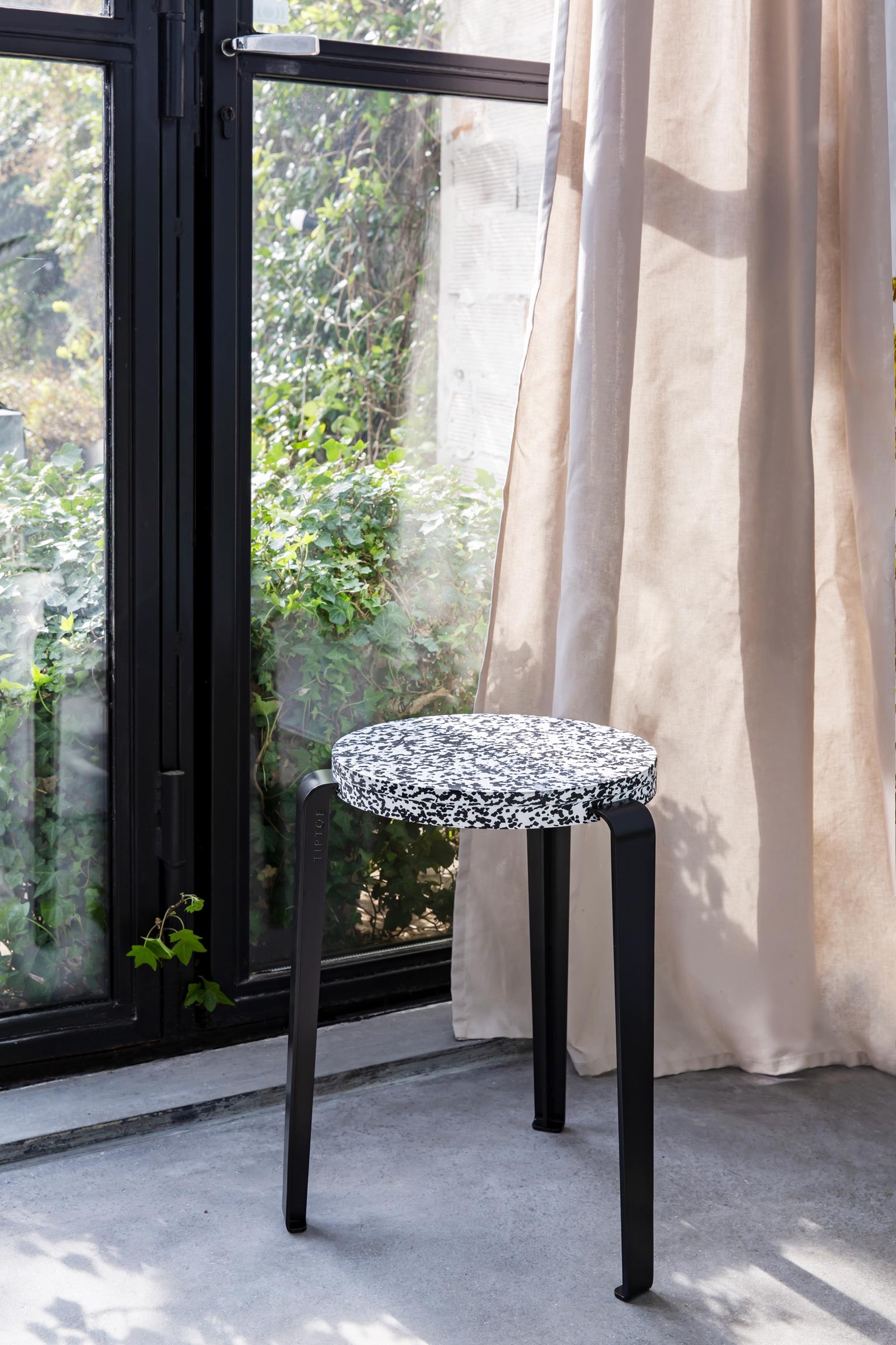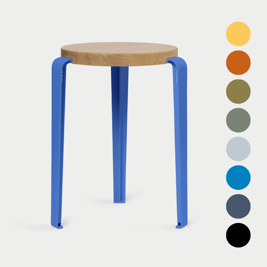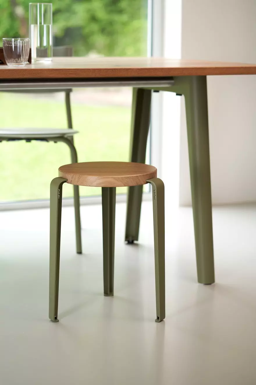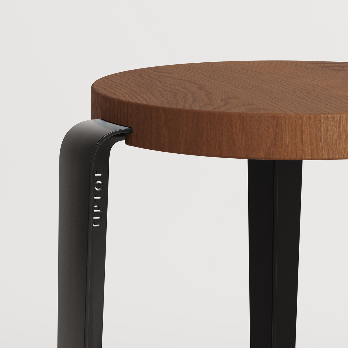 Dieser Hocker wird zu 100 % in Europa hergestellt: Die Sitzfläche besteht aus Massivholz, Eiche oder Buche, das aus nachhaltig bewirtschafteten Wäldern stammt, und die Gestelle aus Stahl, einem nachhaltigen, soliden und unendlich oft recycelbaren Material.