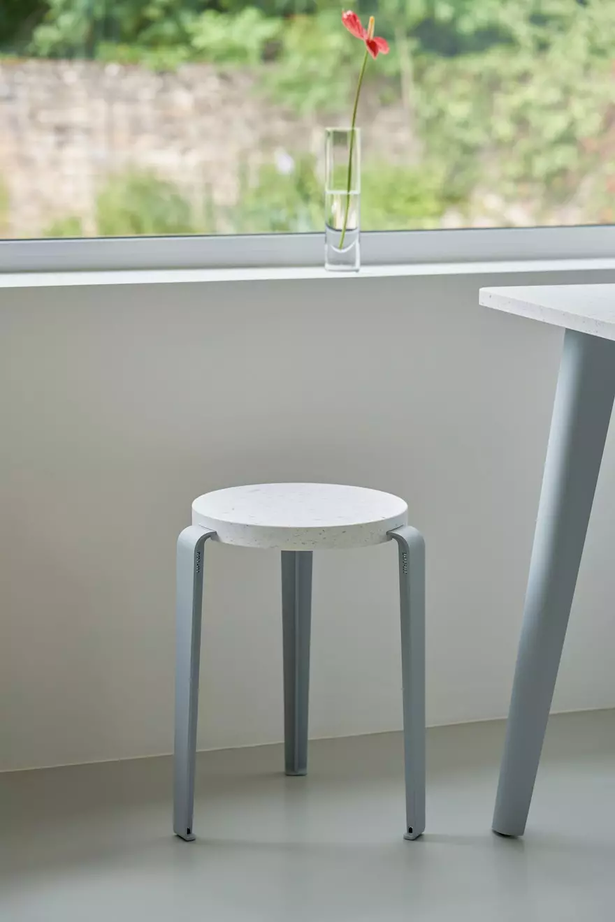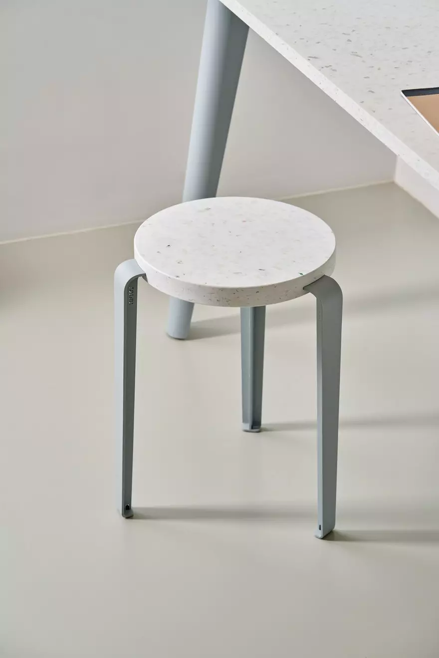 - Weiße Sitzfläche aus recyceltem Kunststoff, hergestellt aus Joghurtbechern