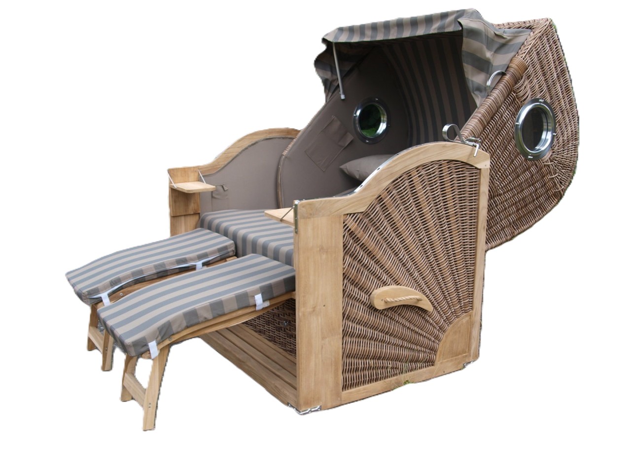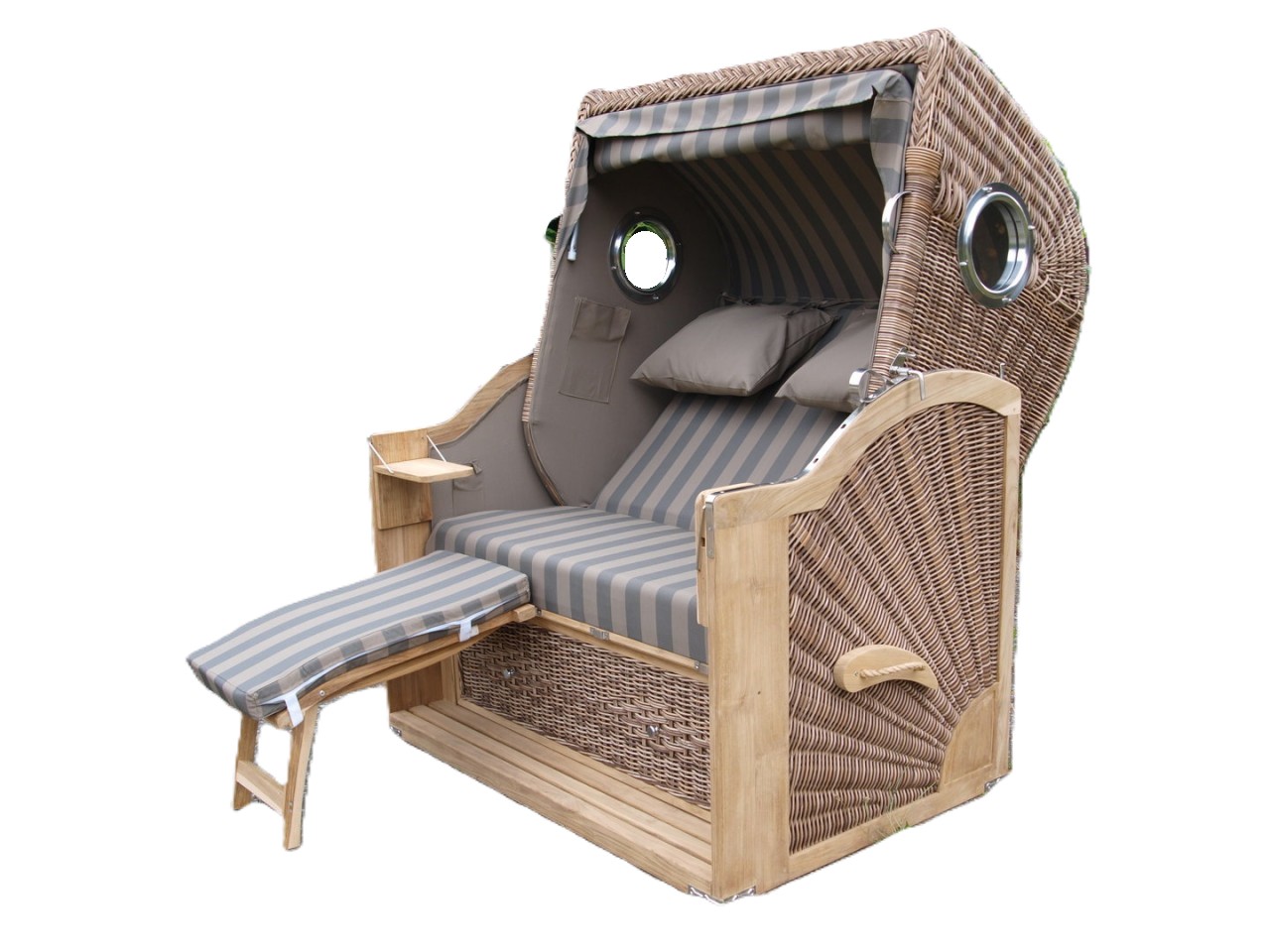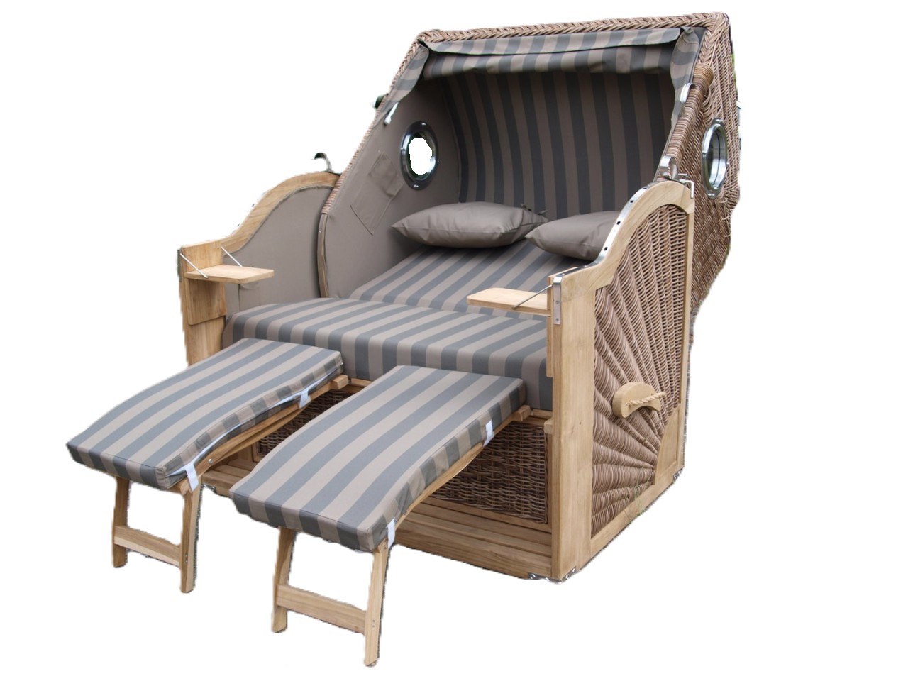 Dieser Strandkorb ist ein 2,5 Sitzer mit einer Breite von 140cm und bietet somit ausreichend Platz für zwei Personen.