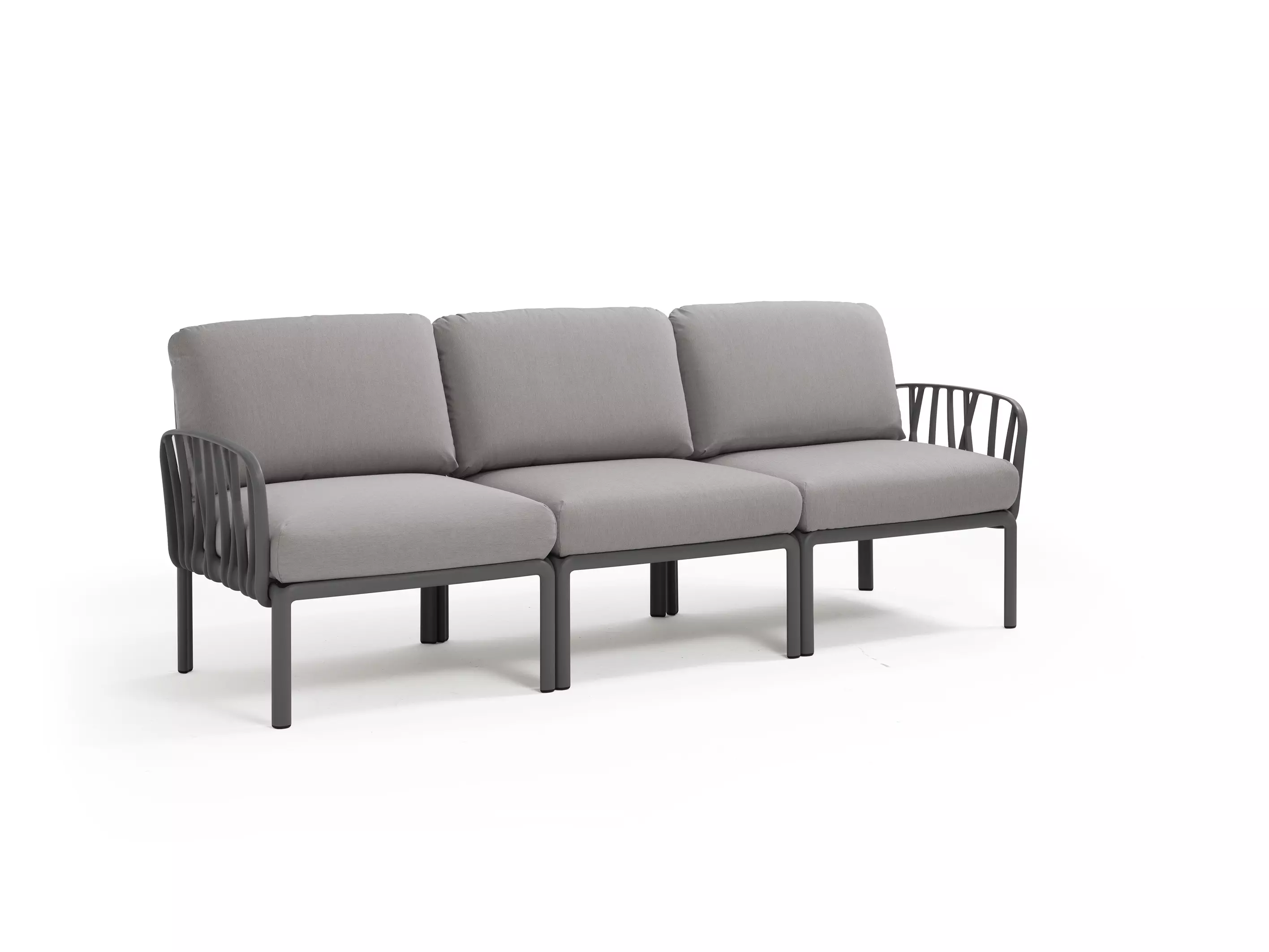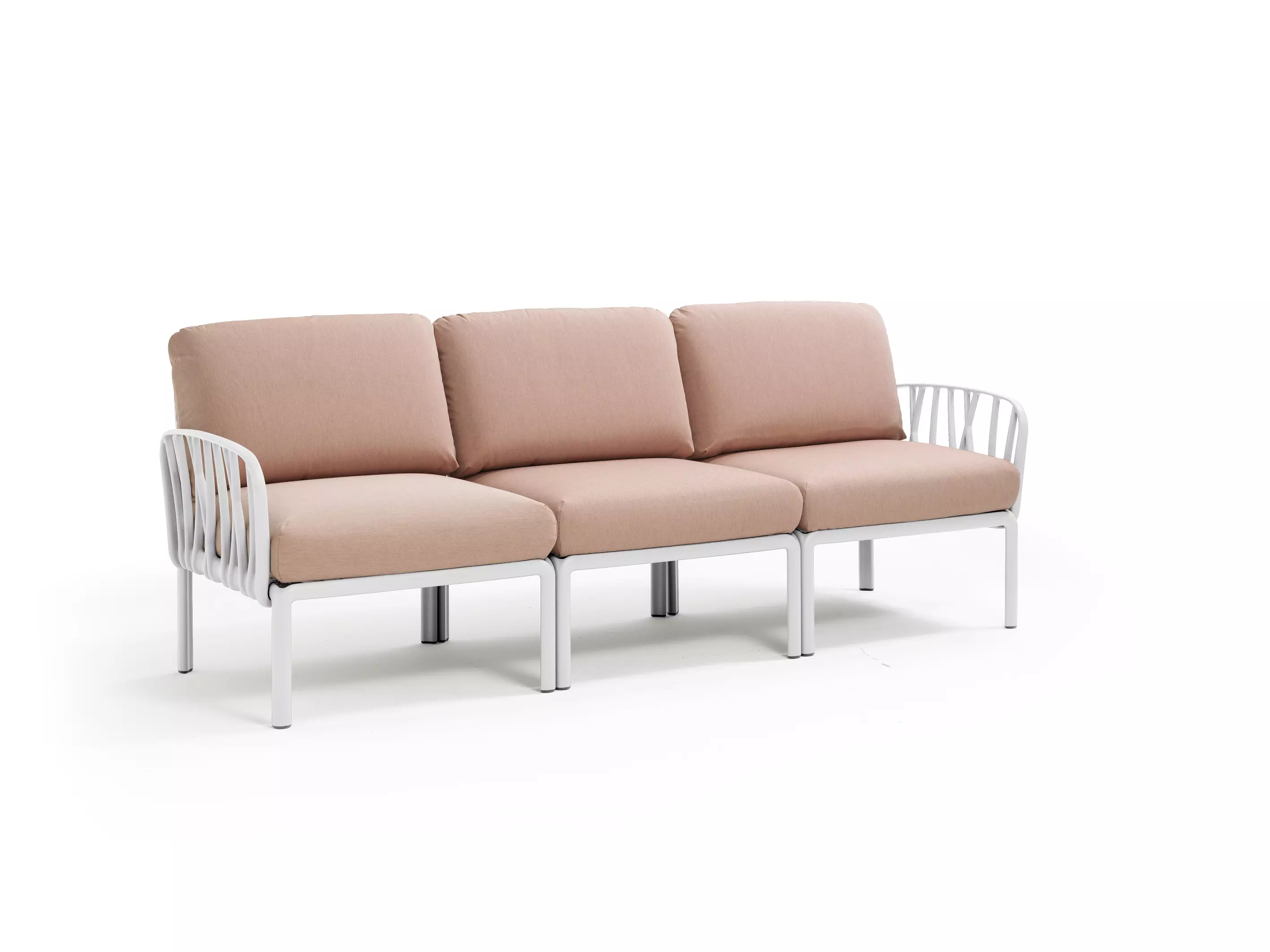 Outdoor Relax Sofa - 3 Sitzer - mit Armlehnen aus glasfaserverstärktem Kunststoff und gepolsterter Sitzfläche und Rückenlehne. Einzeln erhältlich oder als Element bei der Planung größerer Kompositionen verwendbar, die in der Kollektion der modularen Sitzgelegenheiten Komodo vorgesehen sind.