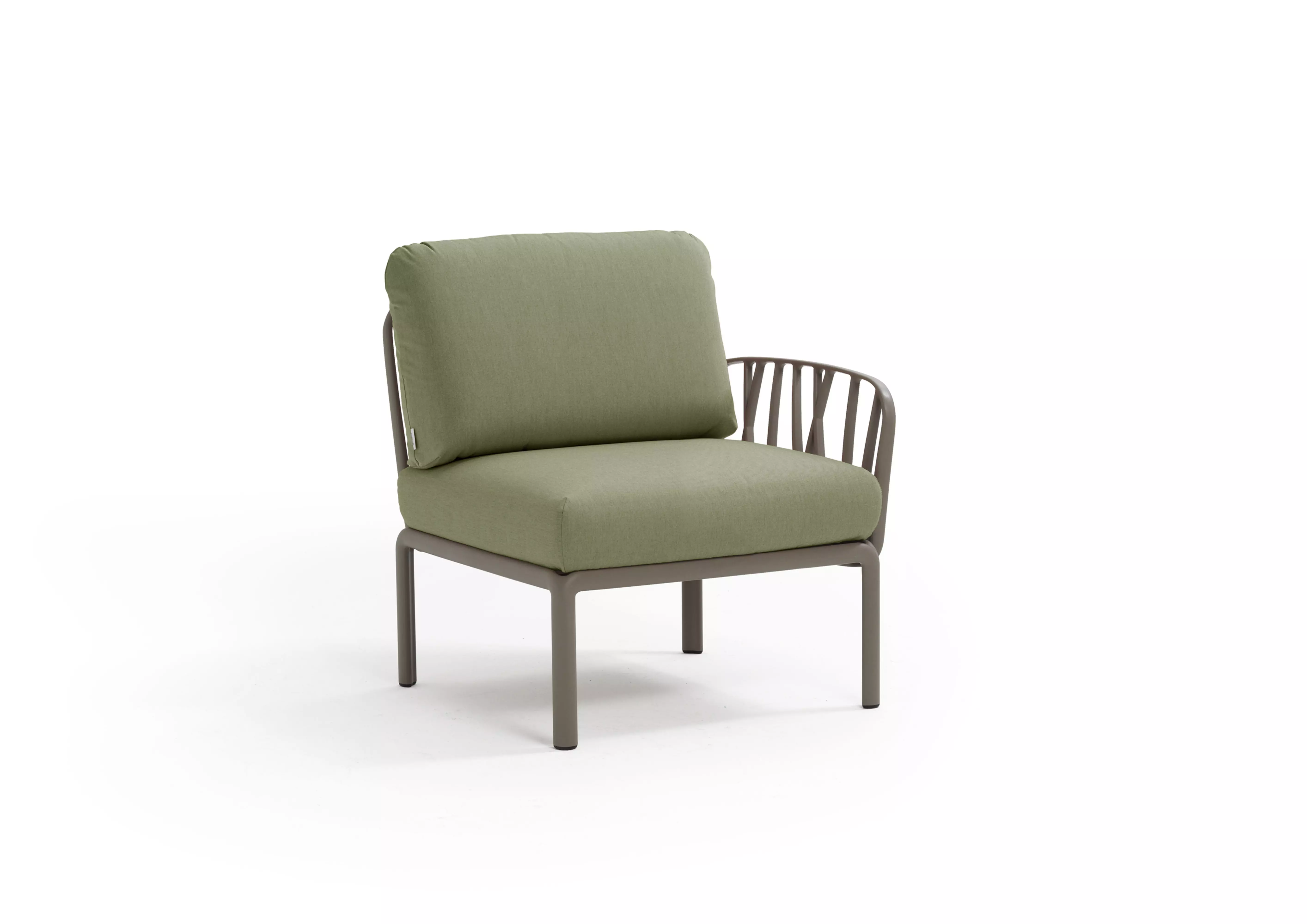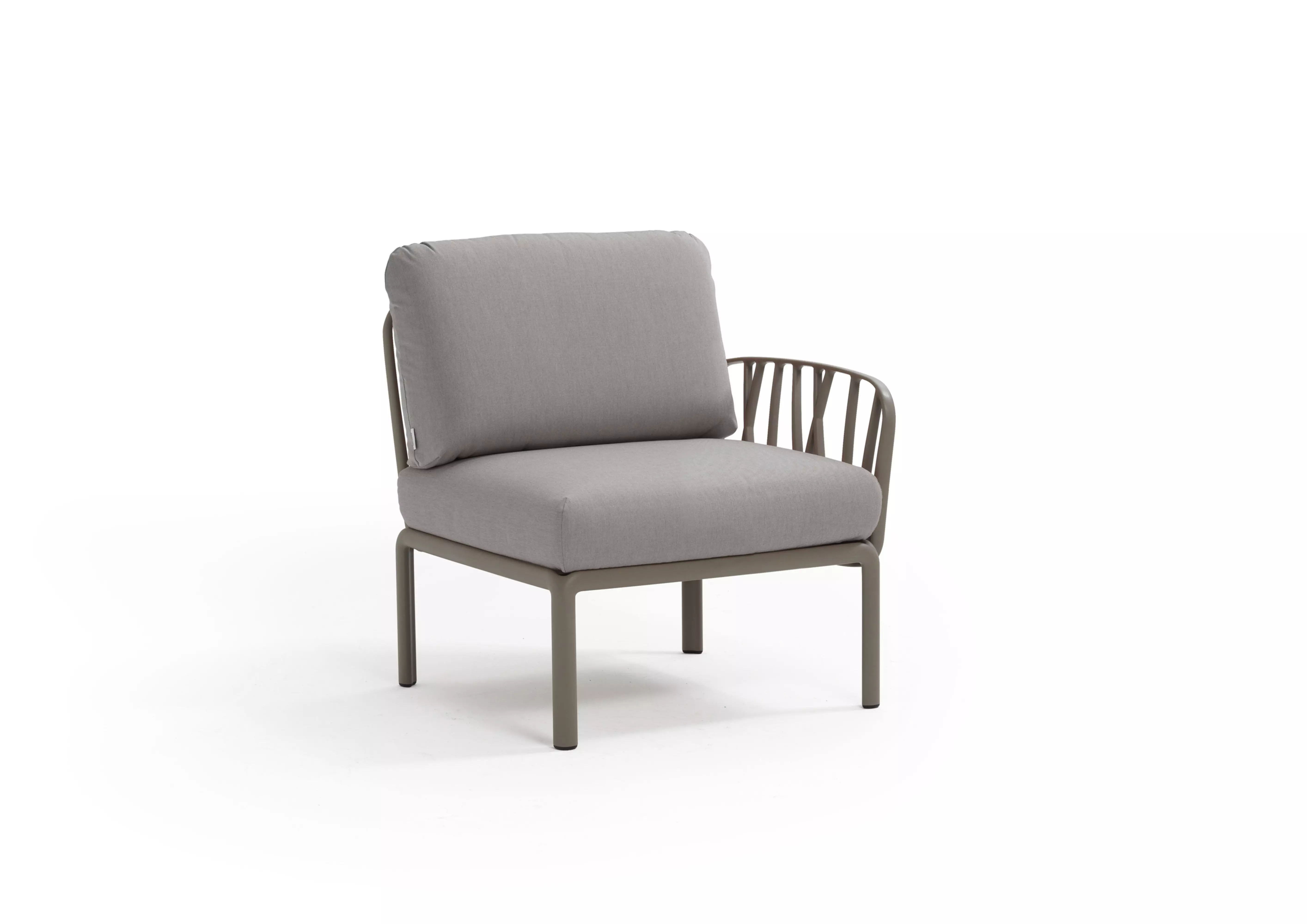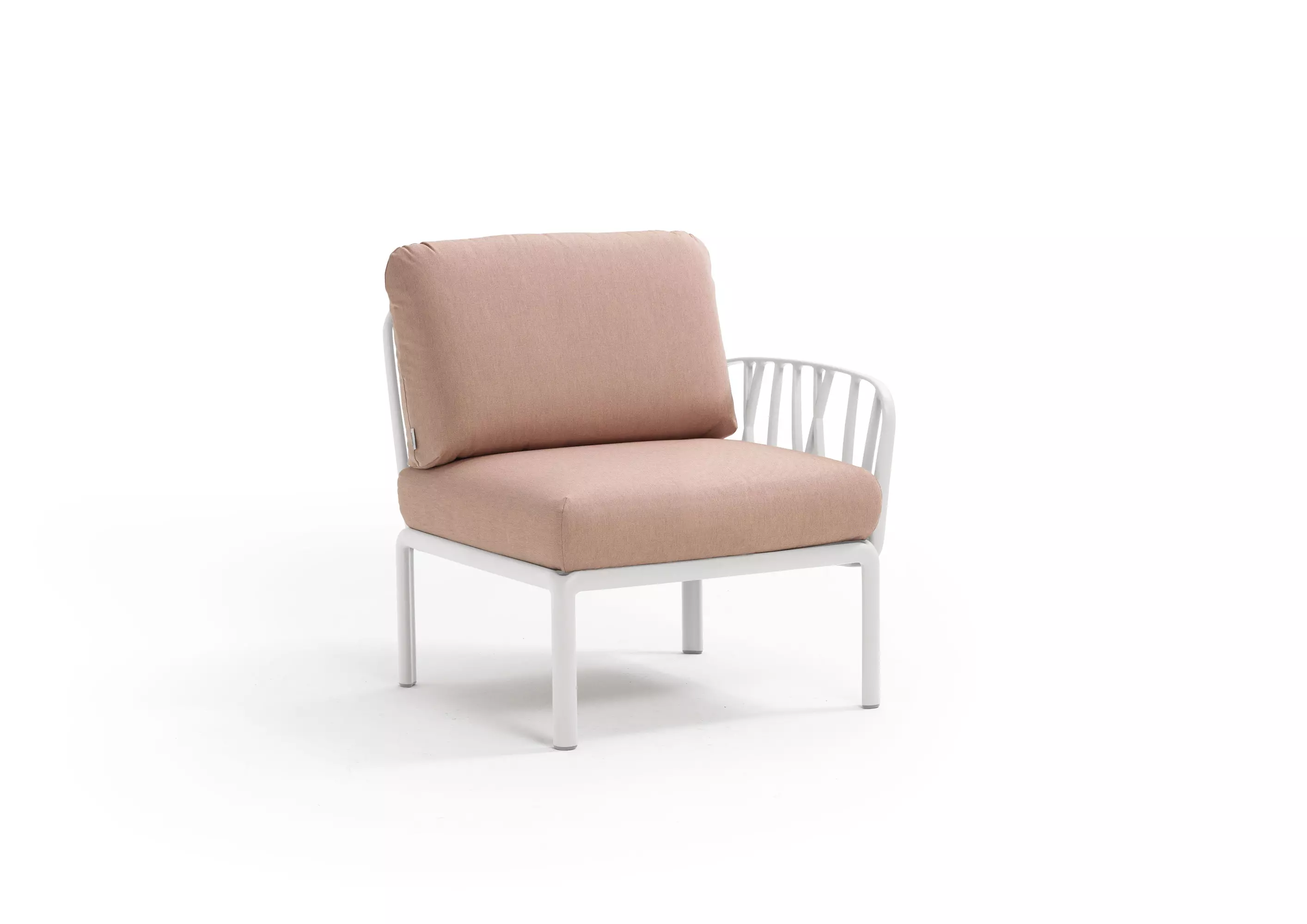 Abschlussmodul für das Outdoor Sofa Komodo mit einer Armlehne (rechts oder links) aus glasfaserverstärktem Kunststoff und gepolsterter Sitzfläche und Rückenlehne.