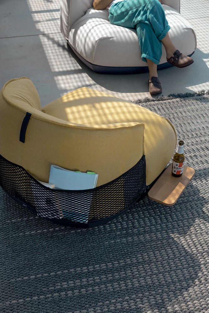Die Sitzmöbel sind dank der flexiblen, in eine wasserdichte Hülle eingeschlossenen Polsterung aus Polyether und Kunststoffriemen weich und komfortabel.