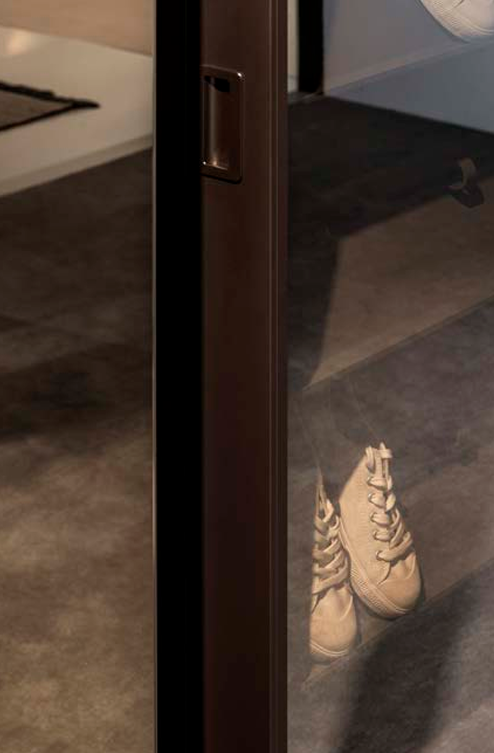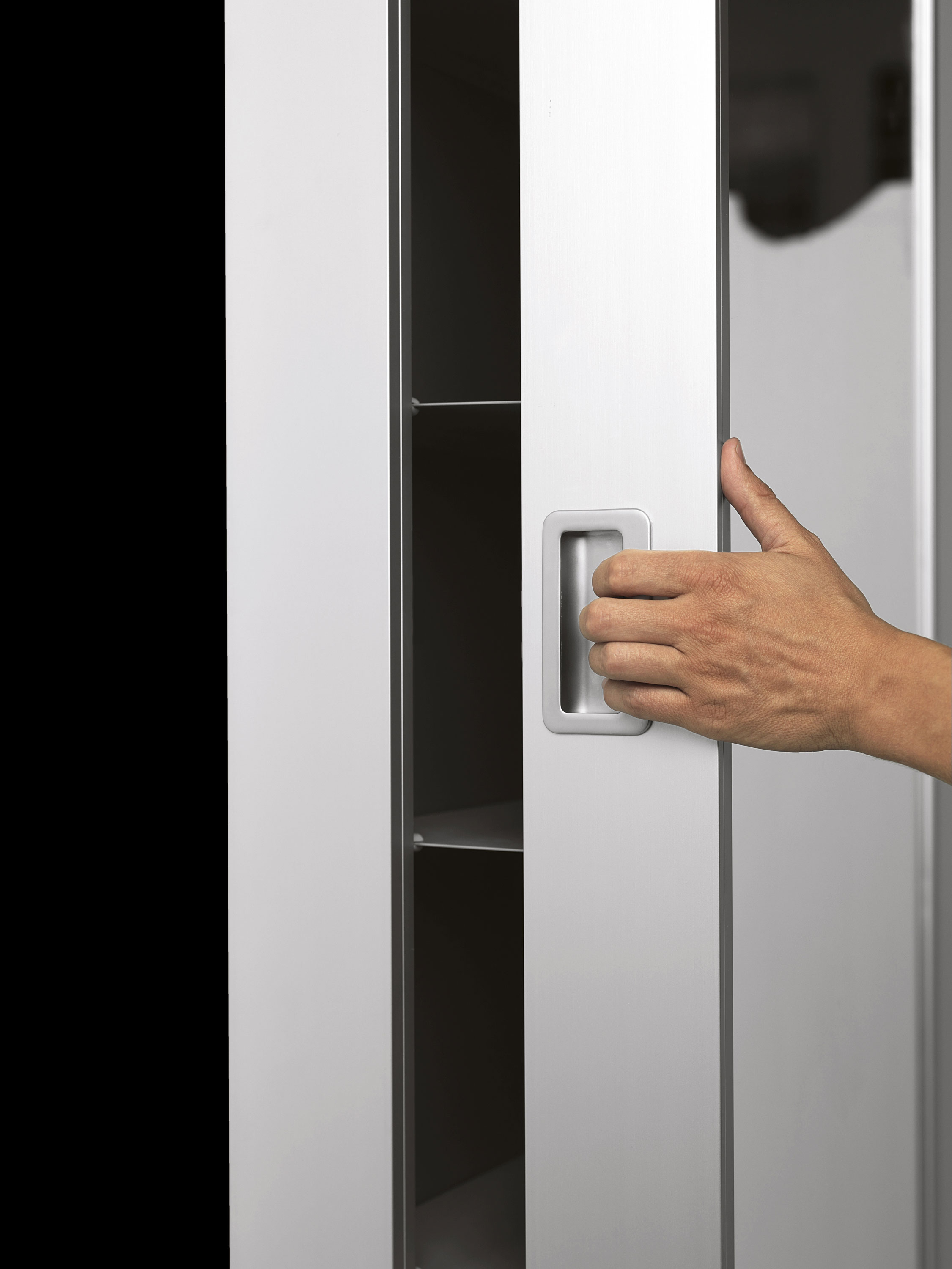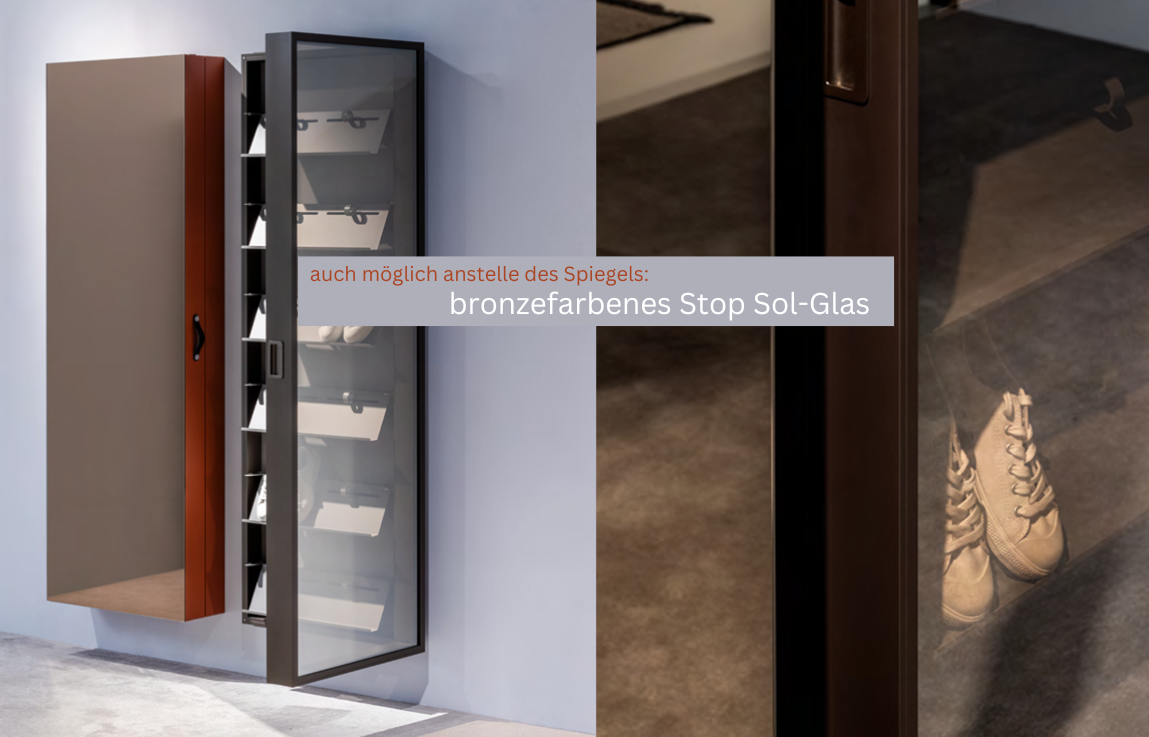 Das raffinierte und funktionelle Element Box überzeugt auch durch seine Details: Einbaugriff, verdeckt montierte Scharniere, beidseitiger Anschlag der Türen für das Öffnen nach rechts oder links. Die Türen haben einen Öffnungswinkel von 180° Grad und der Spiegel auf der Außenseite entspricht den höchsten Sicherheitsvorschriften.