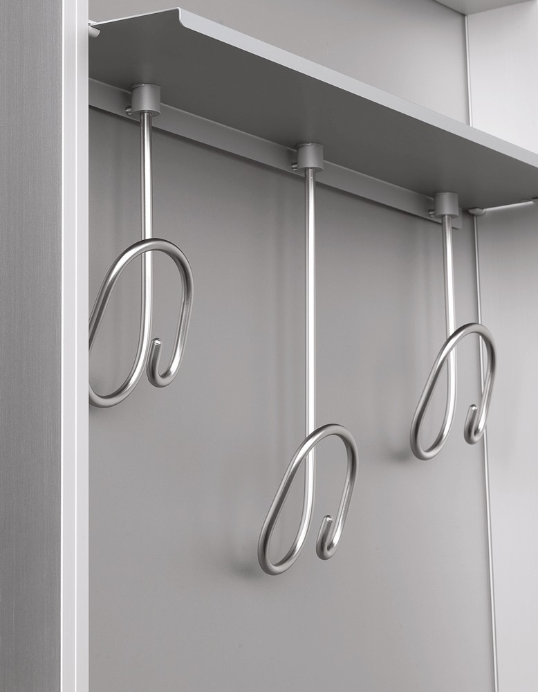 Die Version für die Diele ist mit oberen Universalablagen, drei Kleiderhaken mit origineller Muschelform und einem unteren Fachboden ausgestattet, der als Schuhständer dient. Nicht zu vergessen ist auch der Spiegel, der die Zweckmäßigkeit des Möbels vervollständigt.