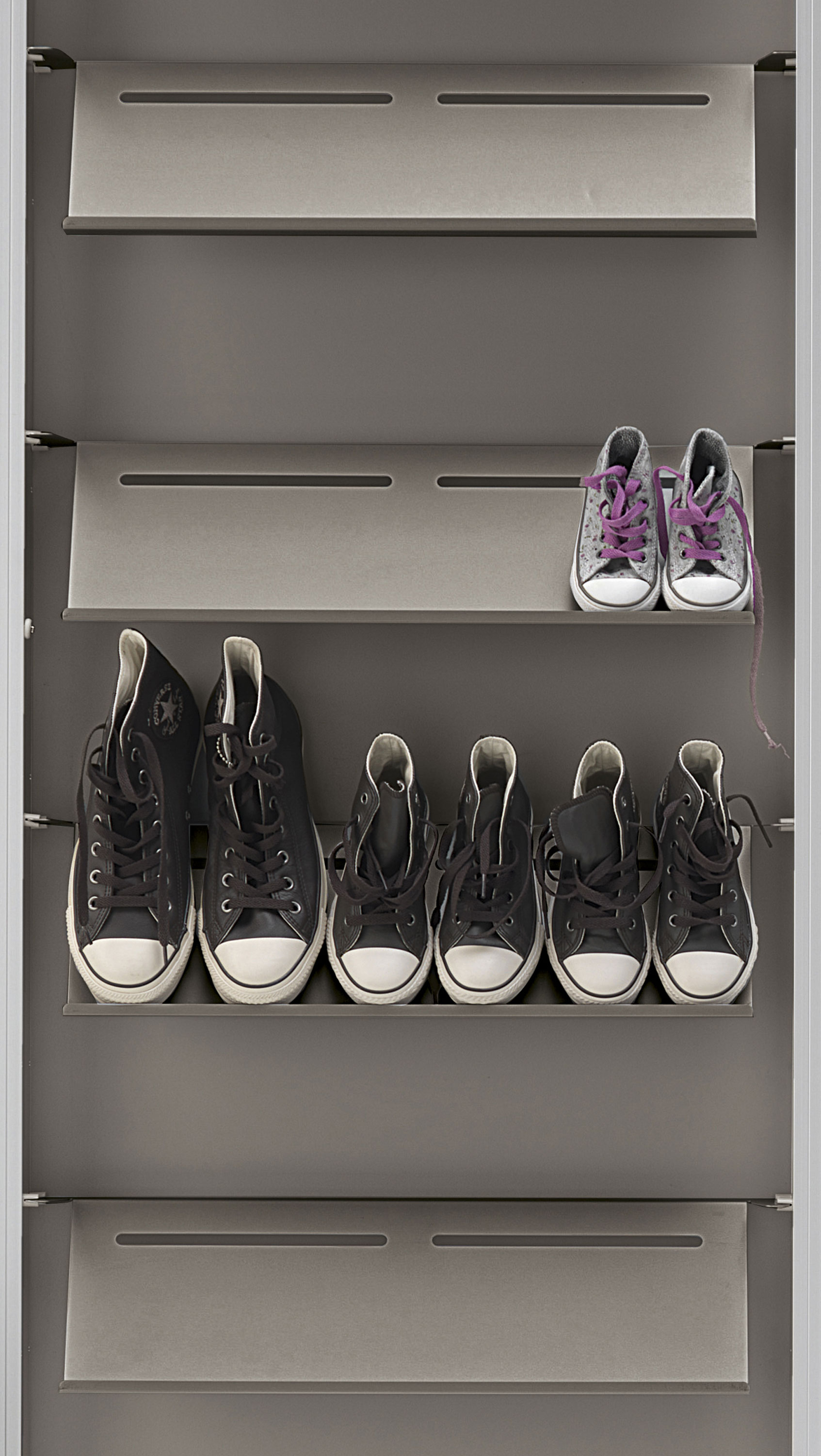 Mit speziellen schrägen Fachböden aus Metall wird Box zu einem zweckmäßigen Schuhschrank, der bis zu 18 Paar Schuhen Platz bietet.