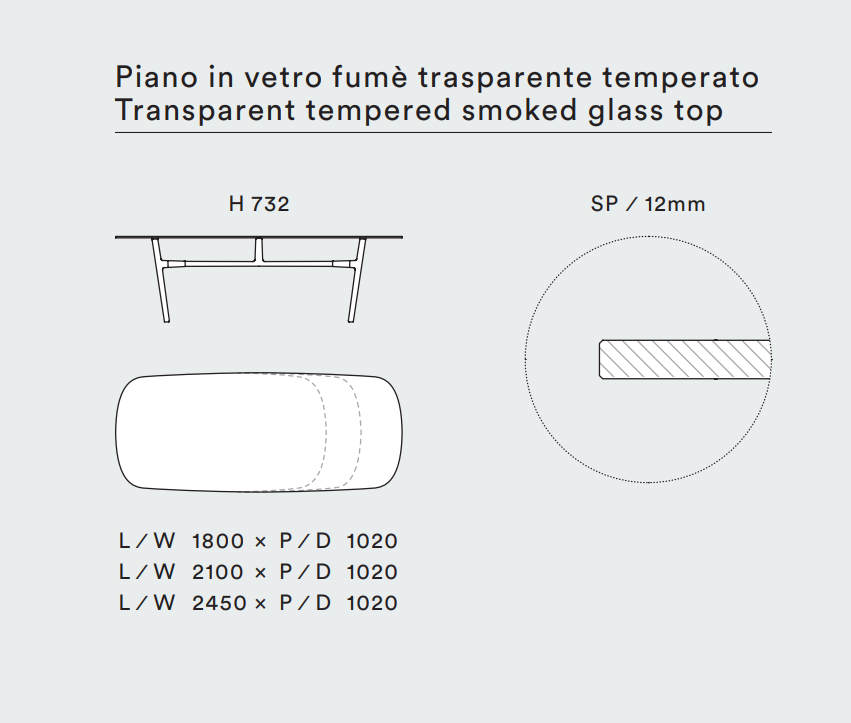 Tischplatte transparentes gehärtetes Glas, Fumè, 12cm