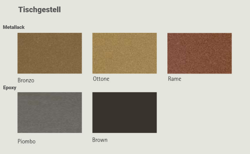 - Alternativ bietet die Metalllackierung einen strahlenden Glanz und eine besonders schöne Optik,bei etwas reduzierter Widerstandsfähigkeit in den Farben Bronze, Messing oder Kupfer.