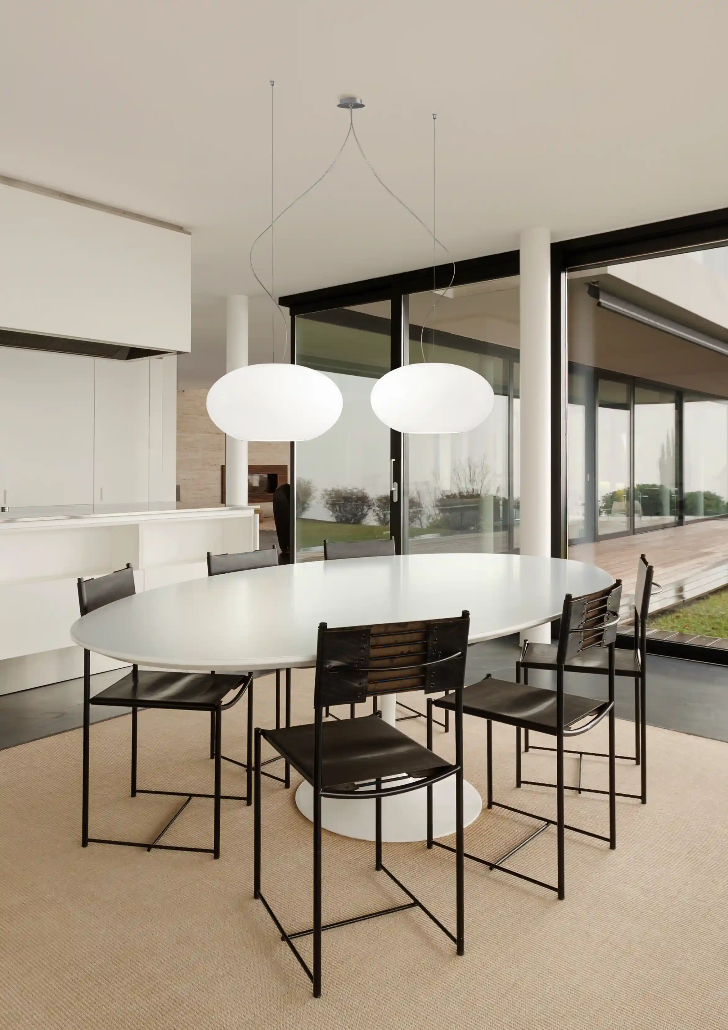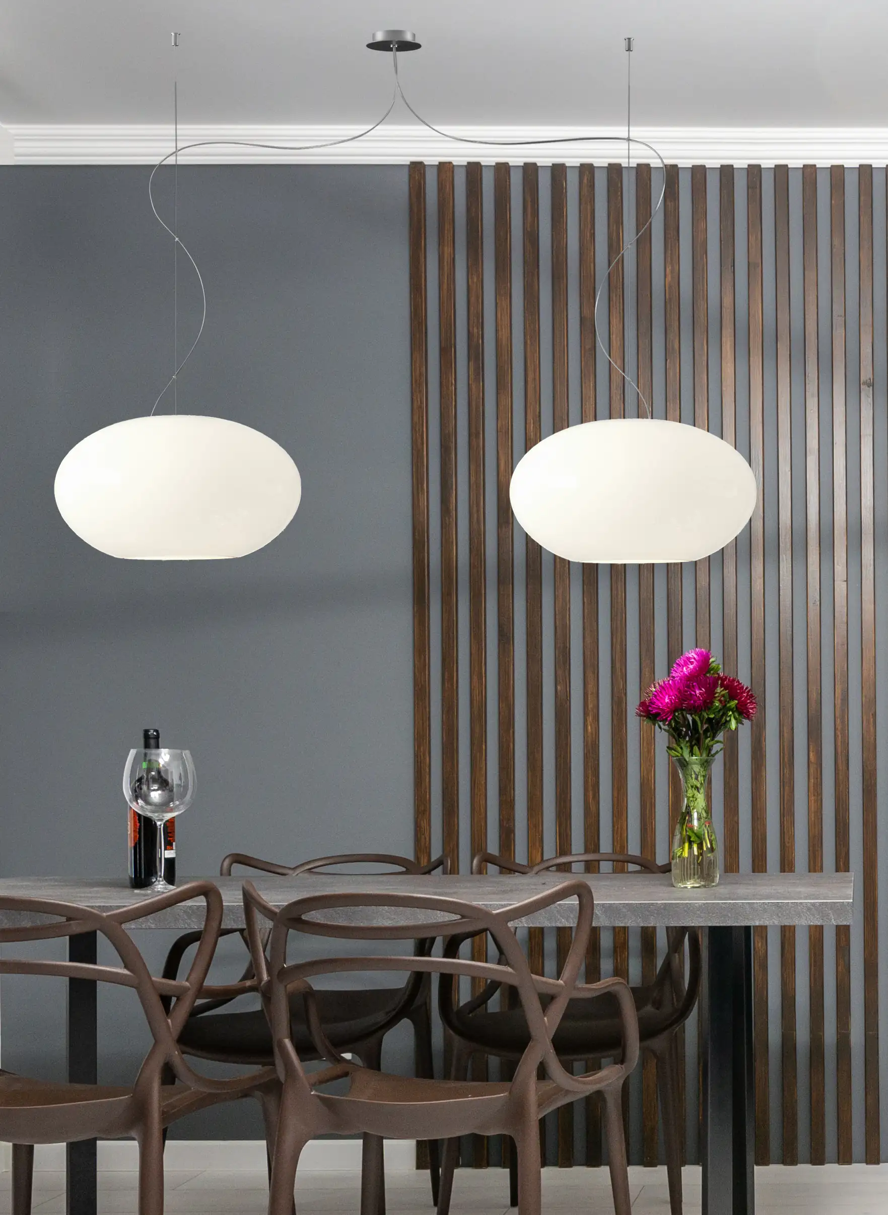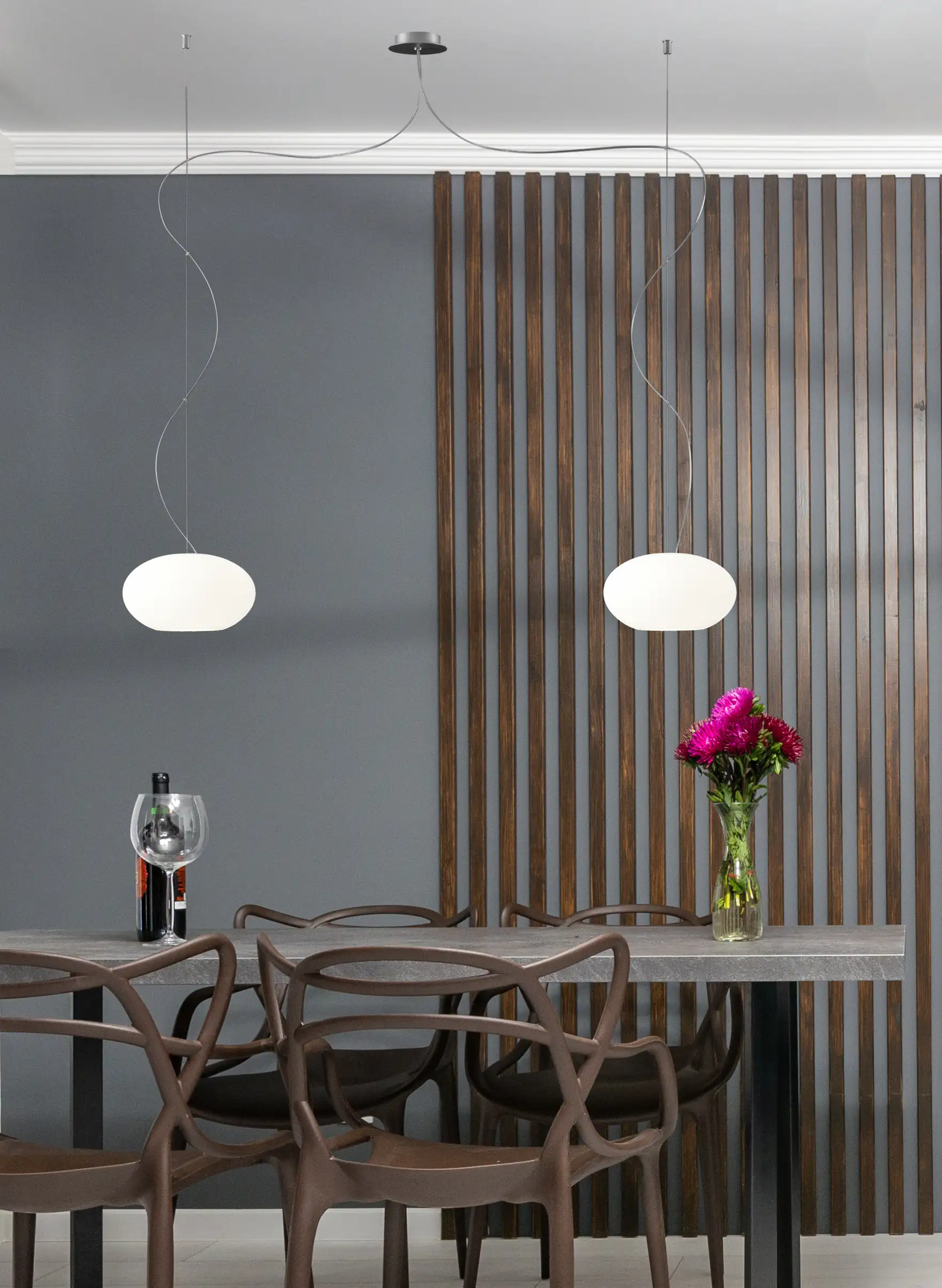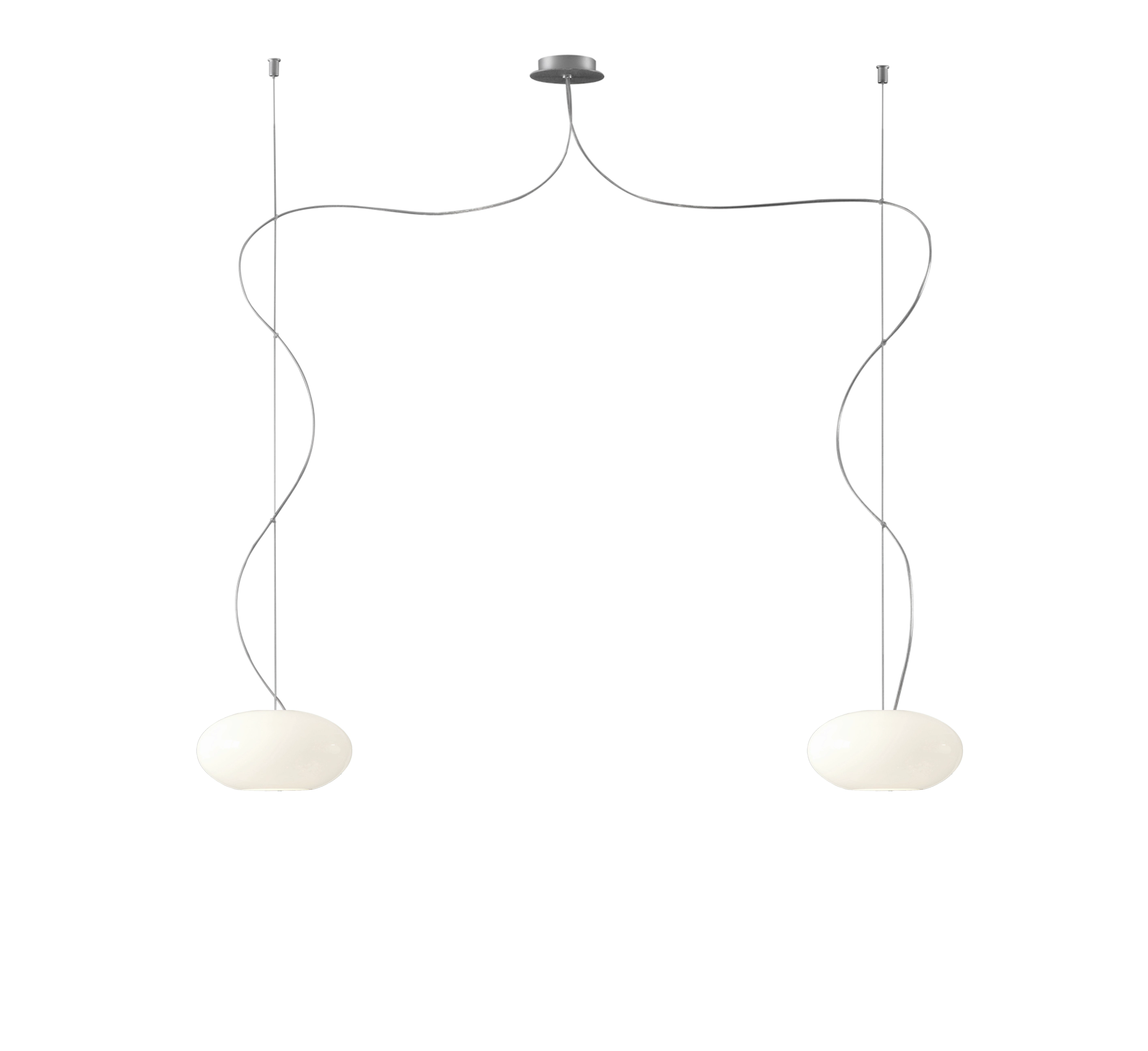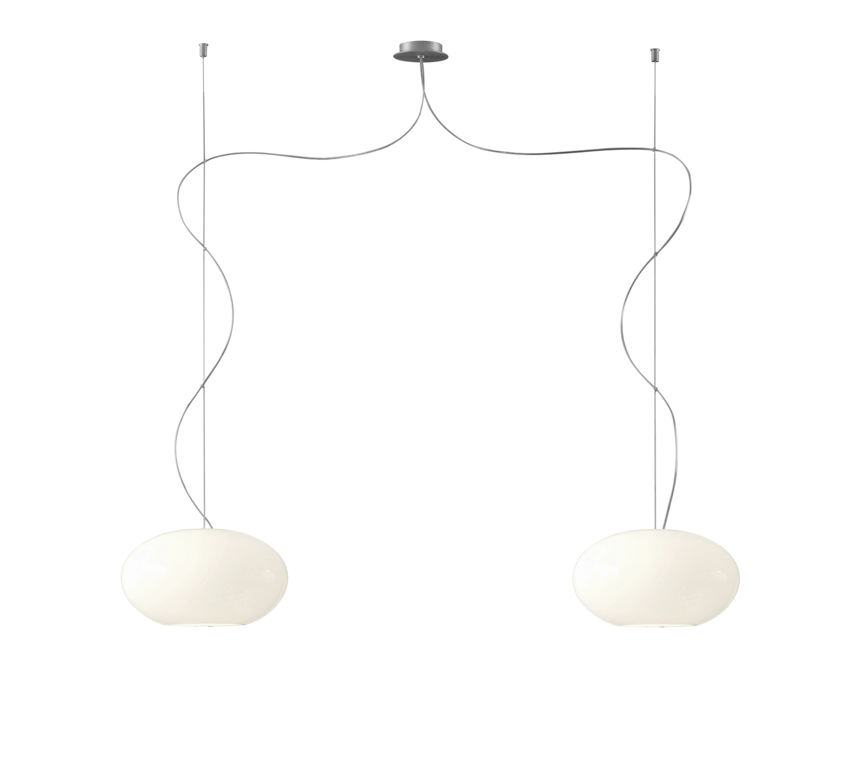 2-flammige Pendelleuchte AIH mit Armatur aus handgebürstetem Aluminium und zwei Schirmen aus mundgeblasenem Glas. In verschiedenen Größen und Farbausführungen erhältlich.