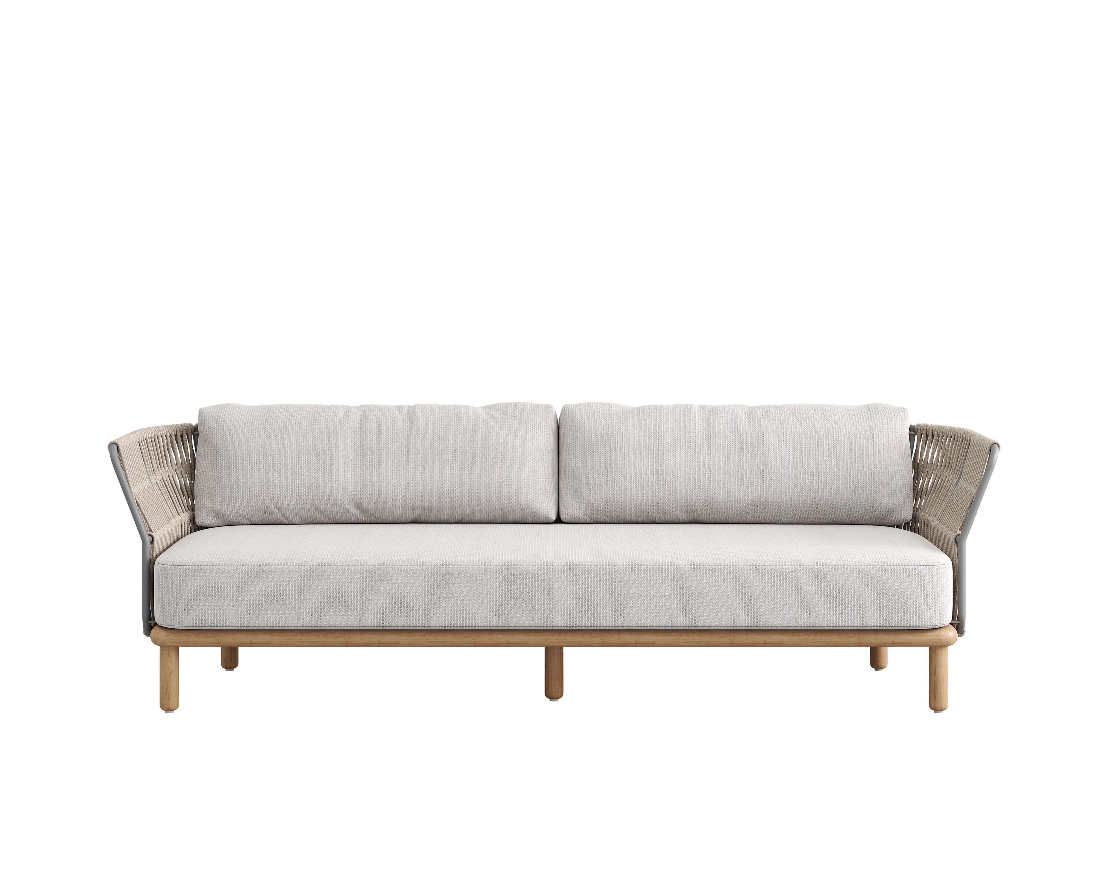 Zu den luxuriösen Materialien gehört ein robustes Ardenza Seil in Sepiagrau, das in einem schönen Muster um die Aluminiumrückenlehne geflochten ist.