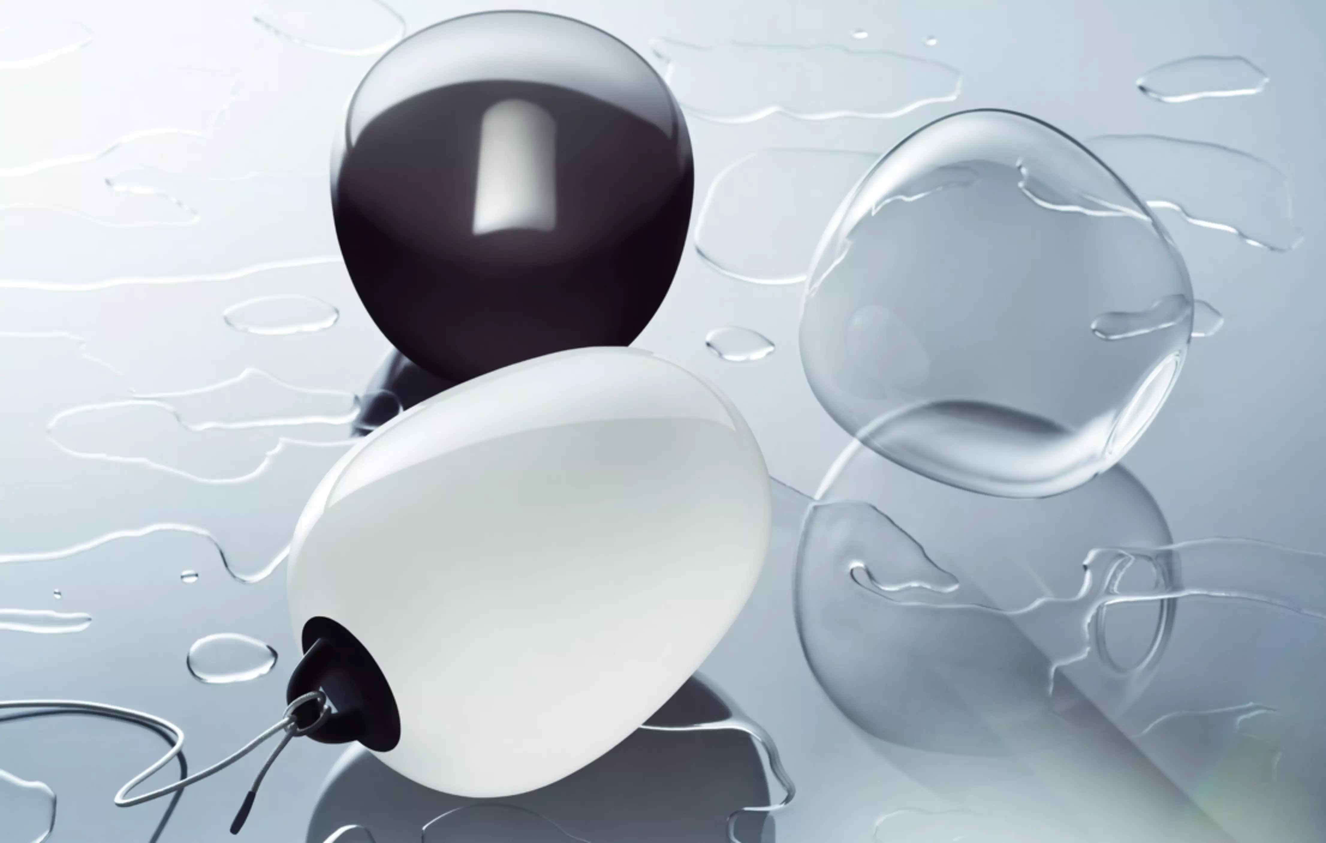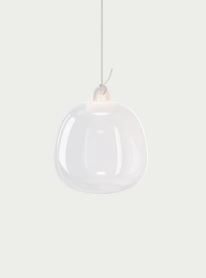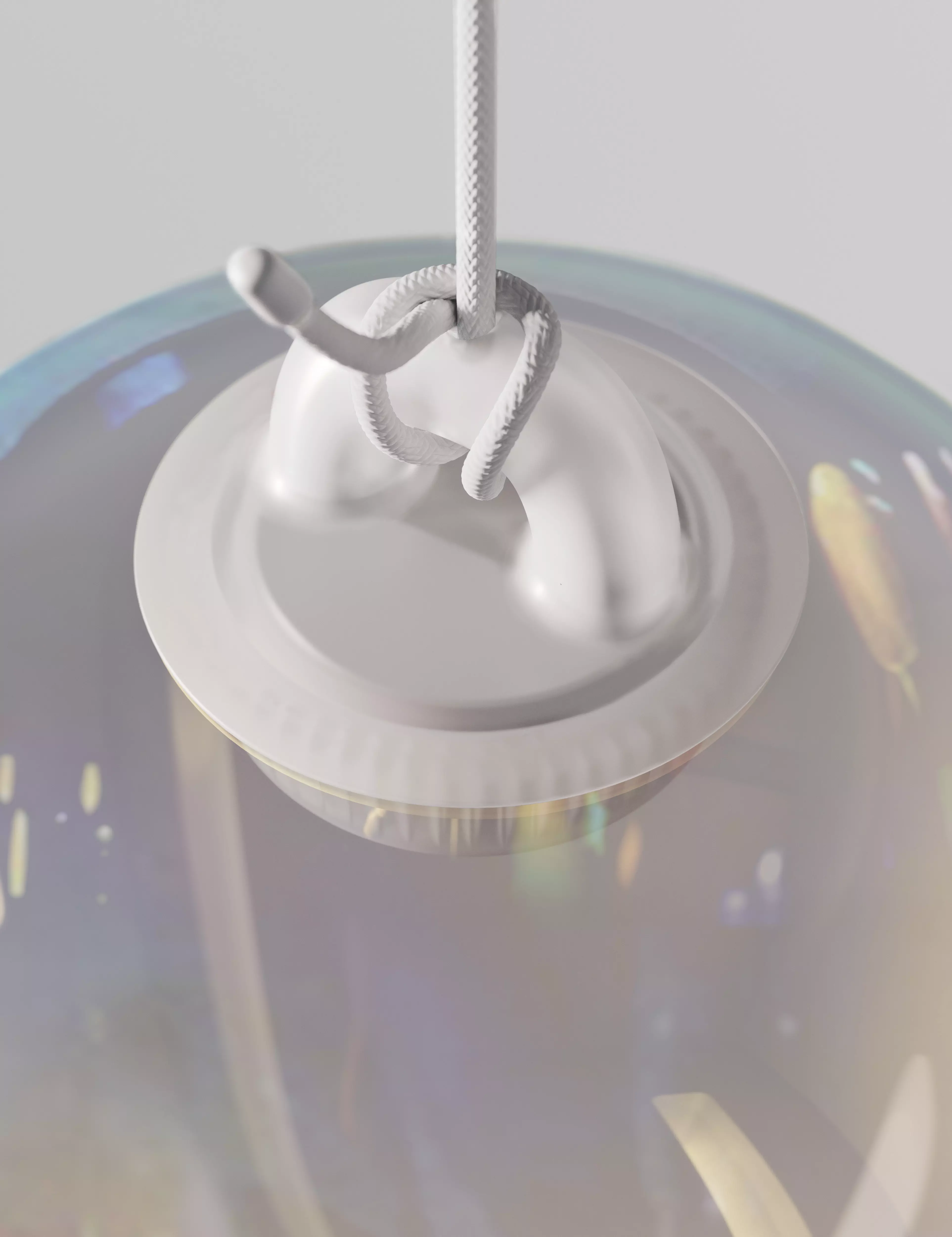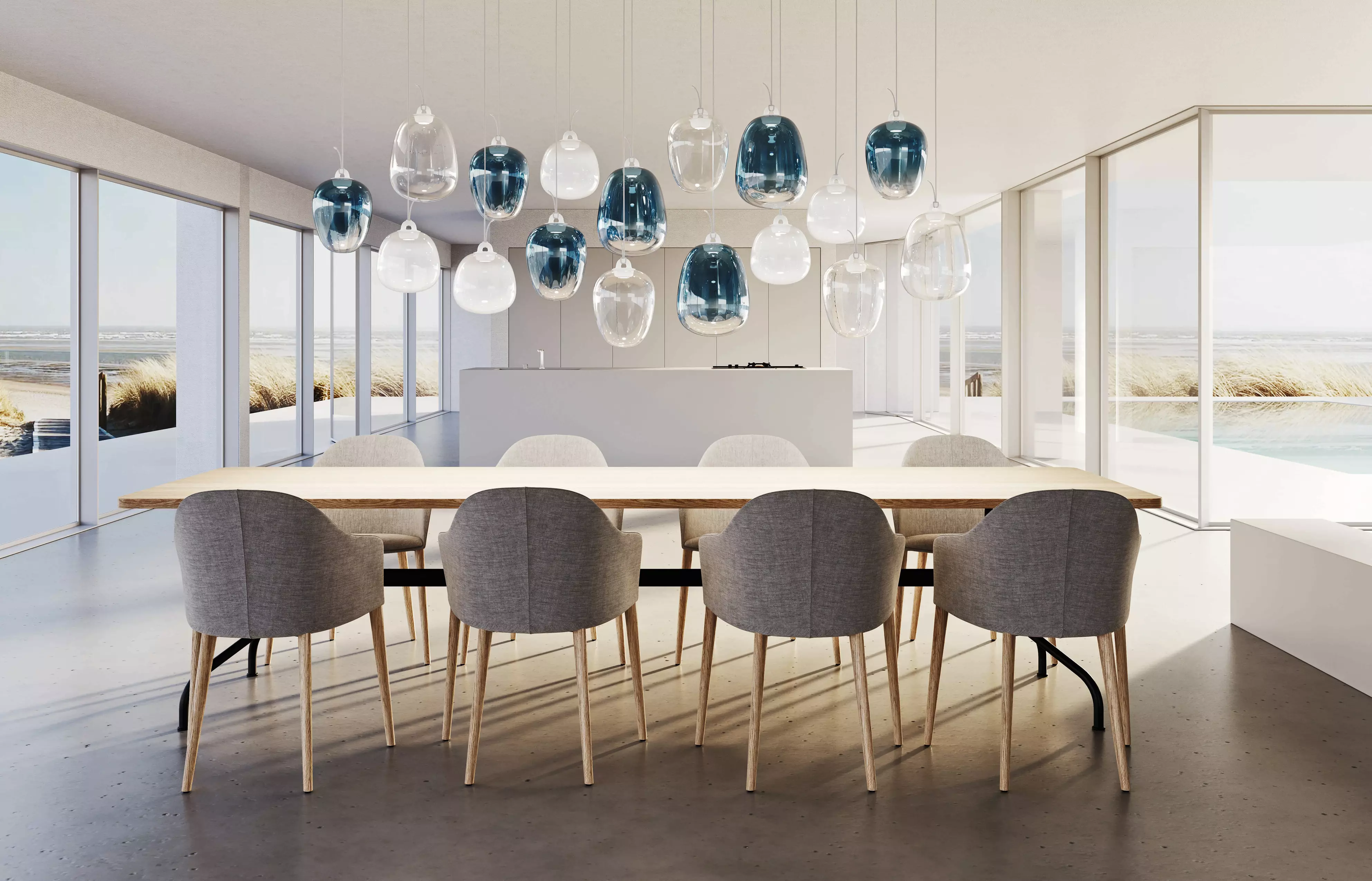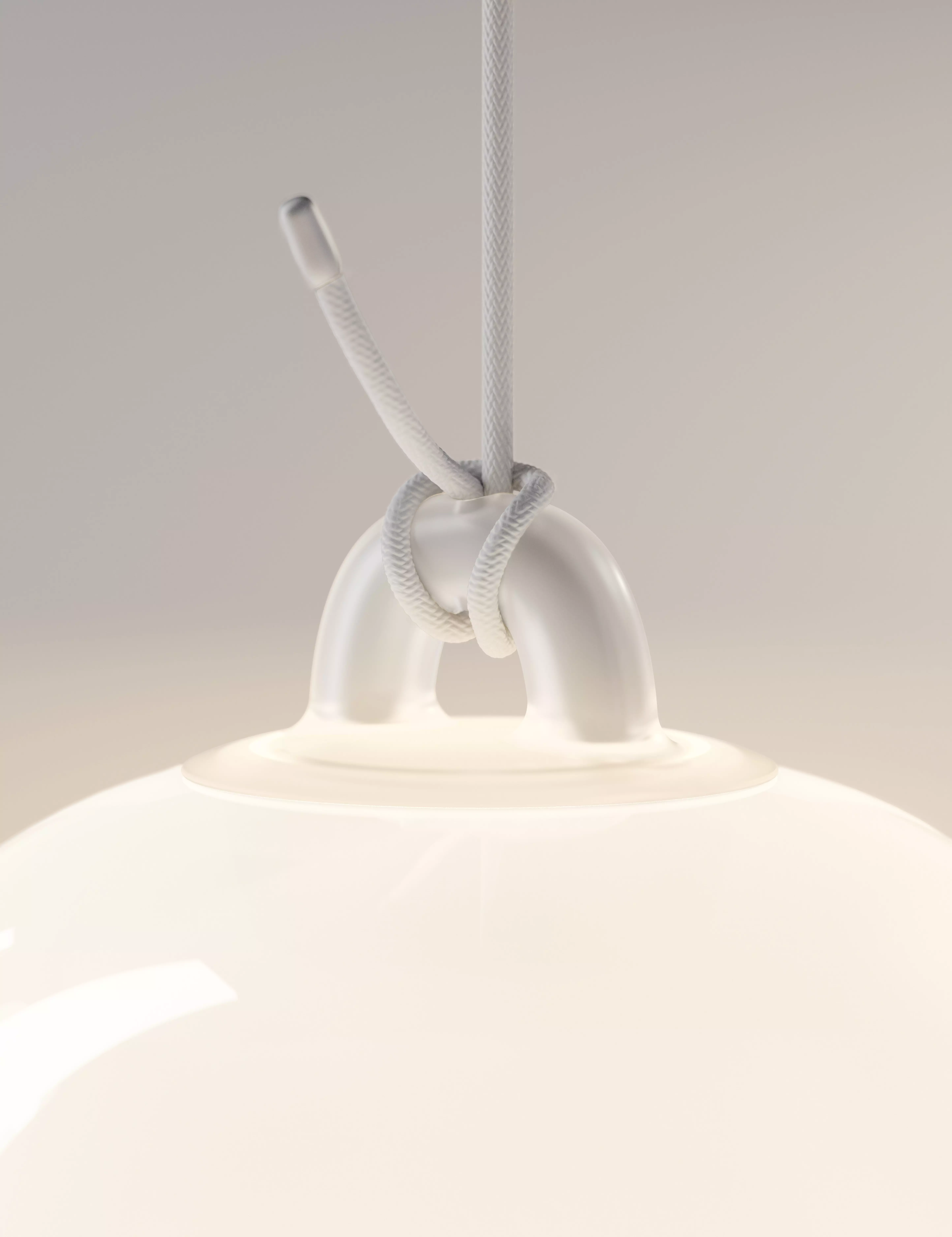 Die weiche Silhouette des Schirms und die fünf für die Ausführungen gewählten Farbtöne, erwecken Vorstellungen von Meeresmotiven und Lichtreflexen auf dem Wasser, während das geknotete Segeltuchkabel am Haken, der den Diffusor trägt, die Illusion erzeugt, dass die Leuchte wie eine Boje in der Luft schwebt.