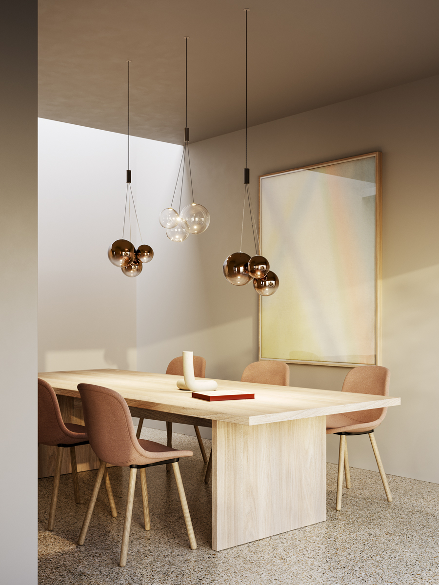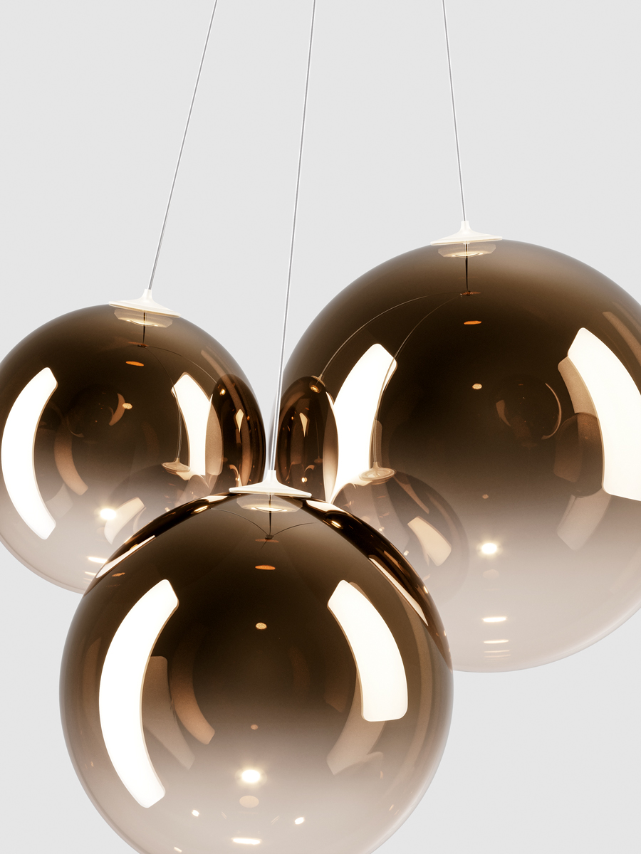 Jeder Glasdiffusor ist mit einer eingebetteten LED-Lichtquelle ausgestattet, die warmweißes Licht liefert. Die drei Glaskugeln, die das Licht bilden, sind unterschiedlich groß und hängen jeweils an einem dünnen Kabel. Die unterschiedlichen Größen, die Höhe der Aufhängung und die Art und Weise, wie die Kugeln aneinander haften, verleihen dem Zufall einen lebendigen Zufallscharakter.