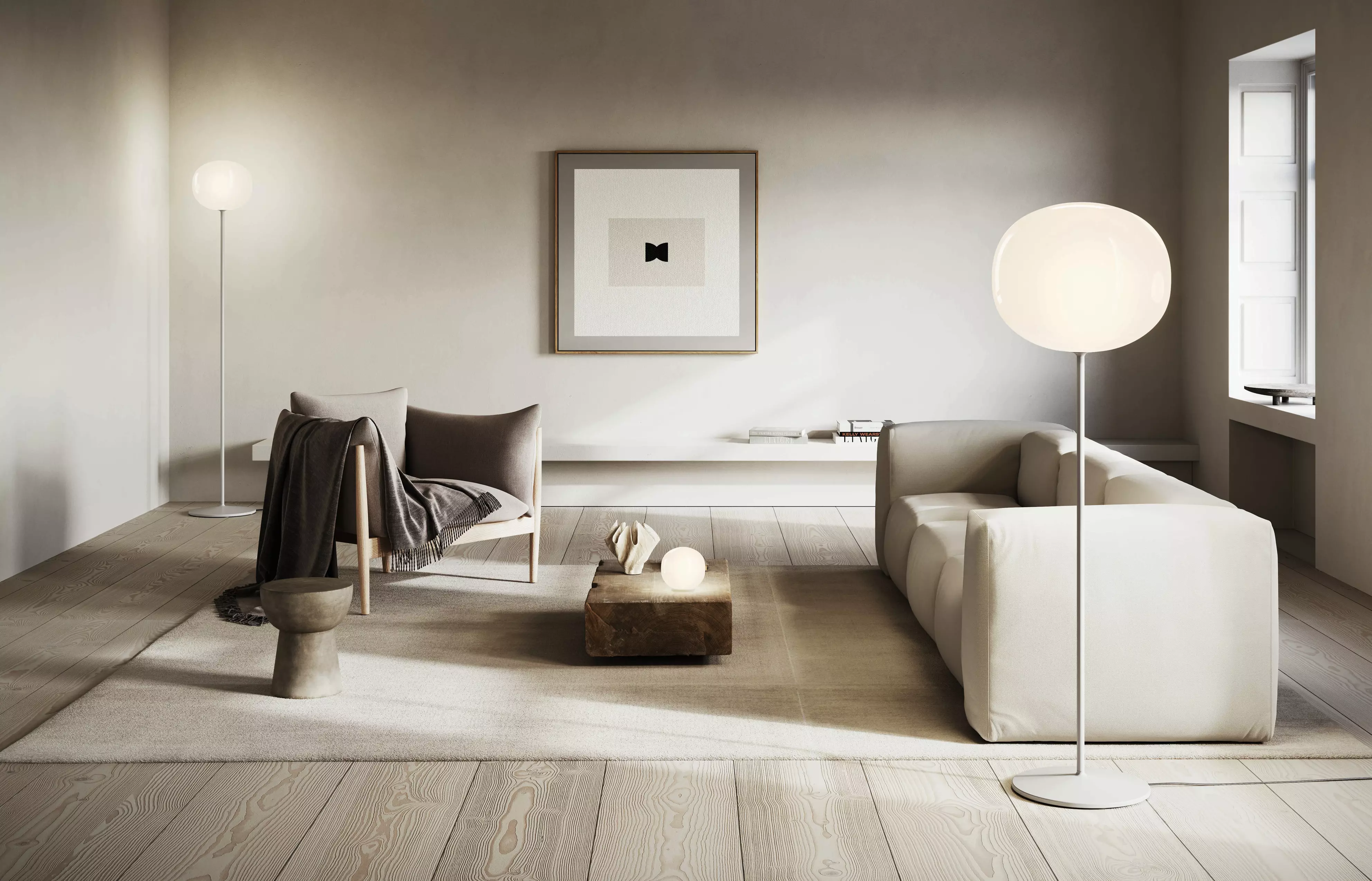 Volum zelebriert die Eleganz der Einfachheit mit einer Serie von Leuchten, die sich in ihren ähnlichen und doch zutiefst unterschiedlichen Formen zu poetischen Kompositionen ergänzen, die von einer 360°-Beleuchtung erzählen, mit unterschiedlichen Funktionen und Einsatzmöglichkeiten. Hinter ihrer scheinbaren Einfachheit verbirgt die mit dem Studio Snøhetta entworfene Kollektion eine komplexe Umsetzung und eine Hommage an die antike Technik der Glasbläserei, die natürlich unvollkommenen Formen Leben einhaucht. Die mundgeblasenen Glaskugeln des Diffusors, die in den Größen 29 und 42 cm Durchmesser erhältlich sind, zeichnen sich durch eine glänzend weiße Ausführung aus, die das Licht gleichmäßig abstrahlt. Die Leuchtenfamilie Volum umfasst verschiedene Funktionen – Pendel Cluster, Pendel, Decke, Wand, Tisch und Boden –, die einzeln oder in Komposition jeden Bereich und jede Situation aufwerten können, um originelle Beleuchtungslösungen zu kreieren.DesignSnøhetta, 2024Materialmundgeblasener GlasdiffusorMetallstruktur weißMaßeshort Ø 29 cm, Höhe 130 cmlong Ø 29 cm, Höhe 176 cm short Ø 42 cm, Höhe 142 cm long Ø 42, Höhe 188 cmLichtquellekann ohne oder mit passendem Leuchtmittel bestellt werdenLED E 27, max 25 Wdimmbar TRIAC2700 K, 1000 lm