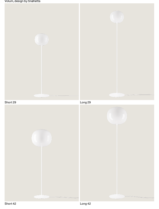 Volum ist eine exklusive Serie von Glasleuchten, die poetisch einfach und doch komplex in ihrer technischen Umsetzung sind. Die vier mundgeblasenen Glaskugeln, die sich durch eine glänzende weiße Ausführung auszeichnen, haben unterschiedliche Abmessungen von 14, 22, 29 und 42 cm (Durchmesser). Dank ihrer von Natur aus unterschiedlichen Formen ergänzen sie sich intuitiv und ermöglichen es somit, einzigartige Kompositionen zu kreieren. Nach der Einführung der Hängeleuchte Volum im Jahr 2022 wurde die Kollektion überarbeitet, um neue Decken-, Wand- und Tischleuchten einzuschließen, die das Konzept der 360°-Beleuchtung noch besser erkunden. Aufgewertet durch ein harmonisches und diskretes Design, wird jede Volum-Kugel von einer Methacrylatkappe umschlossen, die das Licht gleichmäßig wie Glas durchscheinen lässt.DesignSnøhetta, 2023MaterialGlas mundgeblasen, weiß glänzendSilikonsockelMaßeØ 14 | 22 | 29 oder 42 cmHöhe 13,7 | 21 | 25,2 oder 36,4 cmLeuchtmittel (nicht integriert)kompatibel mit allen E 27 Leuchtmitteln1x 25 Wdimmbar über Handschalter am Kabel bzw. on/off Schalter am Kabel