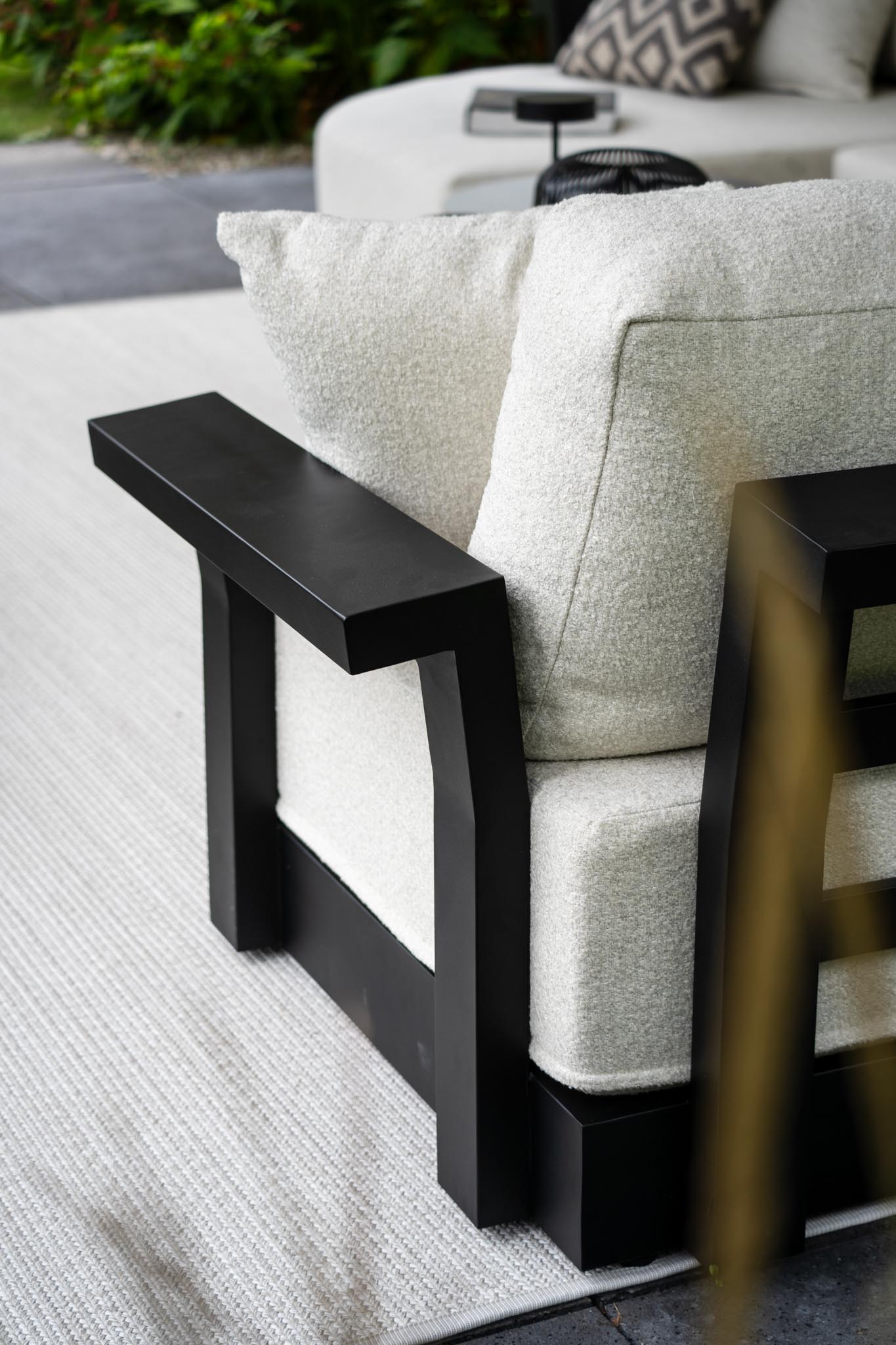 Das robuste Gestell aus pulverbeschichtetem Aluminium in Schwarz sorgt für Stabilität und eine edle Optik, während die wetterfesten Polster in Wollweiß einladenden Sitzkomfort bieten.