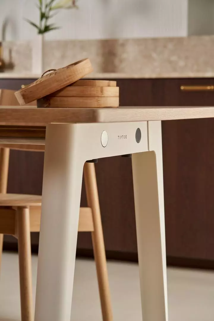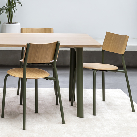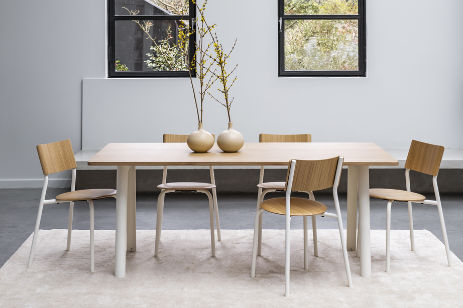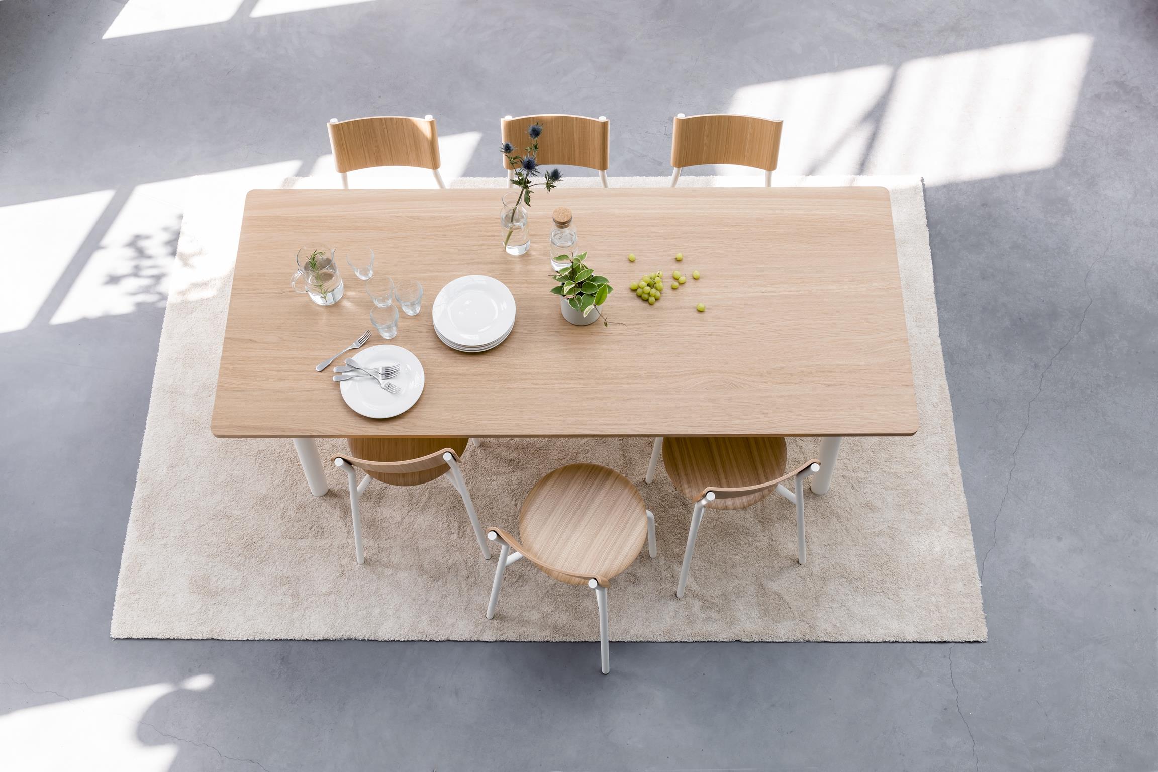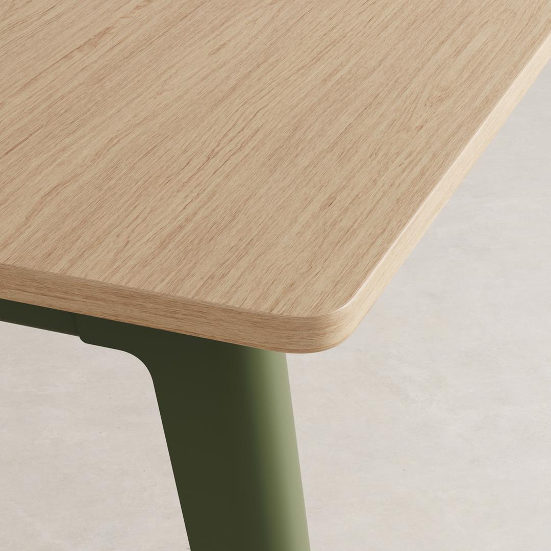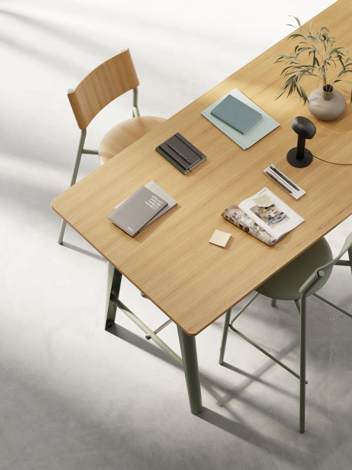 Die Tischplatte wird in verschiedenen nachhaltigen Materialine angeboten: aus ökozertifiziertem Massivholz mit Eichenfurnier, einer Birkemultiplexplatte mit weißem Laminat, recyceltem Holz und recyceltem Kunststoff.