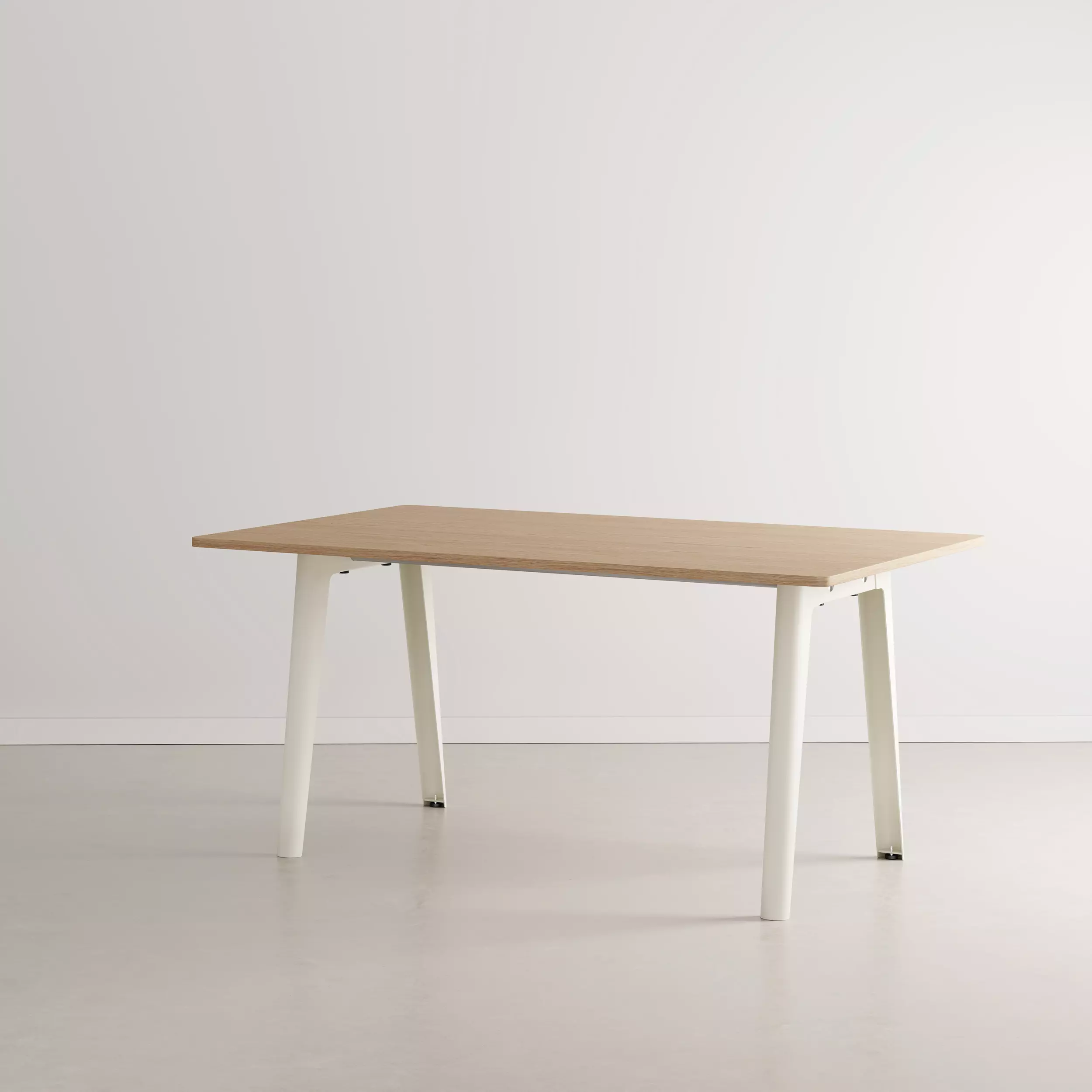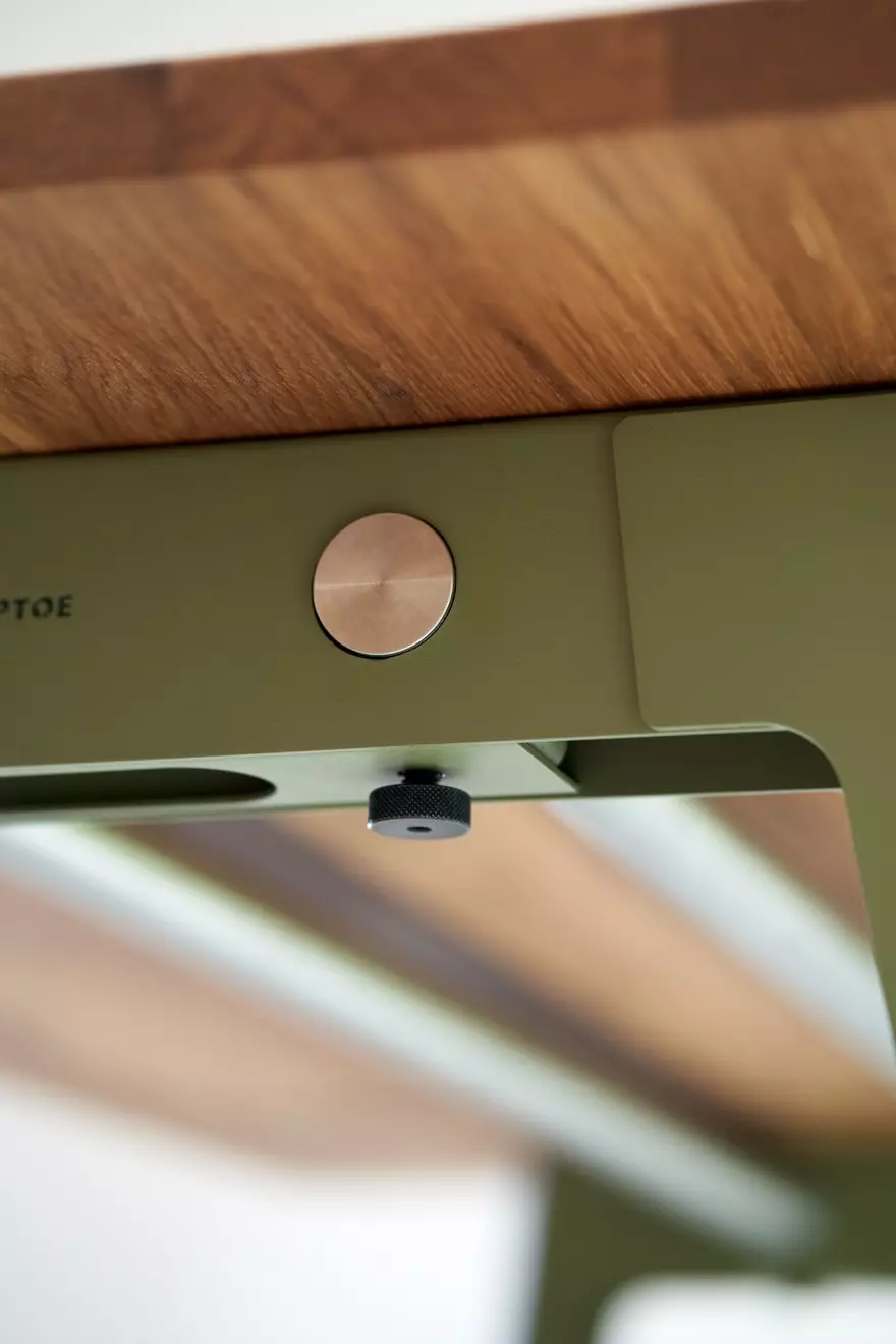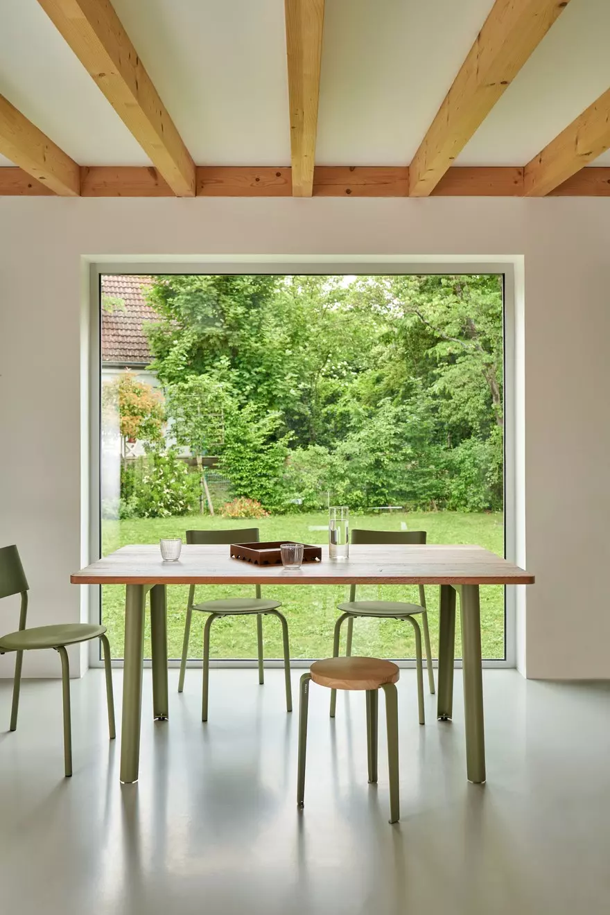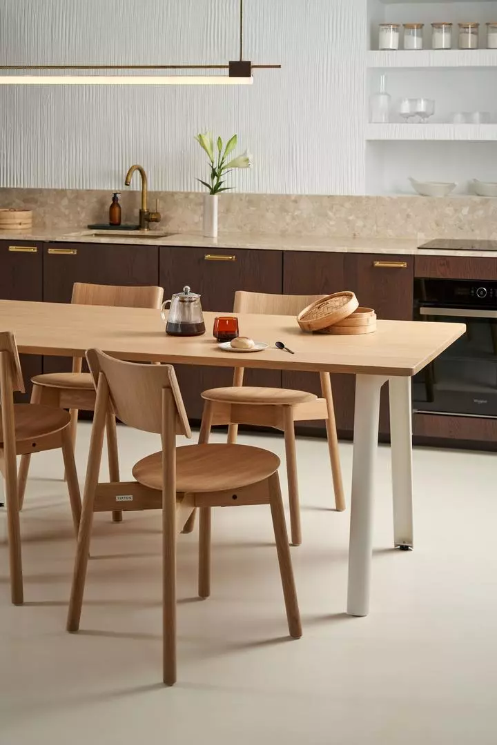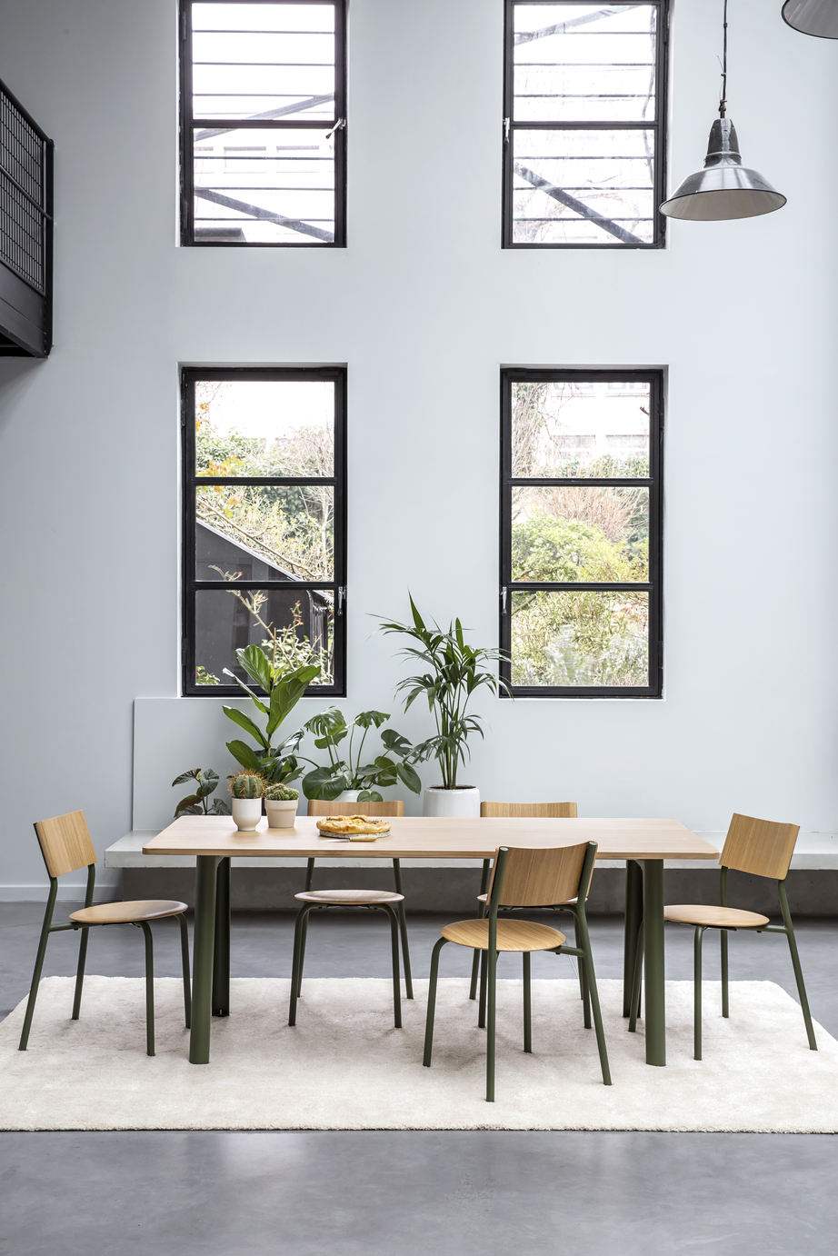 Die Tischplatte wird in verschiedenen nachhaltigen Materialine angeboten: aus ökozertifiziertem Massivholz mit Eichenfurnier, einer Birkemultiplexplatte mit weißem Laminat, recyceltem Holz und recyceltem Kunststoff.