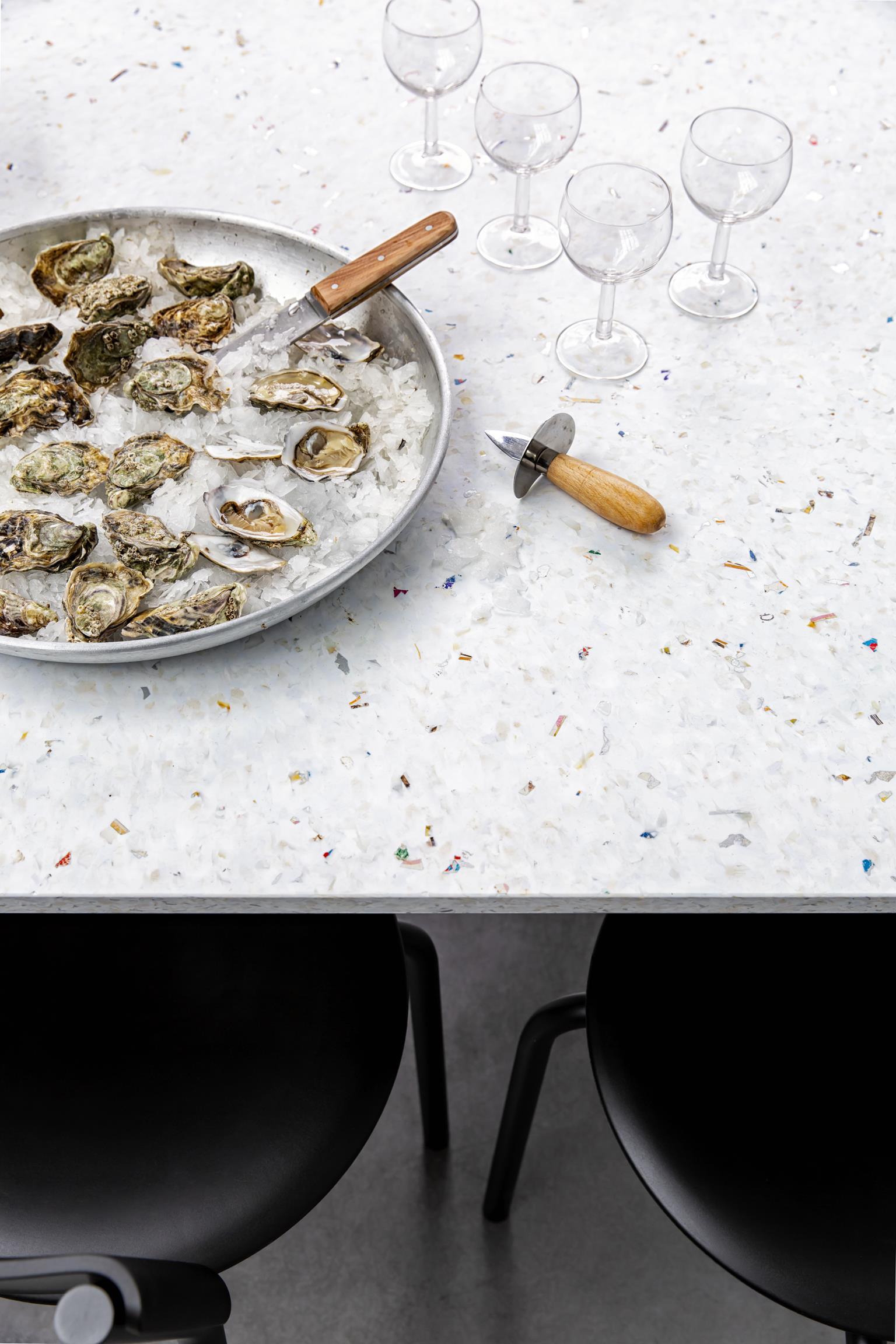 - Tischplatte aus recyceltem Kunststoff, die aus dem Abfall von Hunderten von Joghurtbechern hergestellt wurde.