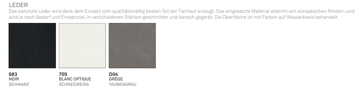 Das Gestell in Chrom kann mit Leder Weiß, Taubengrau oder Schwarz bestellt werden.