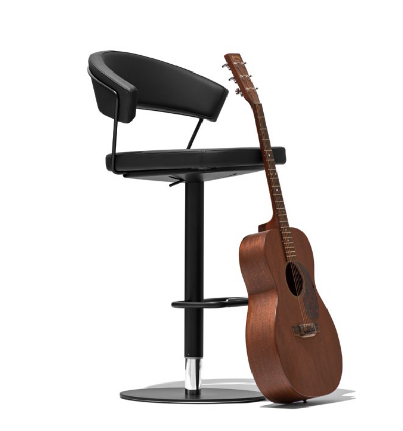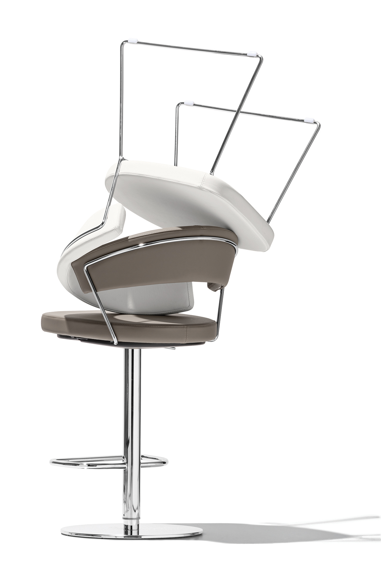 Die einhüllende Rückenlehne und große Sitzfläche dieses Hockers mit Bezug sorgen für optimalen Sitzkomfort. Der Bezug wird aus echtem Leder gefertigt. Der drehbare Hocker mit verchromter Fußstütze und Gasfeder-Höhenverstellung wird durch den beschwerten runden Fuß gestützt, der maximale Stabilität gewährleistet.