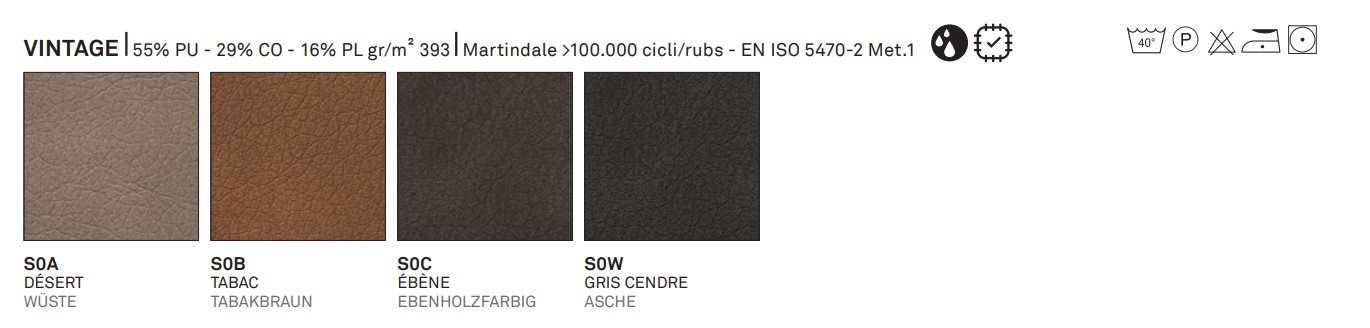 Vintage - das bessere Leder. Dieses lederähnliche Material, fühlt sich angenehm weich an. Dank der innovativen Materialzusammensetzung vereint der Bezug alle positiven Eigenschaften von Echtleder und lässt dabei die Schwächen außen vor. Vintage wärmt sich schnell auf und hat einen perfekten modernen "Used Look".