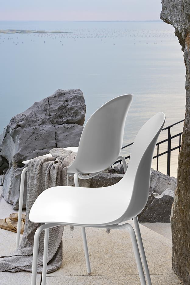 Er ist aus recyceltem Polypropylen in sieben verschiedenen Farbvarianten gefertigt und wird mit einem 4-Bein-Holz oder Metallgestell für den Außenbereich kombiniert. Die Sitzschale ist mit oder ohne Armlehnen verfügbar.