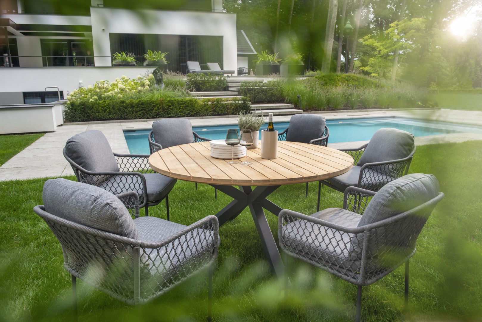 Teak, Aluminium, Edelstahl, pulverbeschichteter Stahl, Polyrattan/HDPE sowie HPL/Keramik sind UV- und witterungsbeständig.
