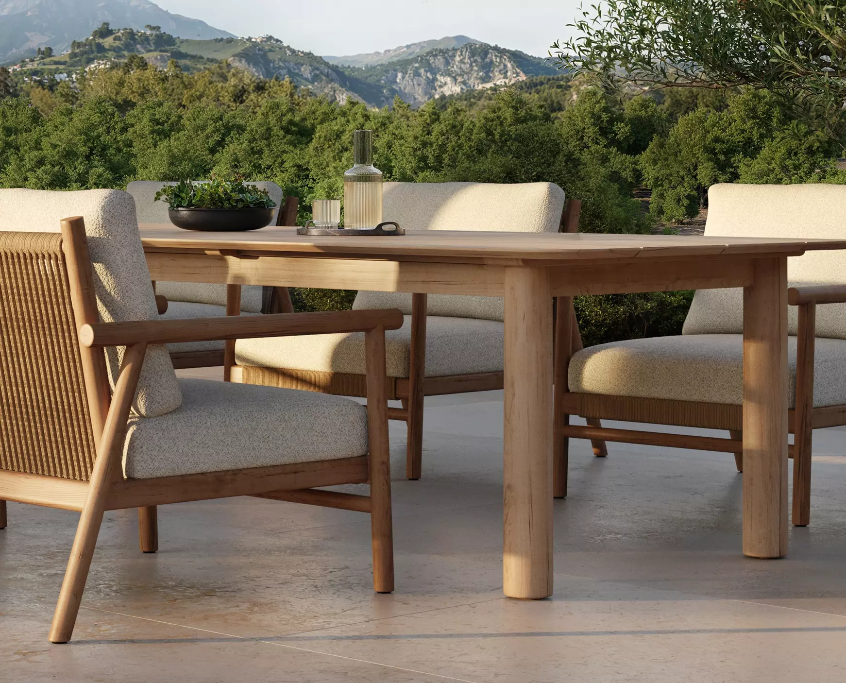Die wunderschöne Teakholzplatte der Palma-Tische besteht aus mehreren sorgfältig verbundenen Elementen, während die runden Beine für eine solide Stabilität sorgen. Besonders der beeindruckende Low-Dining-Tisch mit einer Länge von 3,77 Metern bietet großzügigen Platz für gesellige Runden.