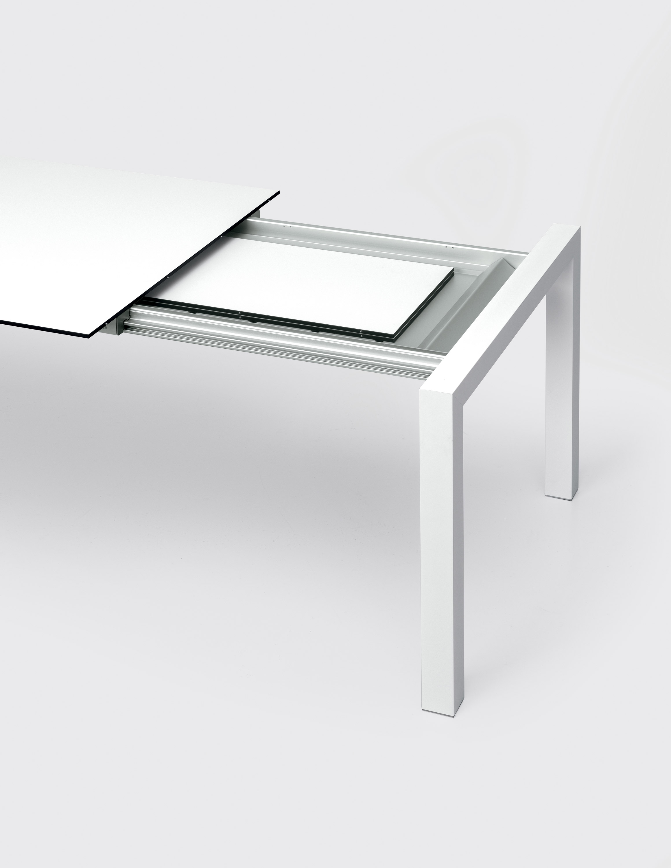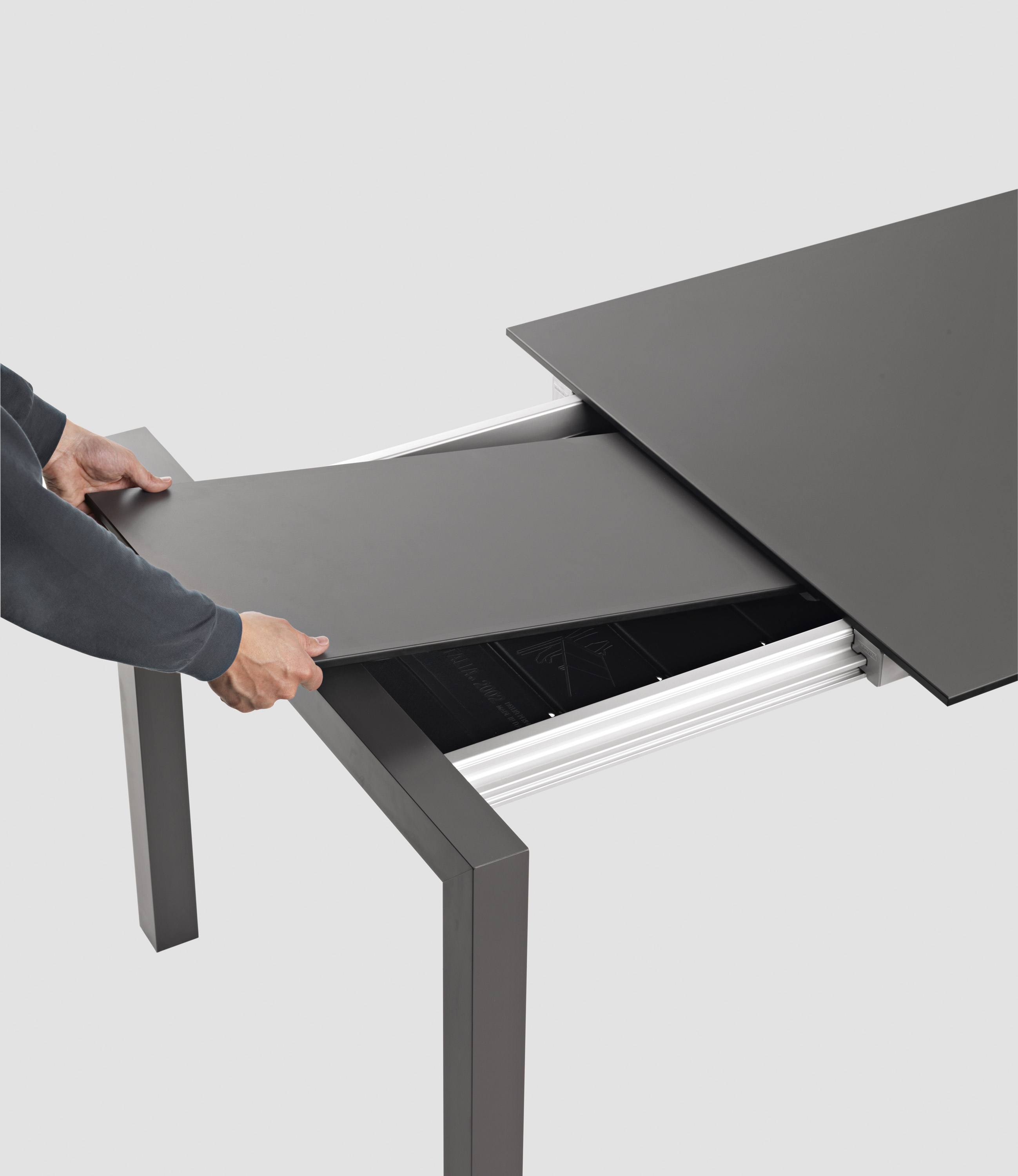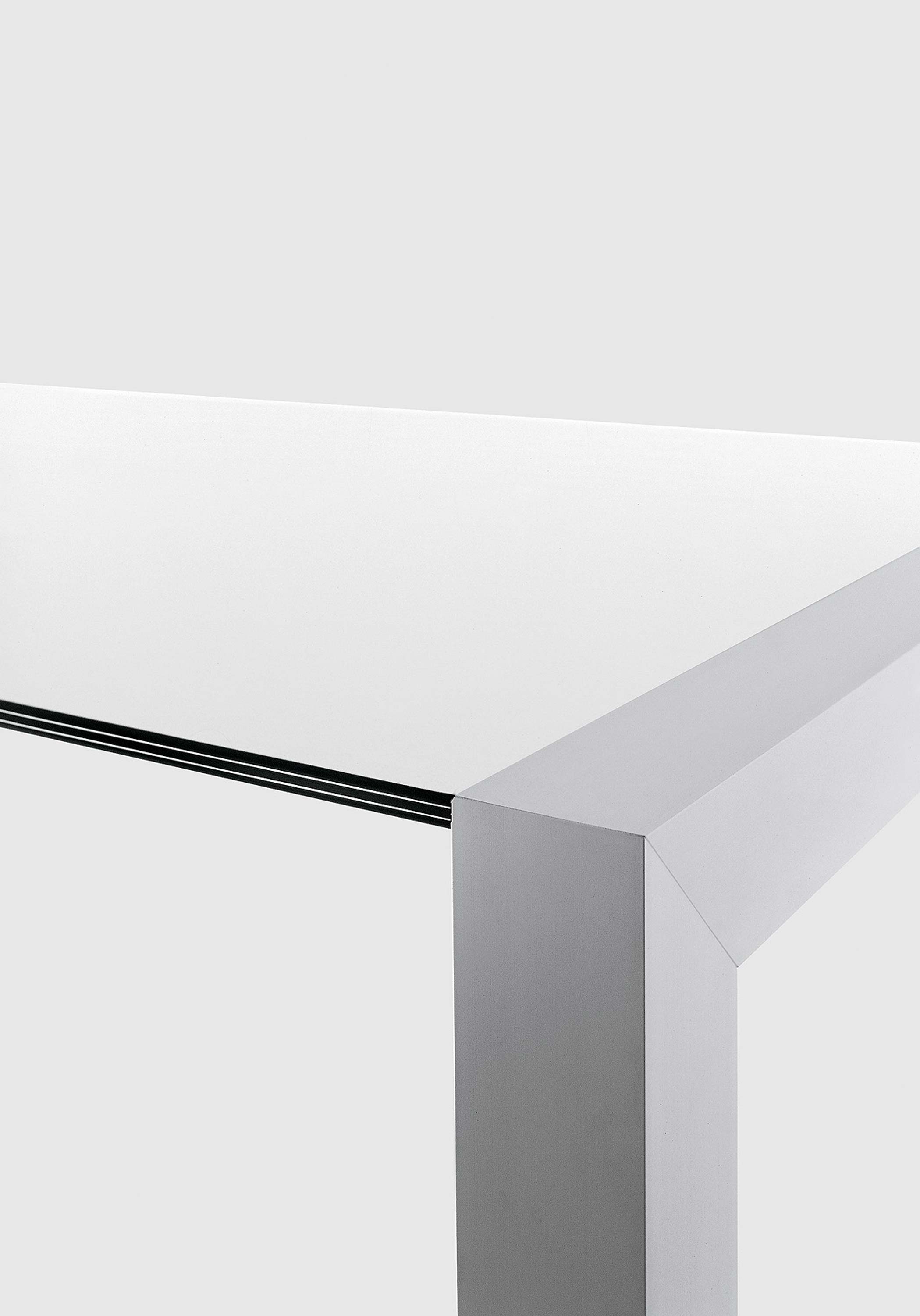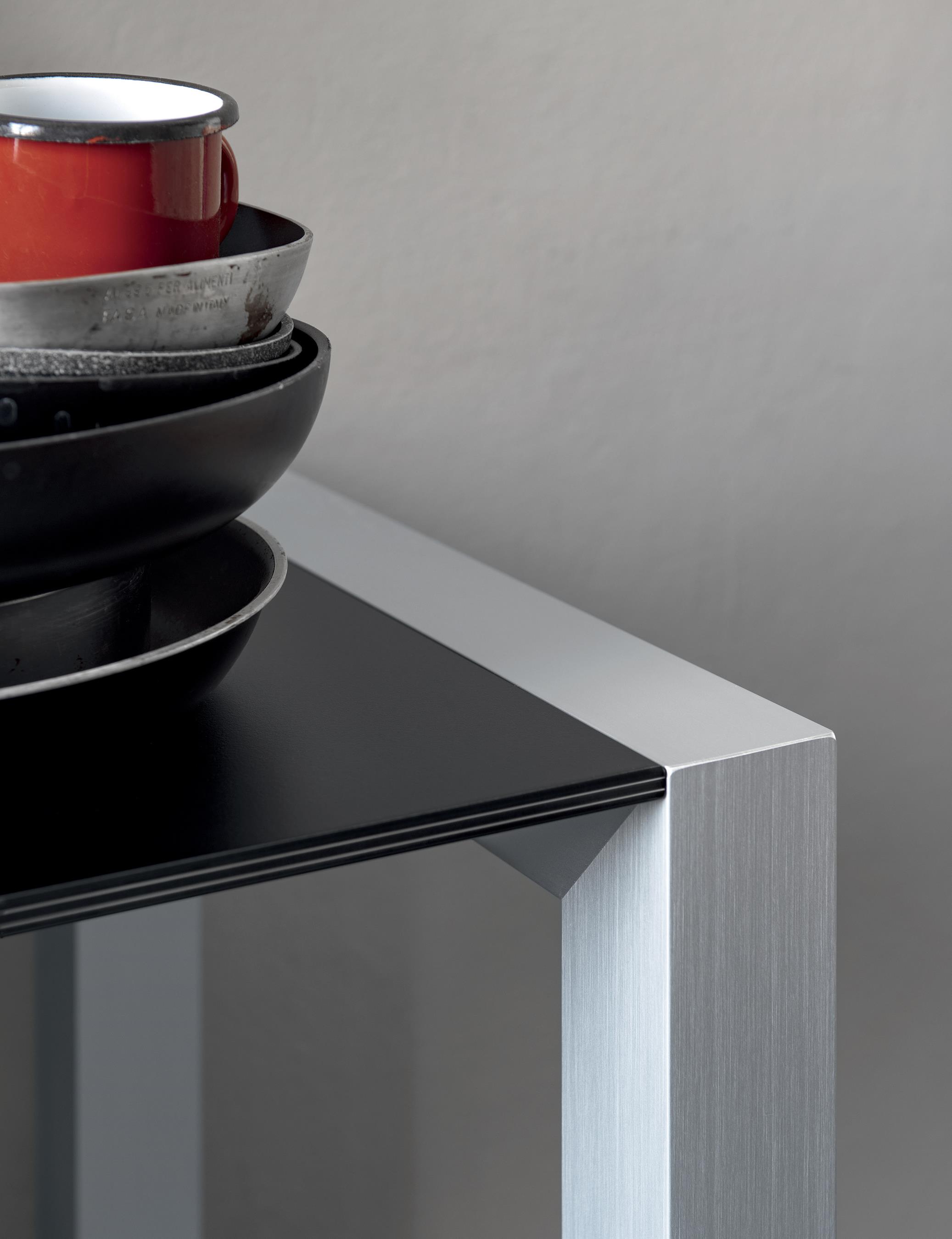 Rahmen und Beine aus eloxiertem stranggepresstem Aluminium 6×6 cm können in Kontrastfarbe oder lackiert im Farbton der Platte gewählt werden.