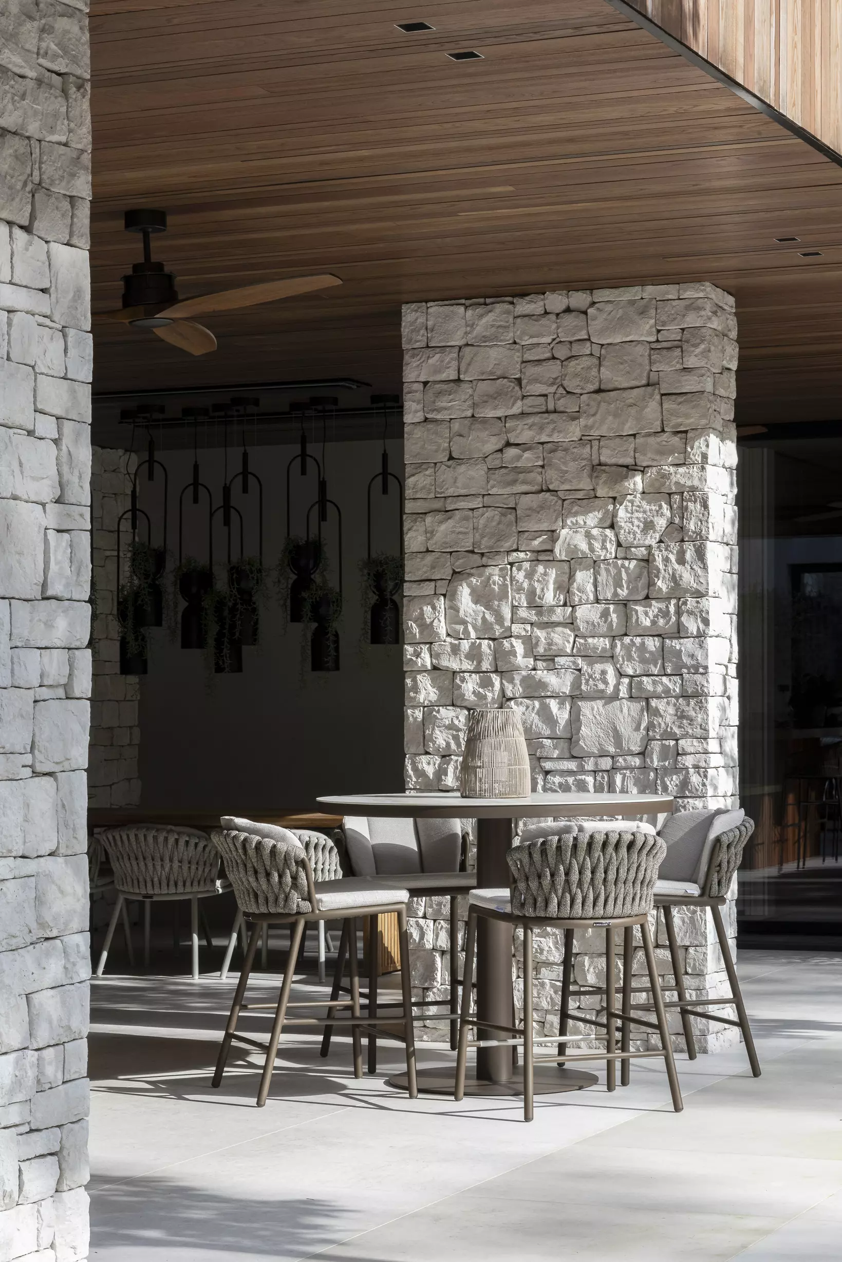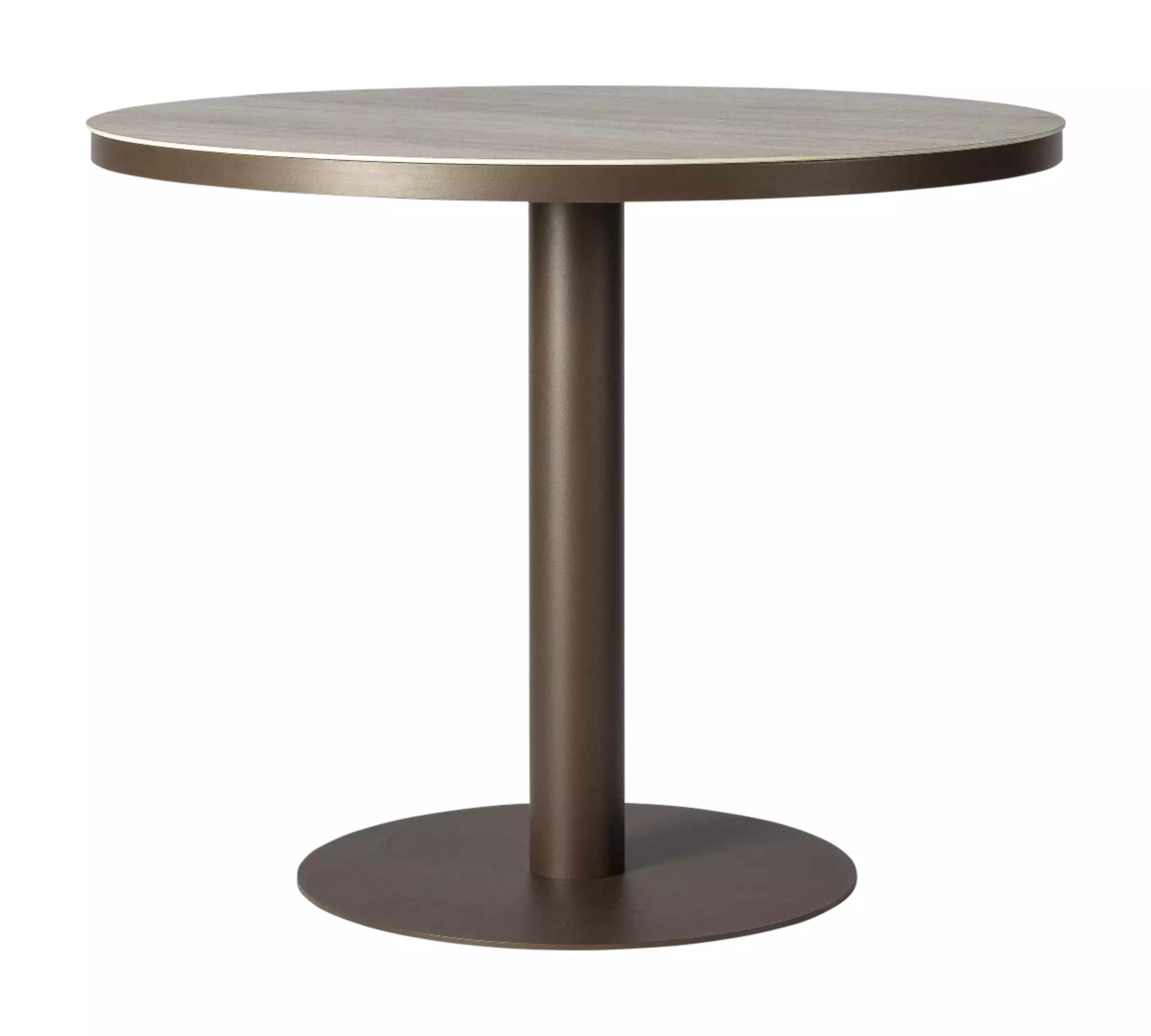 Das Aluminiumgestell ist in den Farben Linen und Bronze erhältlich und lässt sich mühelos mit modernen Designerstühlen oder klassischen Modellen kombinieren.