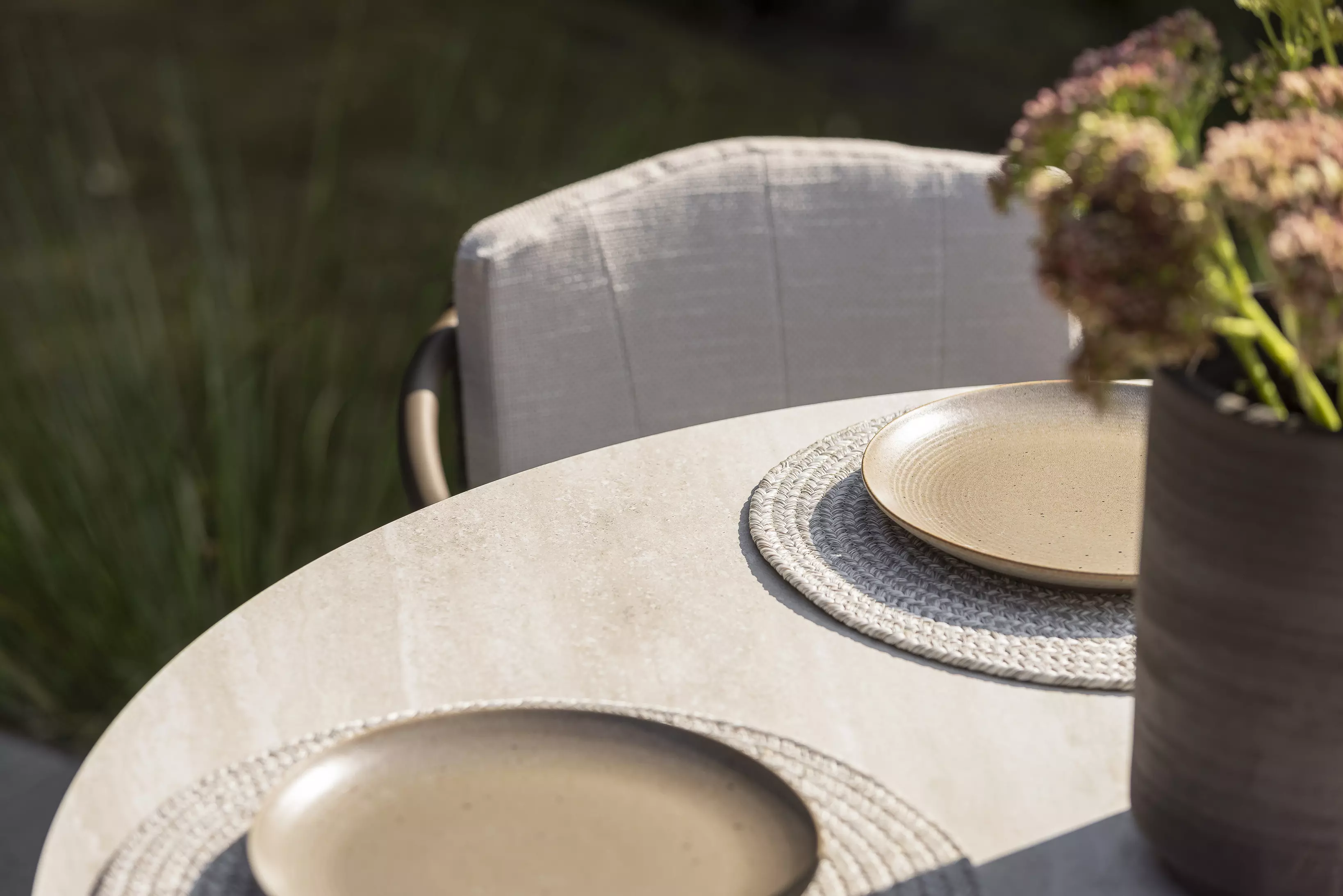 Die keramische Tischplatte in Travertinfarbe besitzt eine fühlbare Textur, die ihr das Aussehen von echtem Naturstein verleiht.