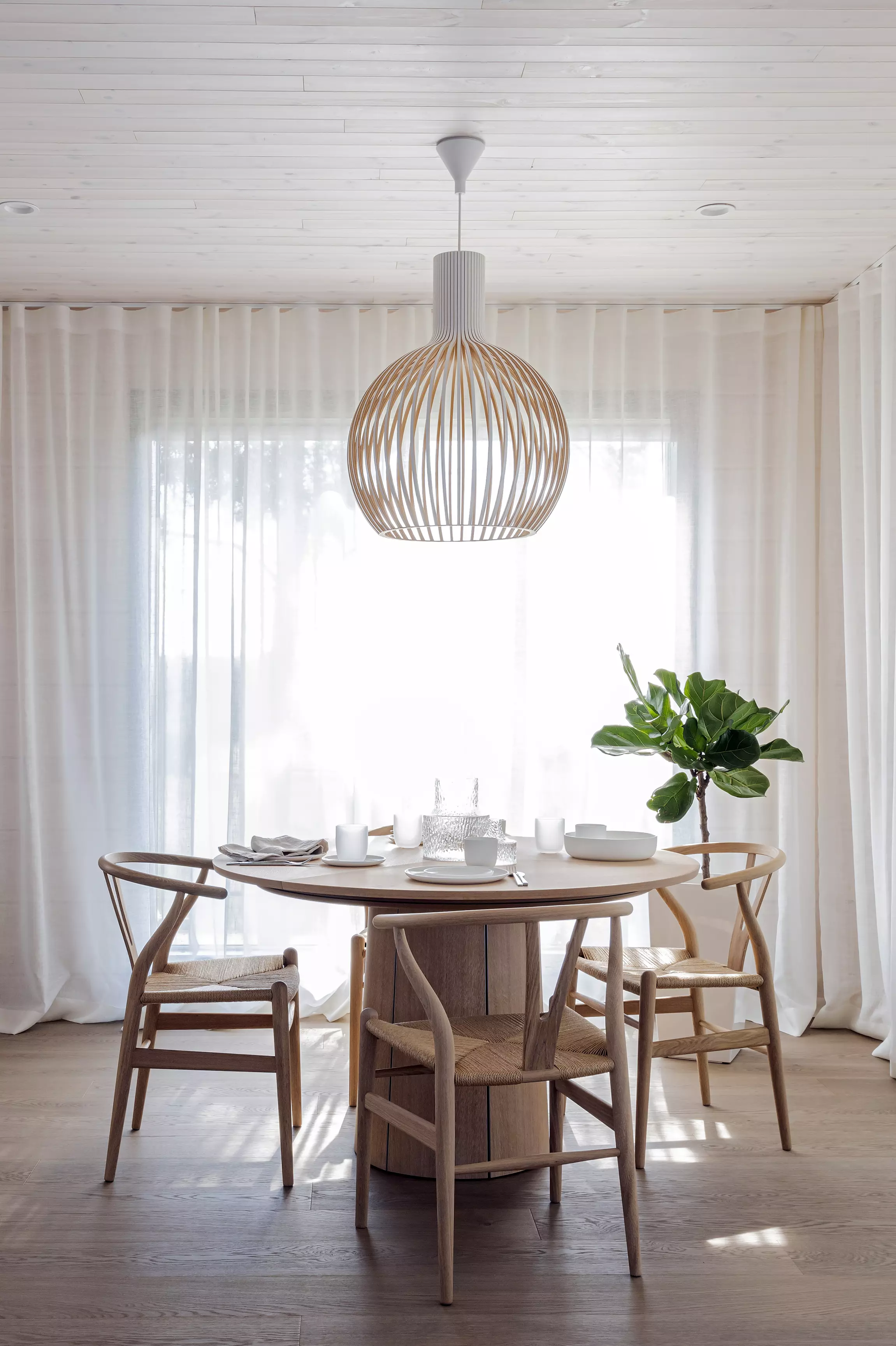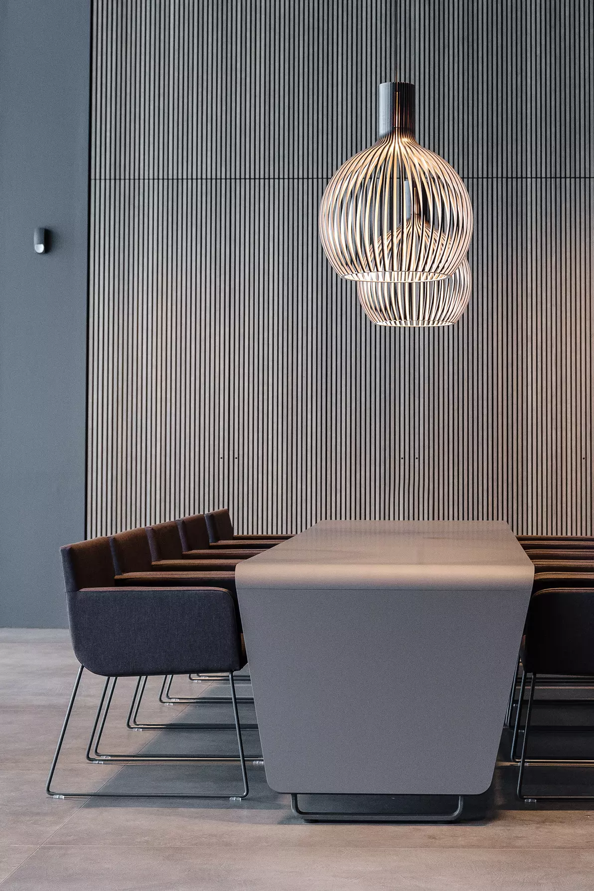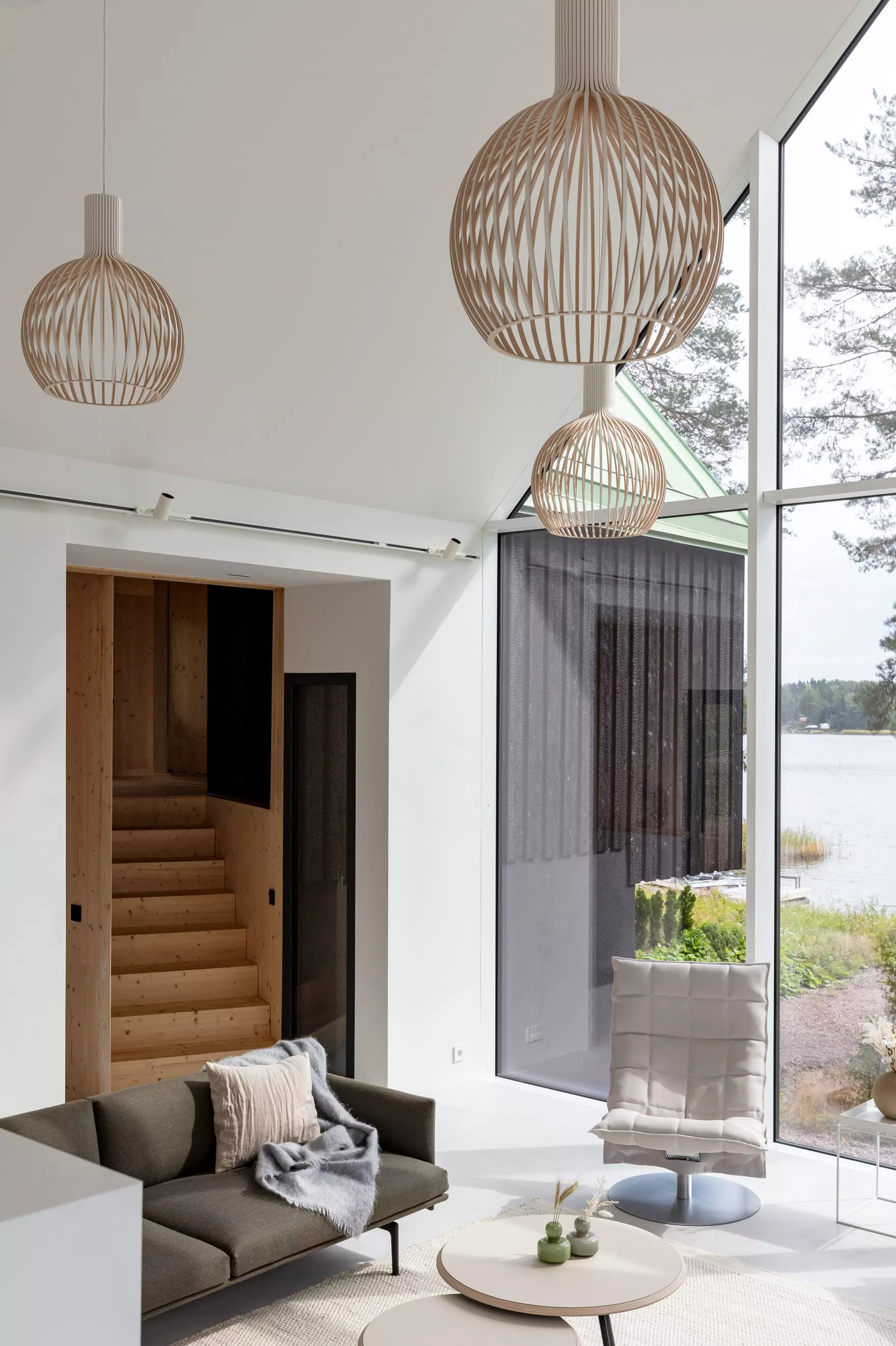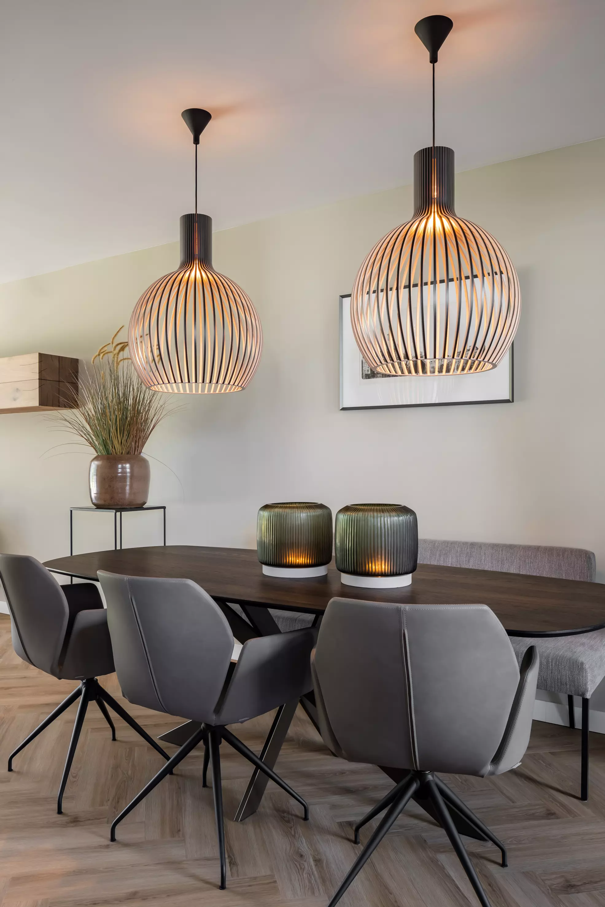 Die Birkenholz Lamellen werden um Ringe aus Flugzeugsperrholz angeordnet und sorgen für atmosphärisches Licht im Einklang mit der Natur.