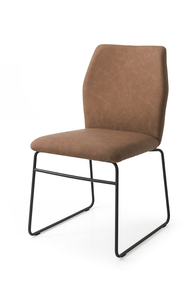 Stuhl Modell New York mit Metallgestell. Sitzfläche und Rückenlehne gepolstert mit Bezug Vintage, einem angenehm weichen, lederähnlichen Material. Gleiter aus stoßfestem, transparentem Gummi unten am Freischwingergestell. Die gepolsterte geschwungene Rückenlehne und die breite gepolsterte Sitzfläche machen diesen Stuhl ausgesprochen komfortabel. Ideal für die Einrichtung vom Essbereich oder vom Büro: wählen Sie die Ausführung, die Ihnen am besten gefällt.