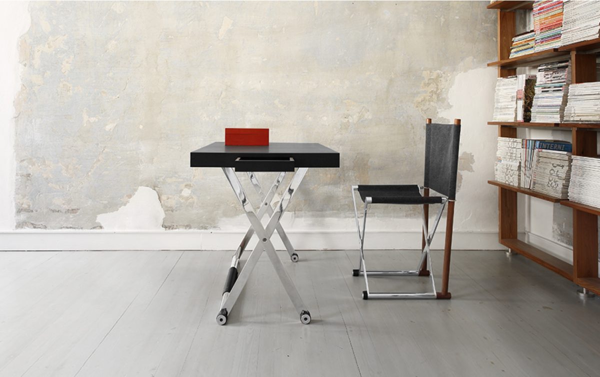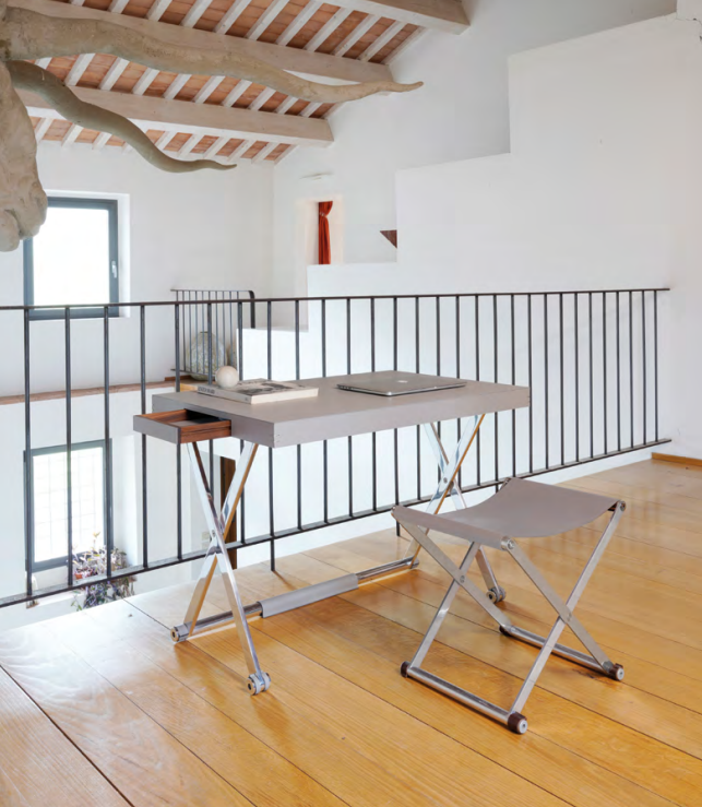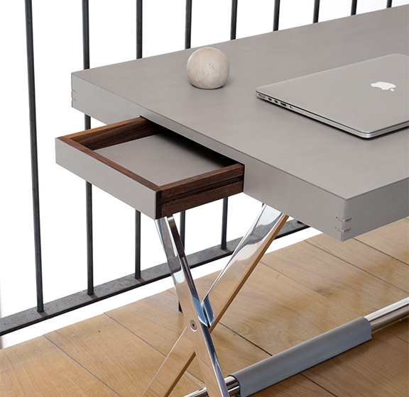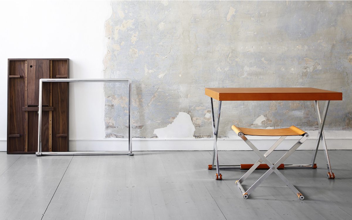 Die obere Platte ist aus Holz mit Leder bezogen, die Struktur aus gebürstetem, poliertem Aluminium.
