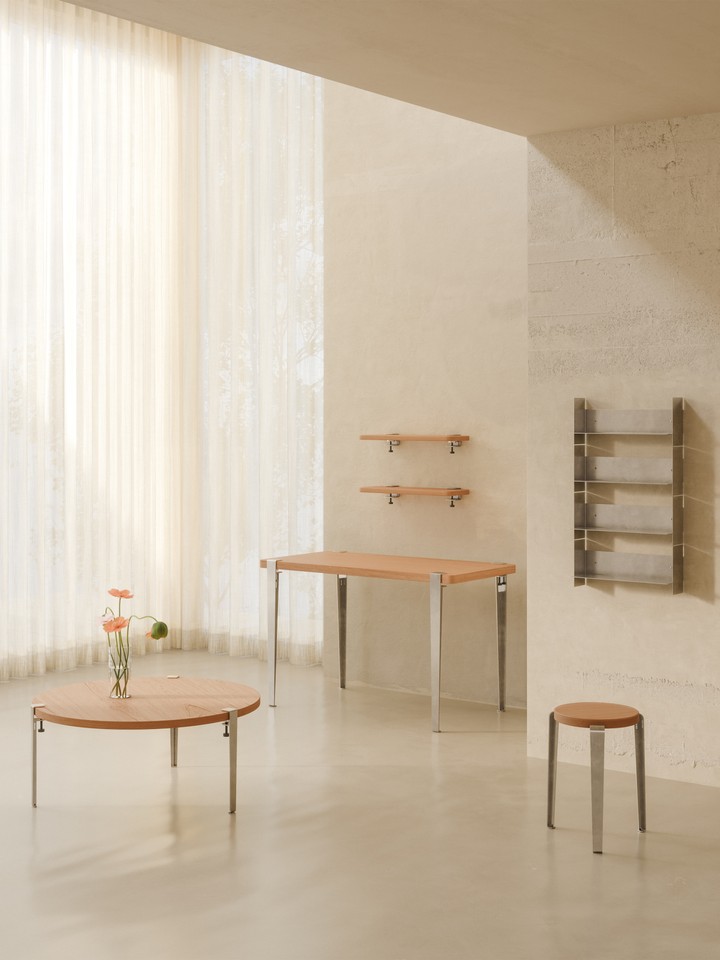 Die Tische und Regale der Kollektion überdauern die Zeit und sind so konzipiert, dass sie über mehrere Generationen hinweg funktionstüchtig sind. Dies nennt man einen zirkulären Ansatz. Man verarbeitet einen bereits vorhandenen Rohstoff, der seinerseits am Ende seines Lebenszyklus wiederverwertet werden kann.
