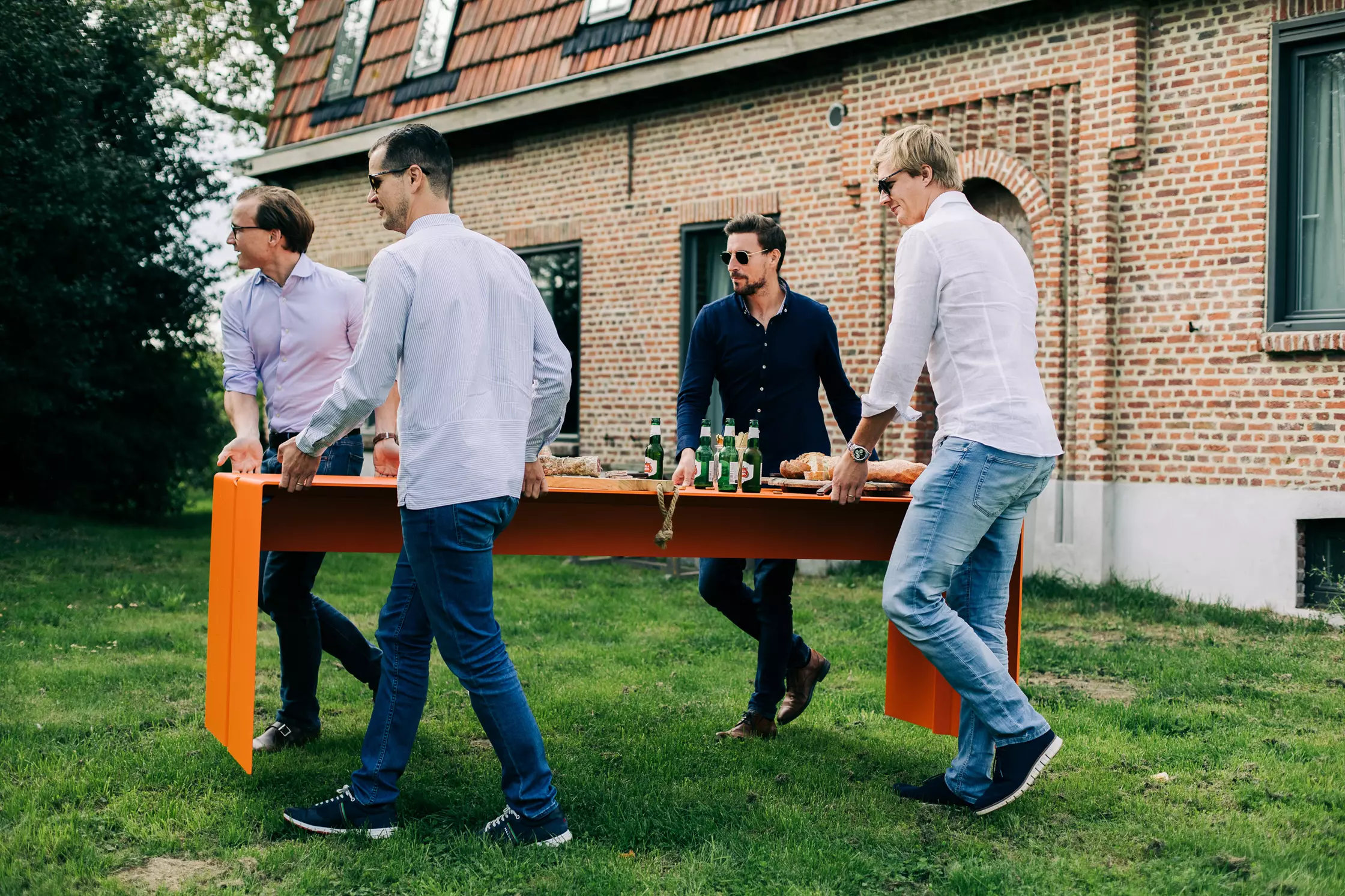 Der Tisch ist für den Aussenbereich entwickelt worden, kann aber auch indoor verwendet werden.