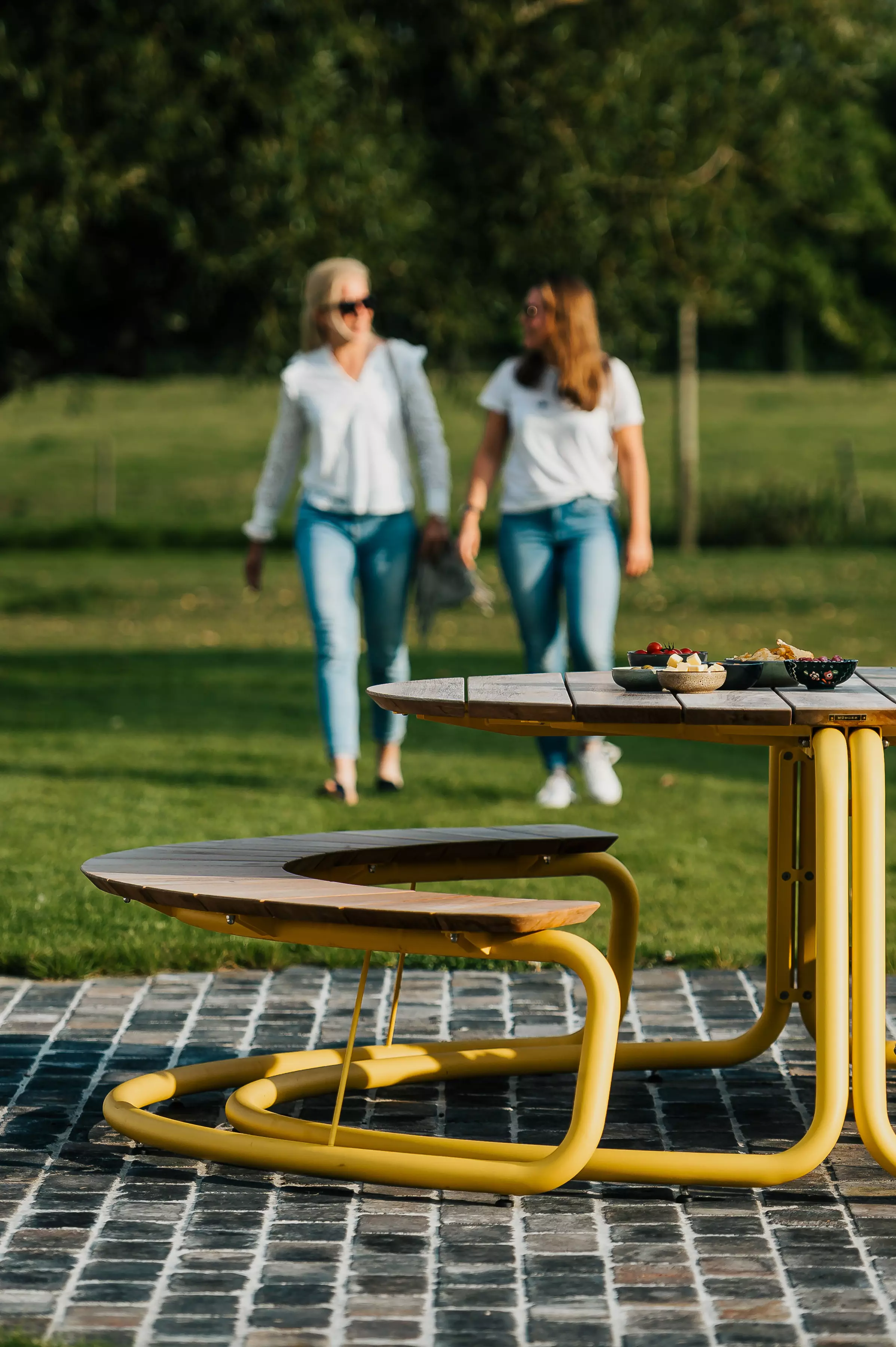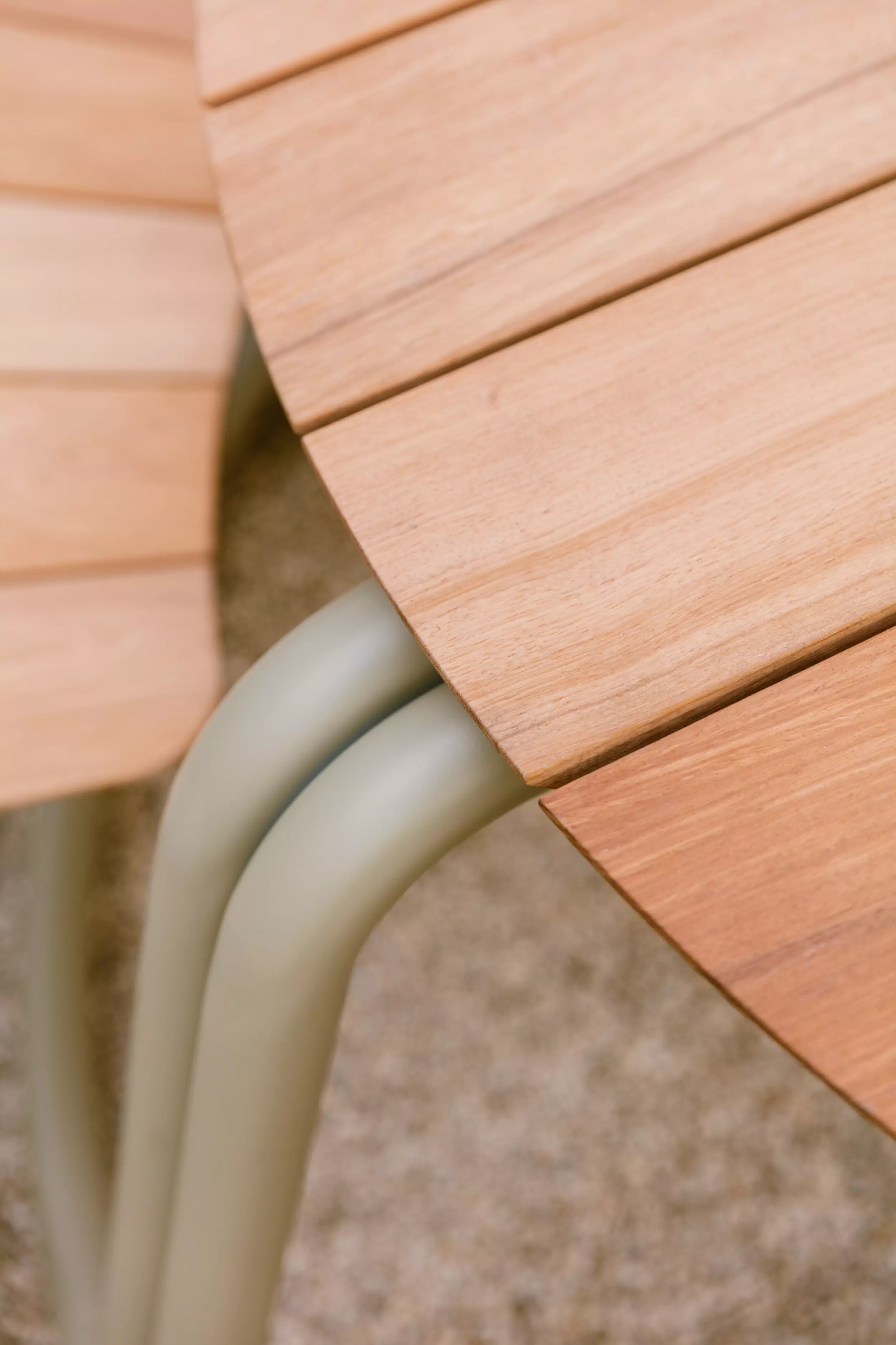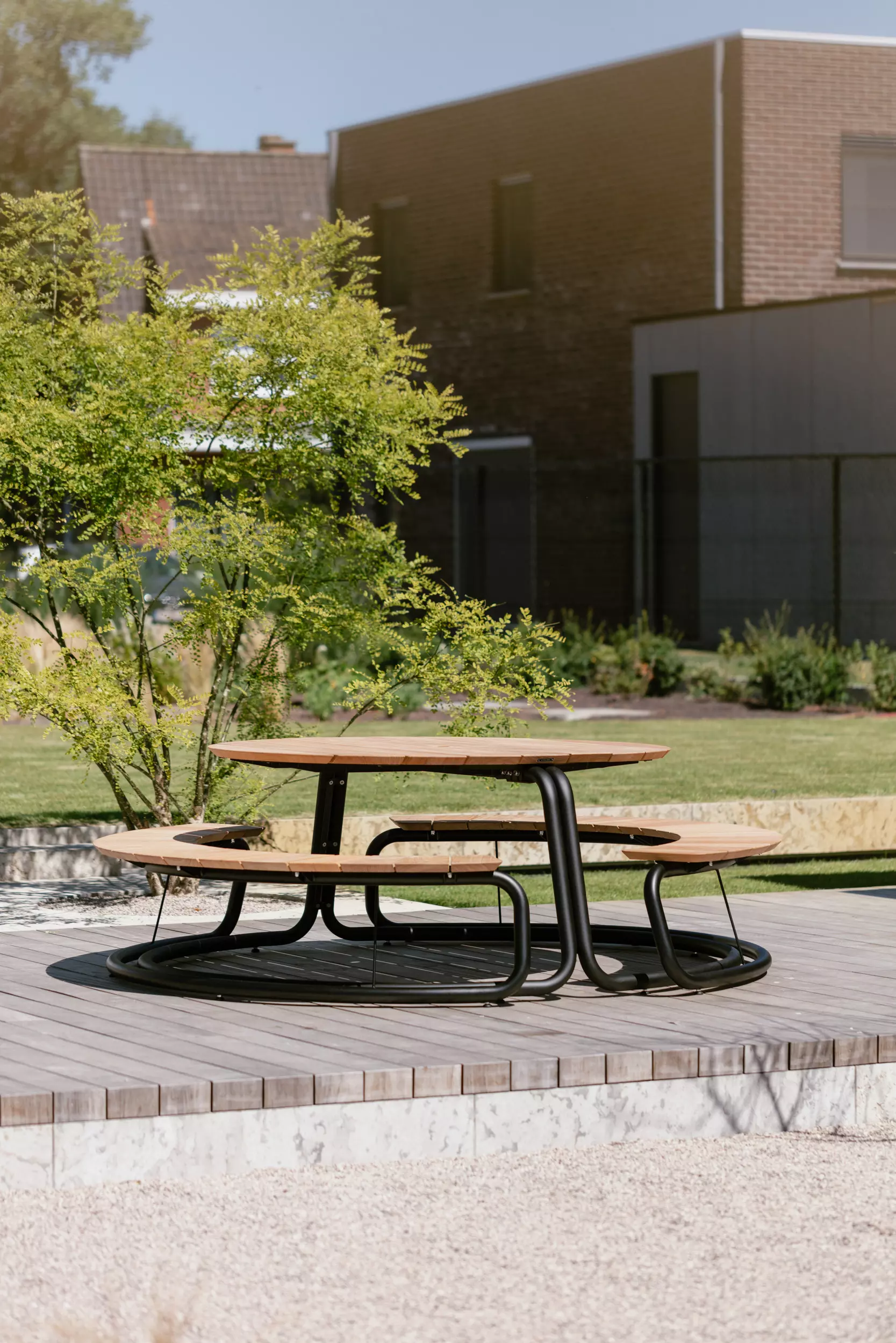 The Circle bildet eine schöne Kombination aus langlebigem Afzelia-Holz und pulverbeschichtetem Stahl. Tischplatte und Sitzflächen erzeugen ein einheitliches Bild, während die Rohre The Circle einen modernen Akzent geben. The Circle kann dank seiner verstellbaren Füße auf jede Oberfläche gestellt werden.