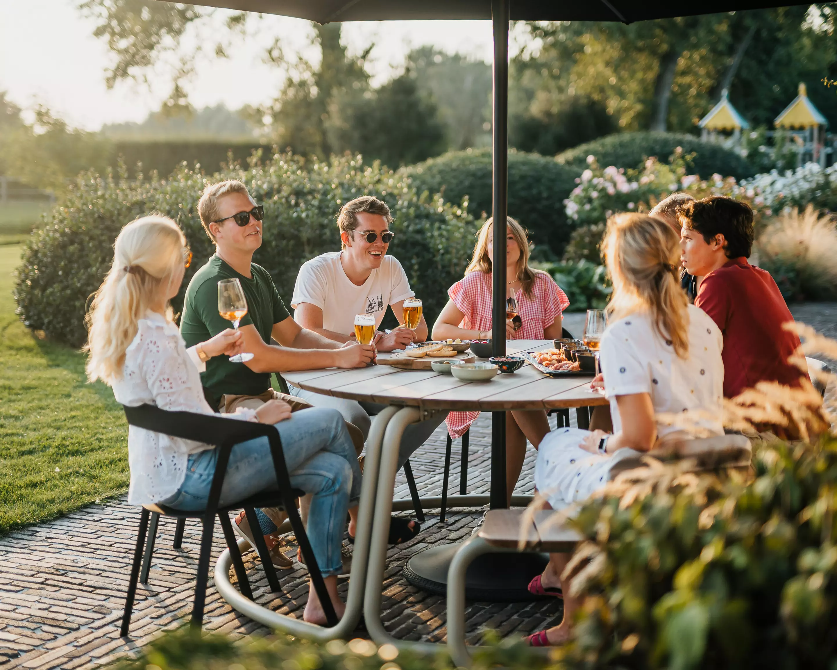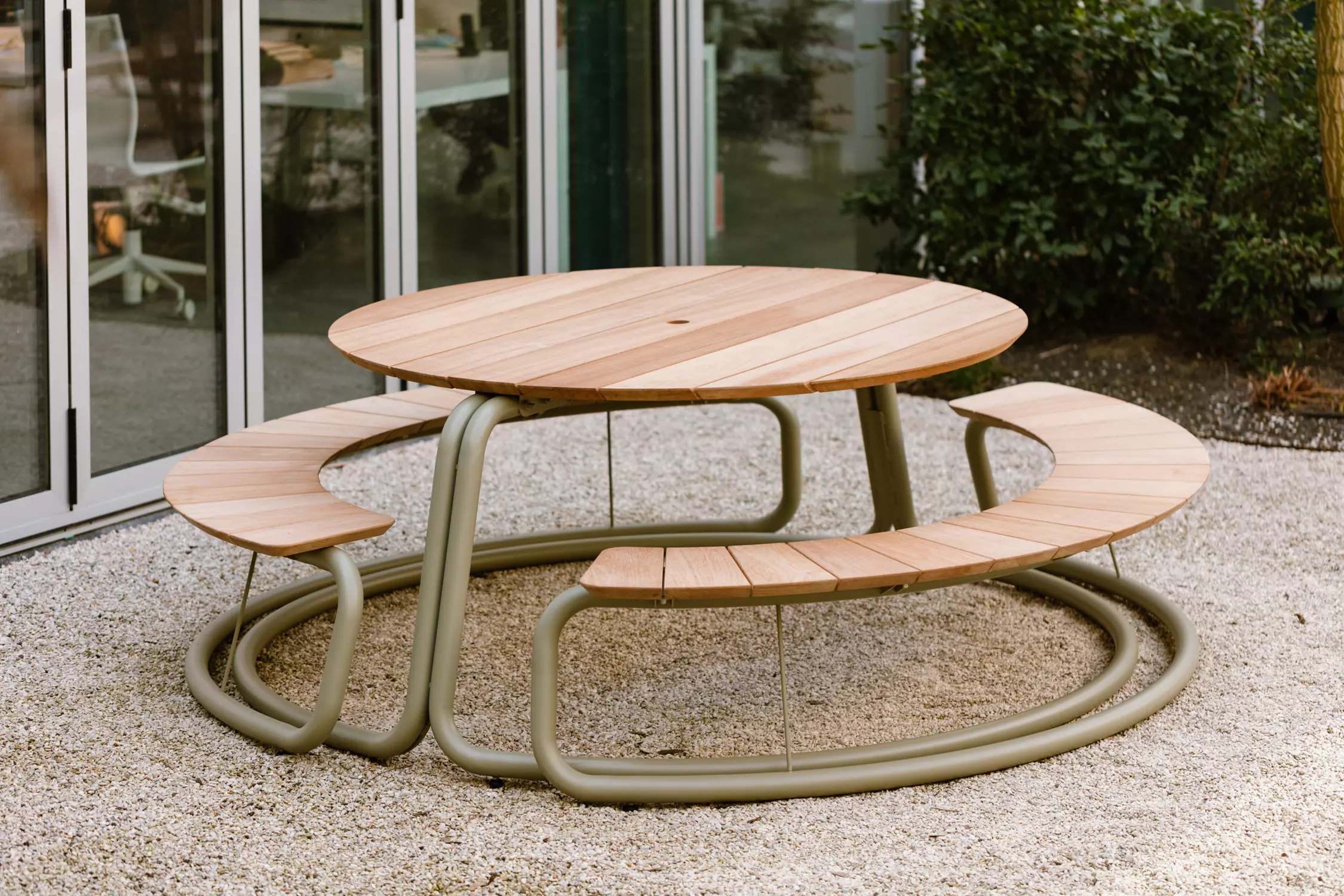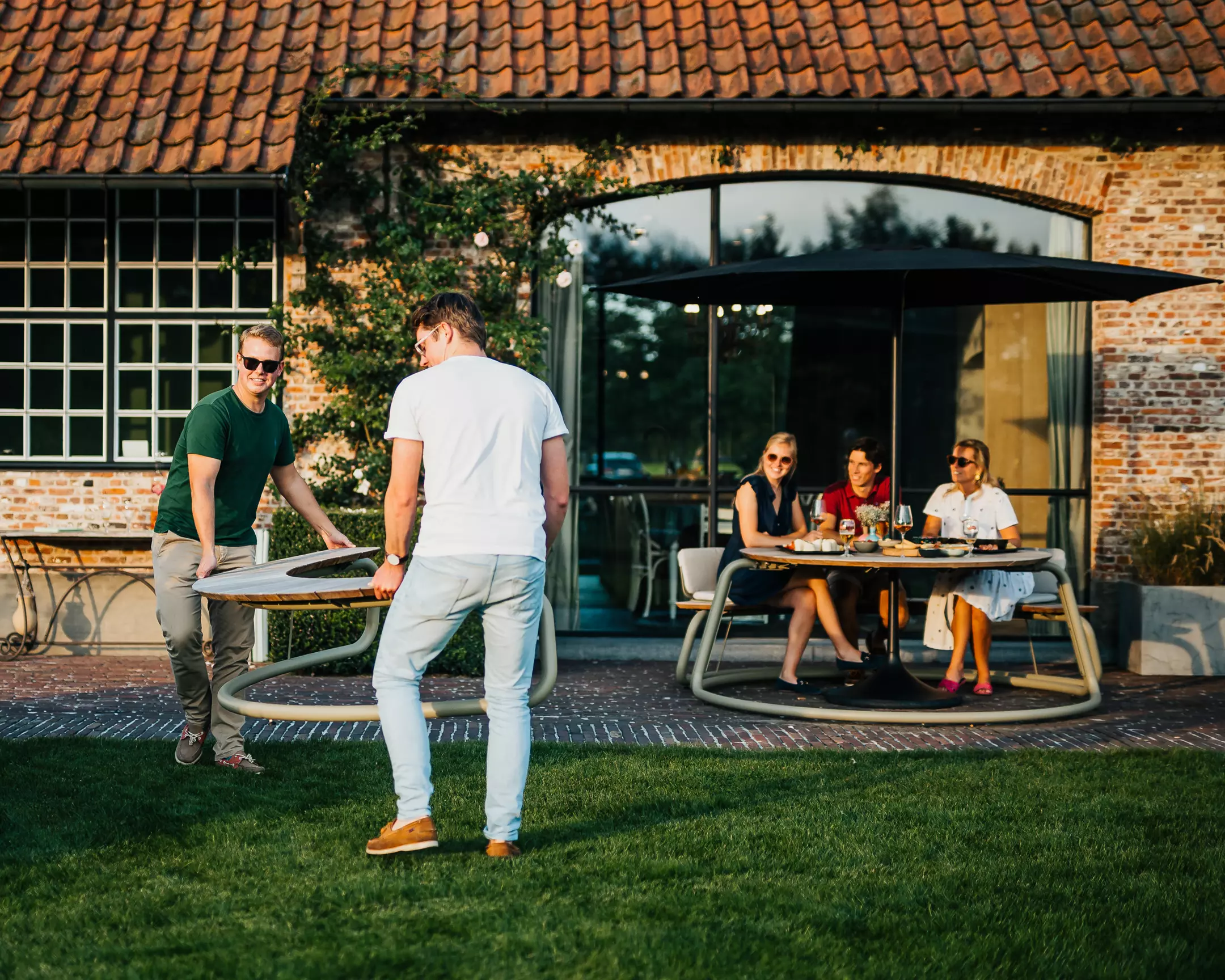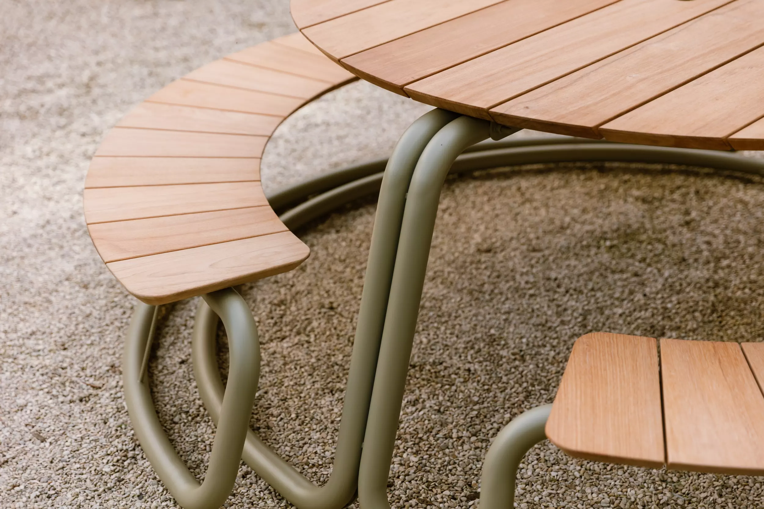 The Circle bildet eine schöne Kombination aus langlebigem Afzelia-Holz und pulverbeschichtetem Stahl. Tischplatte und Sitzflächen erzeugen ein einheitliches Bild, während die Rohre The Circle einen modernen Akzent geben. The Circle kann dank seiner verstellbaren Füße auf jede Oberfläche gestellt werden.