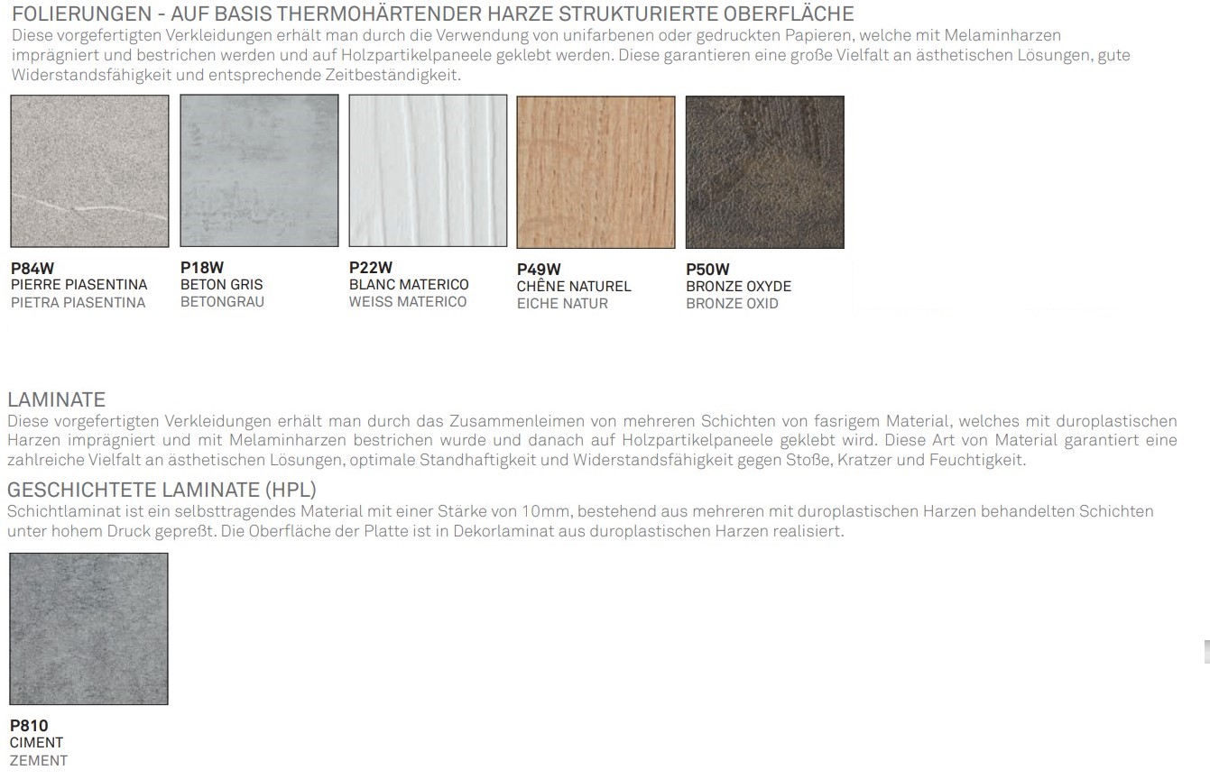 Diese vorgefertigten Verkleidungen erhält man durch das Zusammenleimen von mehreren Schichten von fasrigem Material, welches mit duroplastischen Harzen imprägniert und mit Melaminharzen bestrichen wurde und danach auf Holzpartikelpaneele geklebt wird. Diese Art von Material garantiert eine zahlreiche Vielfalt an ästhetischen Lösungen, optimale Standhaftigkeit und Widerstandsfähigkeit gegen Stoße, Kratzer und Feuchtigkeit.