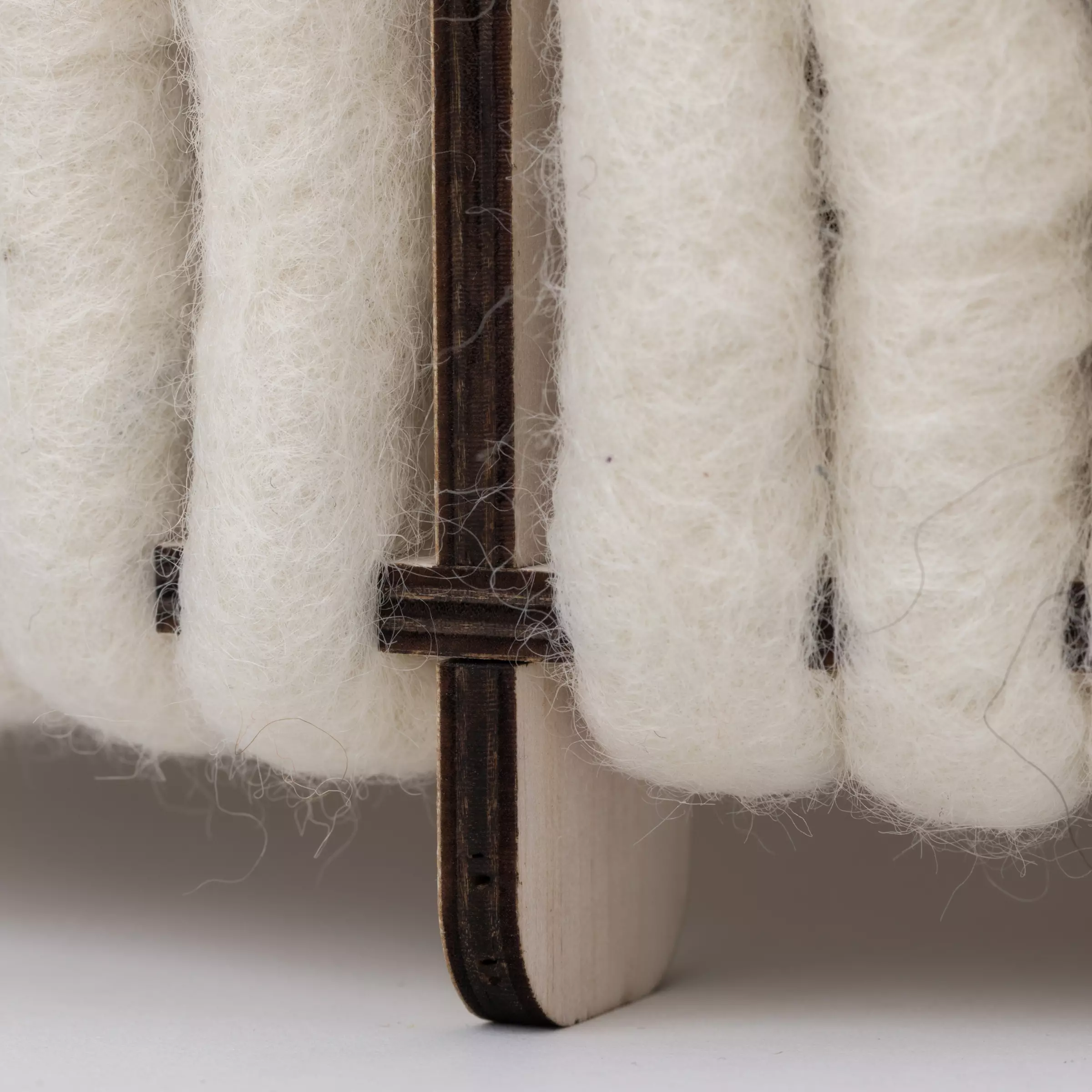 Die Schafwolle stammt von den hochgelegenen Weiden des Ötztals und ist bekannt für ihre außergewöhnliche Robustheit und Langlebigkeit. Ihre Faserstruktur verbessert die Raumakustik und trägt zur Reinigung der Raumluft bei, indem sie Gerüche und Schadstoffe neutralisiert.