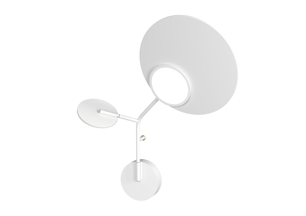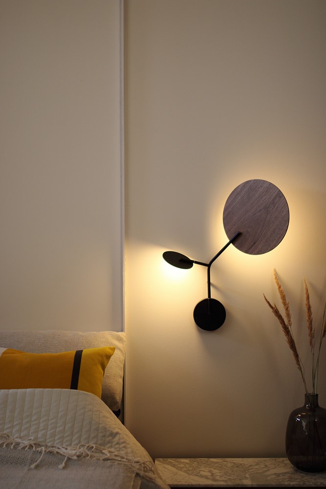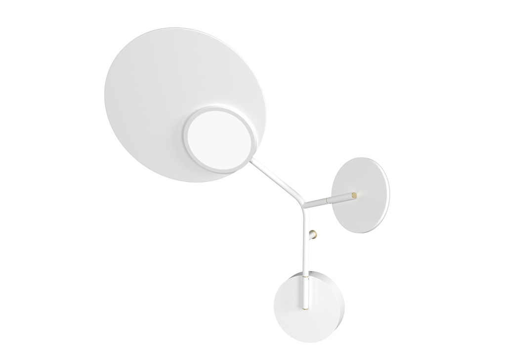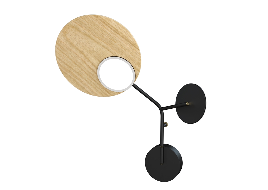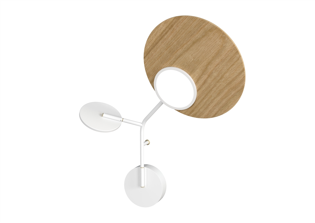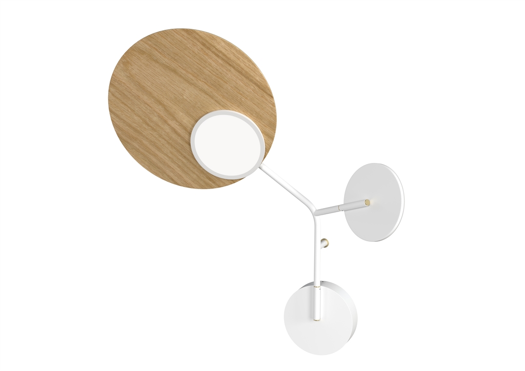 Ballon 3 ist eine Design Wandleuchte mit um 360° beweglichen Armen und farblich individuell kombinierbaren runden Platten, die wahlweise links oder rechts angebracht sind. Die Platten verfügen über 2 LED Panels und sind erhältlich in Schwarz, Weiß oder edlem Eichen- bzw. Walnussholz.