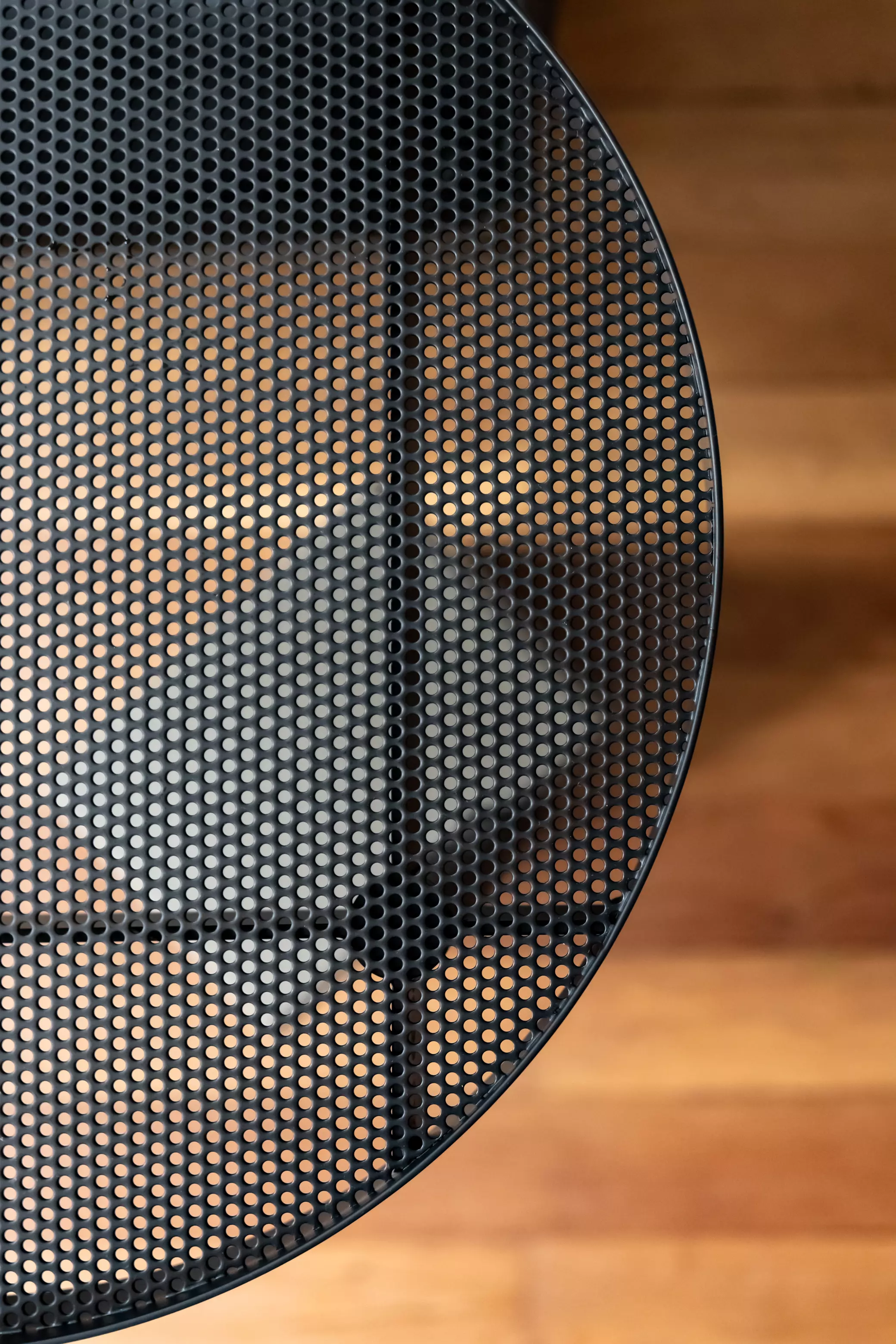 Auf der anderen Seite: Metall. Ein schlankes Stück rundes, durchbrochenes Metall, das drehbare Tablett bringt Feinheit und Bewegung in das Endprodukt.