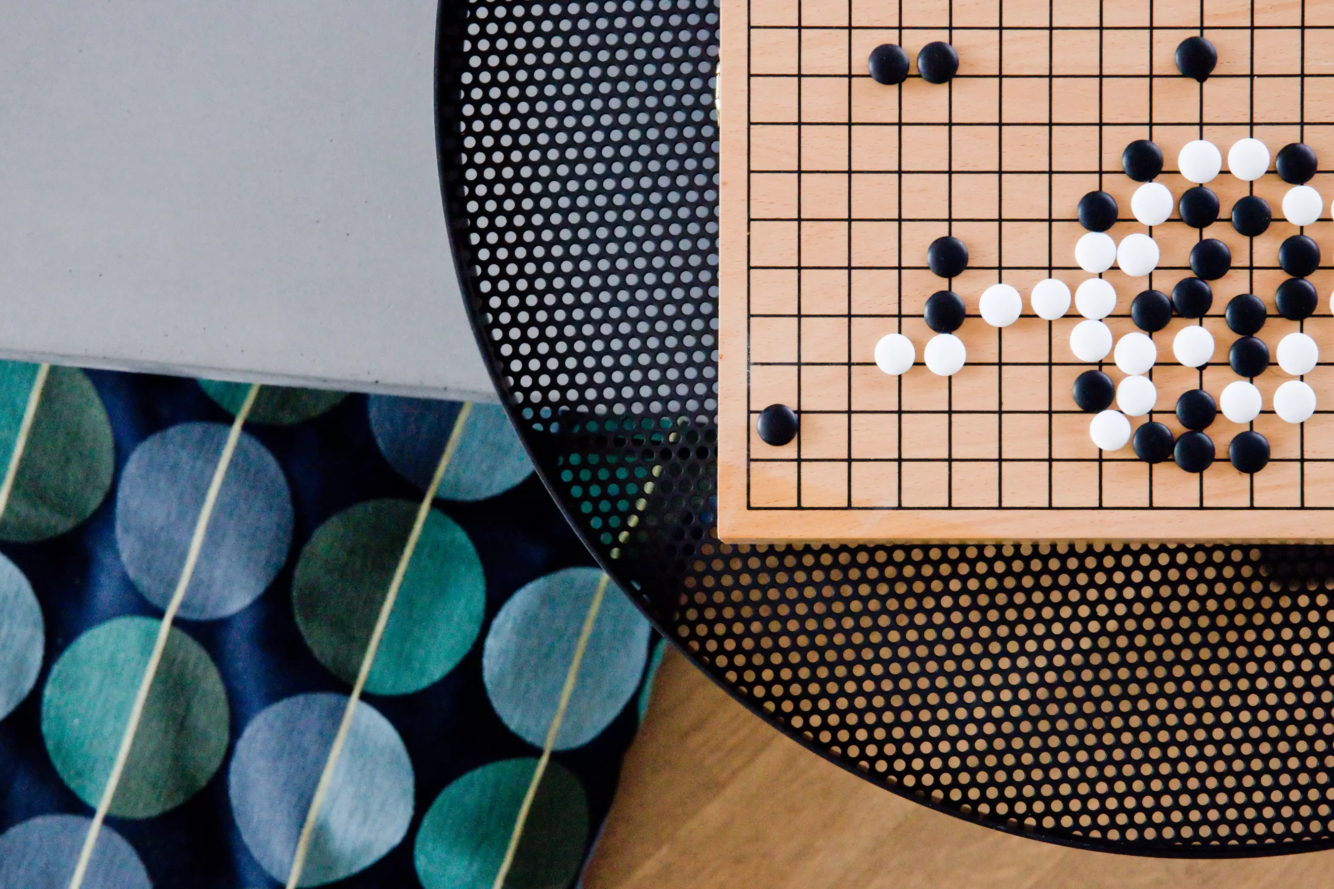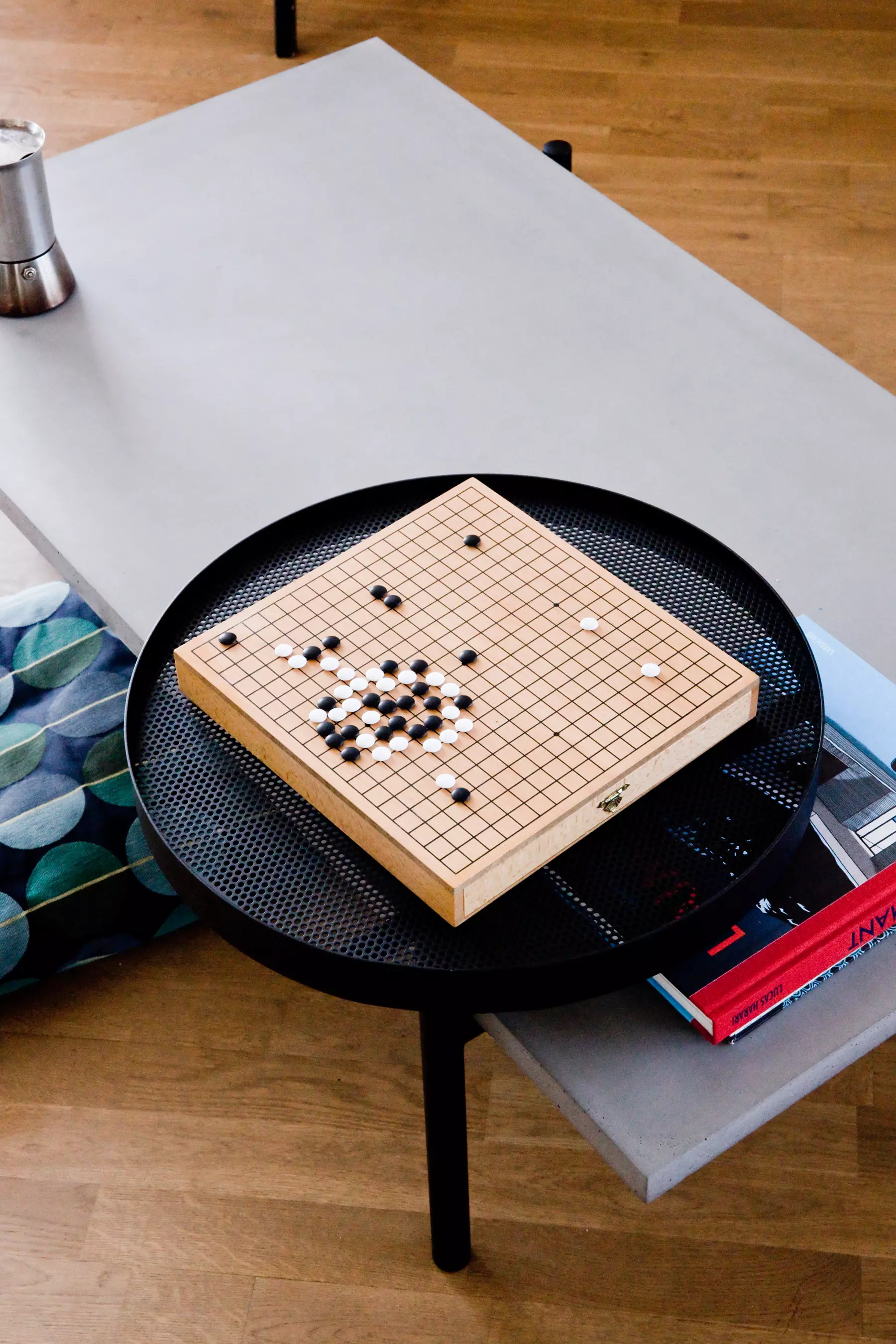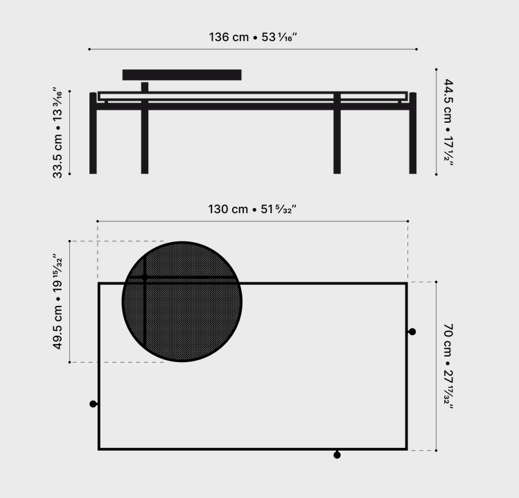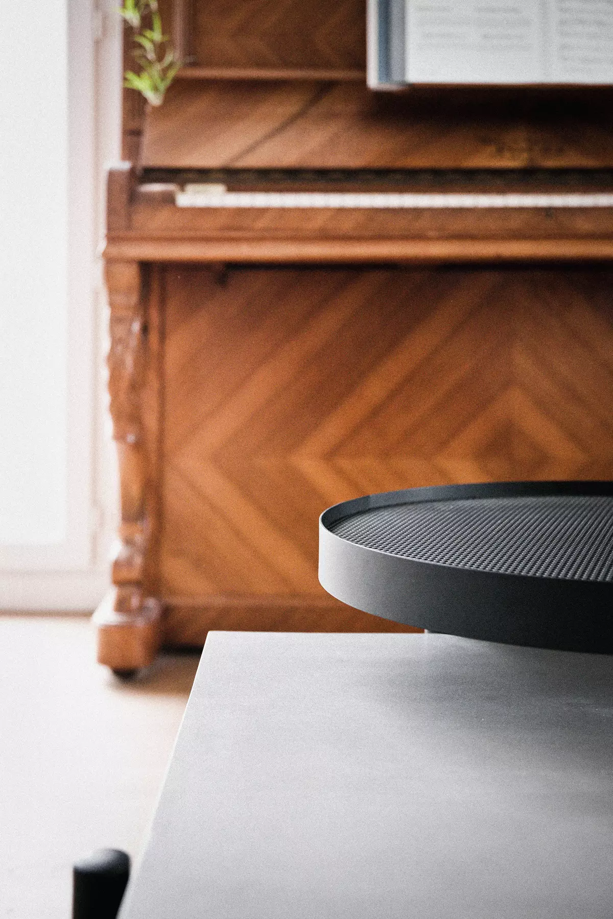Auf der anderen Seite: Metall. Ein schlankes Stück rundes, durchbrochenes Metall, das drehbare Tablett bringt Feinheit und Bewegung in das Endprodukt.