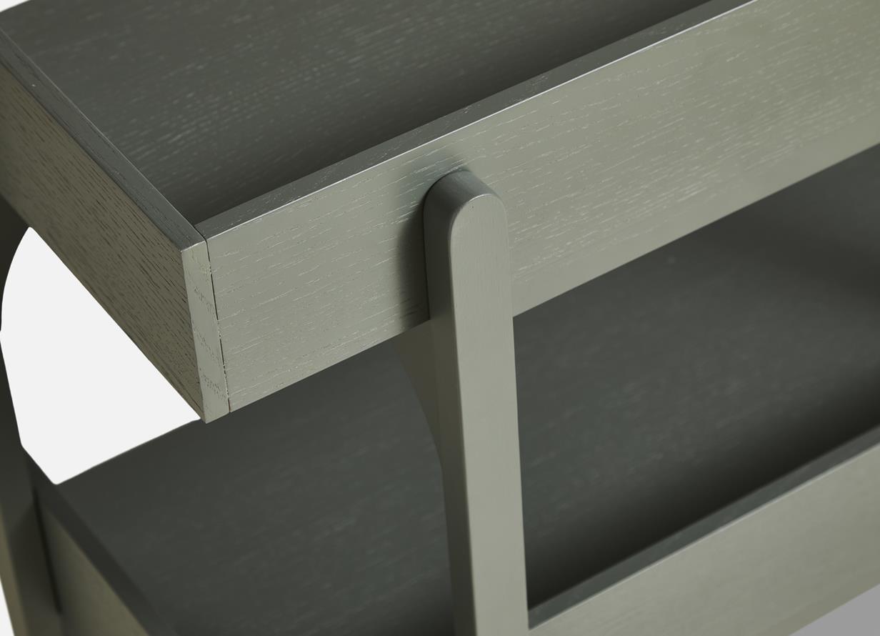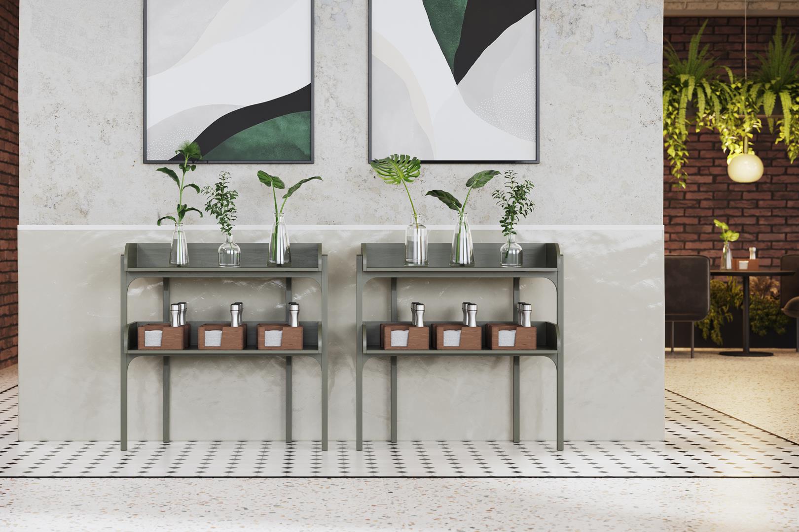 Die beiden kompakten Böden mit drei Seiten ermutigen dazu, ästhetische Stücke und praktische Gegenstände zu verstauen und zu präsentieren, die tagsüber leicht zugänglich sein sollten.