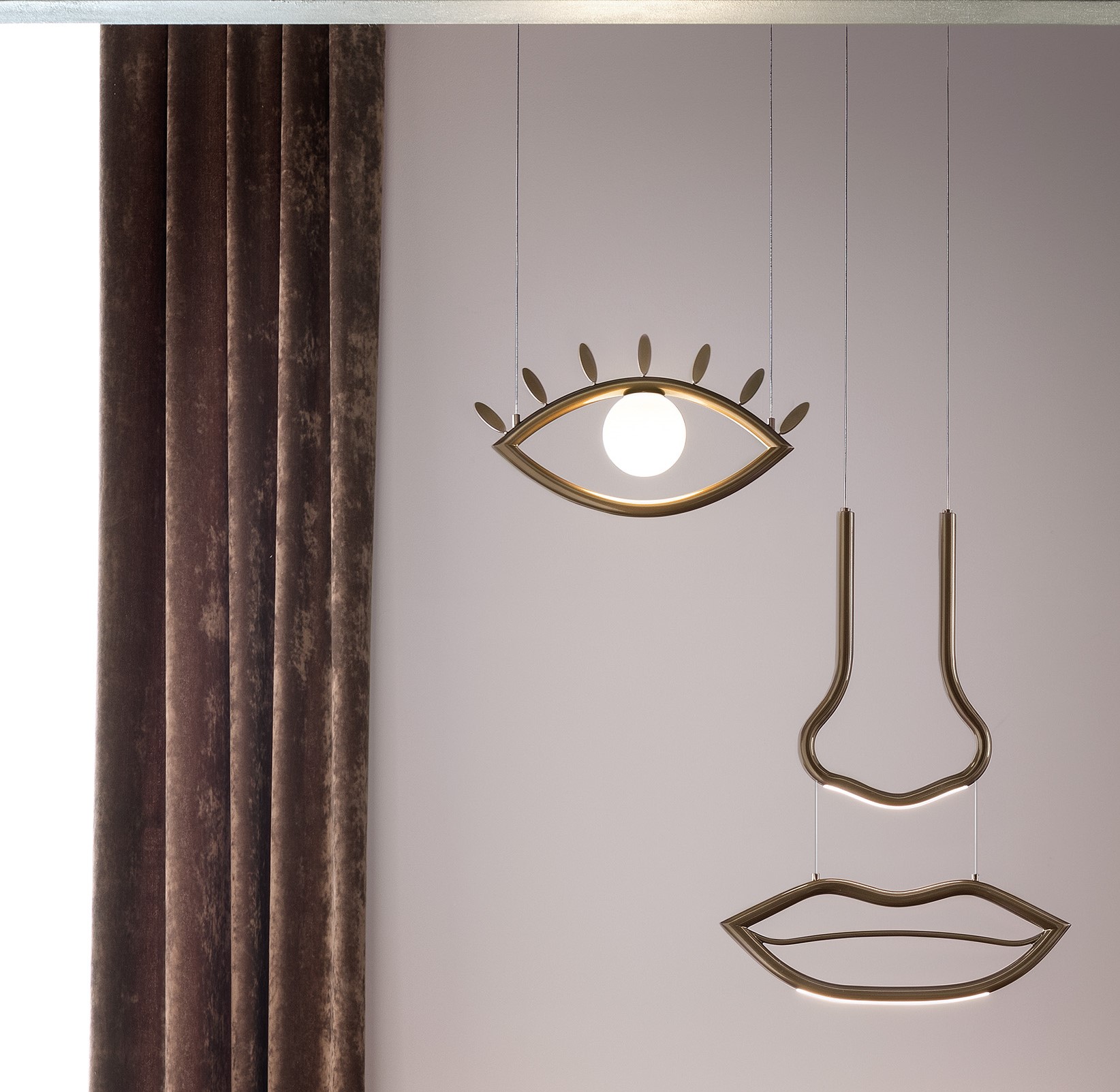 Die Visio Reihe umfasst Tisch-, Steh-, Wand-, Decken- und Hängeleuchten die verschiedene Elemente der menschlichen Mimik und der Sinne abbilden.
